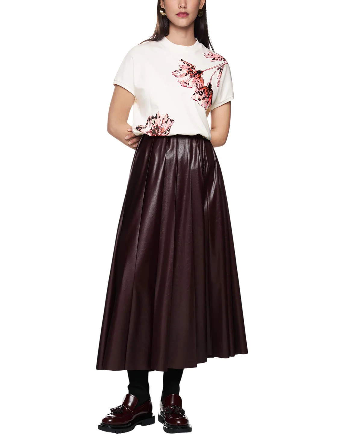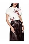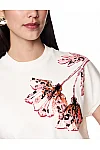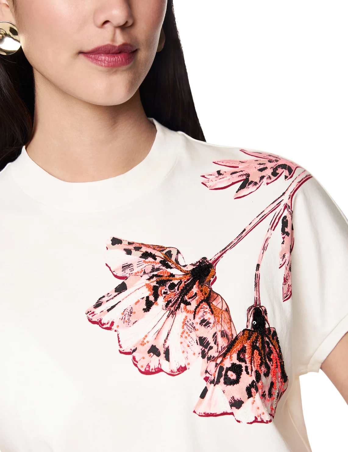Футболка виготовлена зі 100% бавовни високої якості. Модель виконана в прямому крої. Має круглий виріз горловини та короткі рукави з манжетами. Декорована квітковим принтом і бісером.