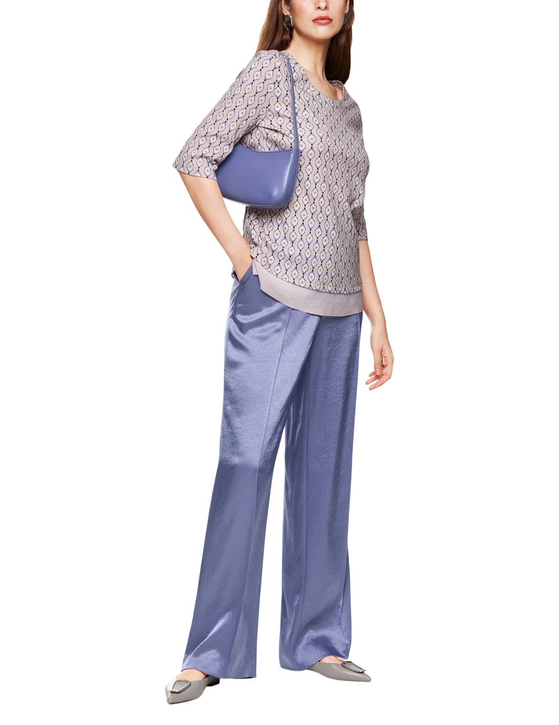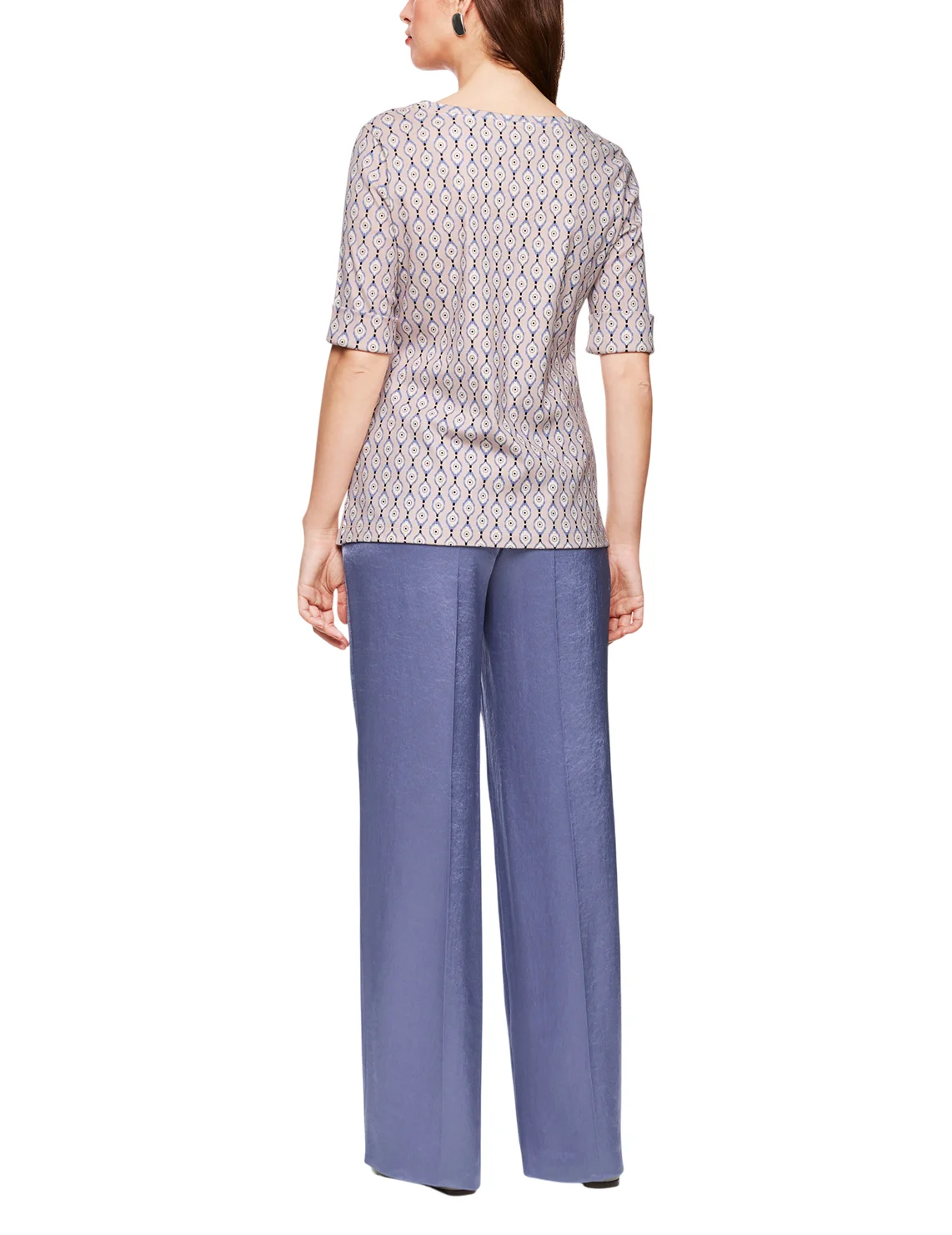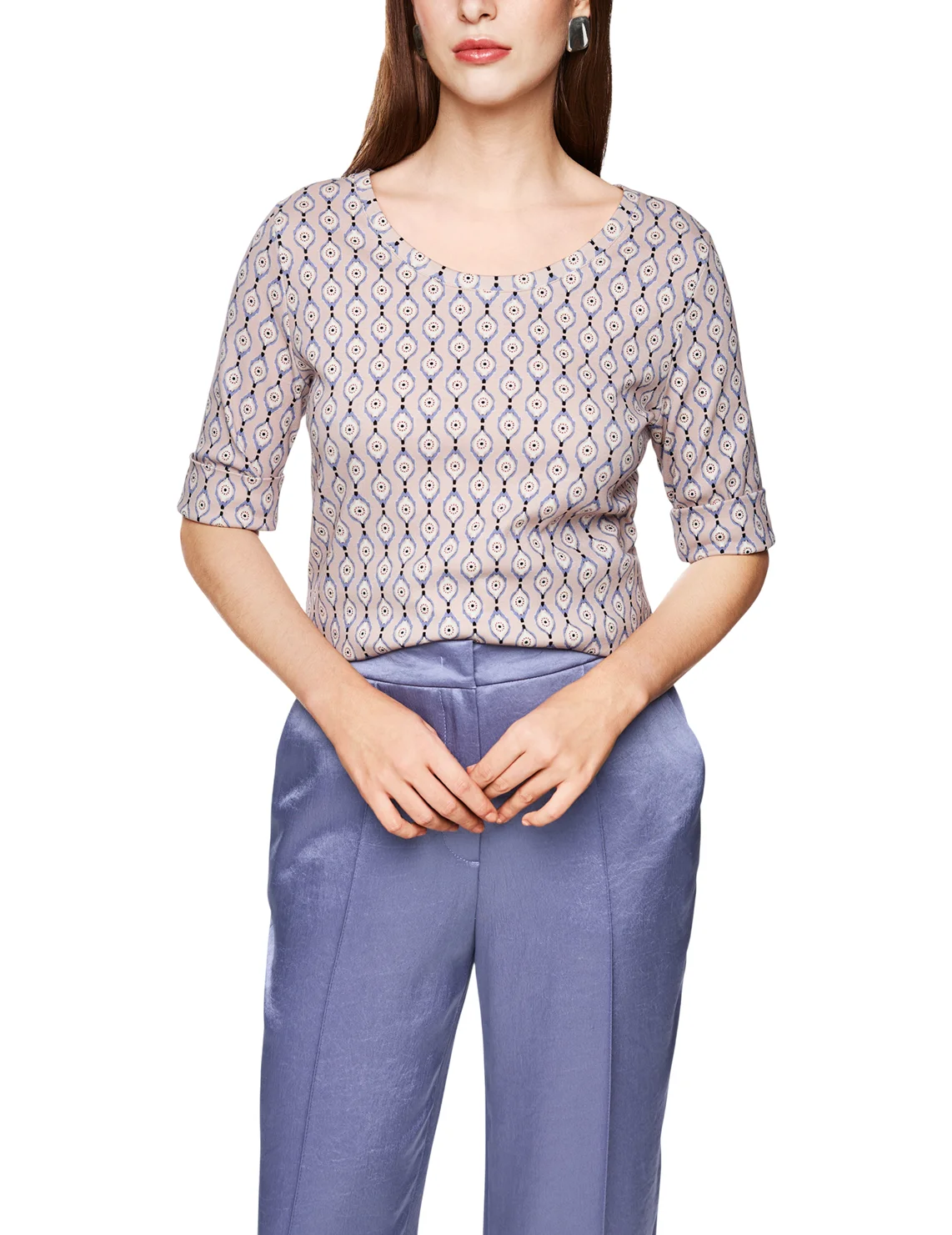 Футболка виготовлена з бавовни та еластану. Модель виконана в прямому крої. Має круглий виріз горловини, розрізи та короткі рукави з відворотами. Декорована оригінальним принтом.