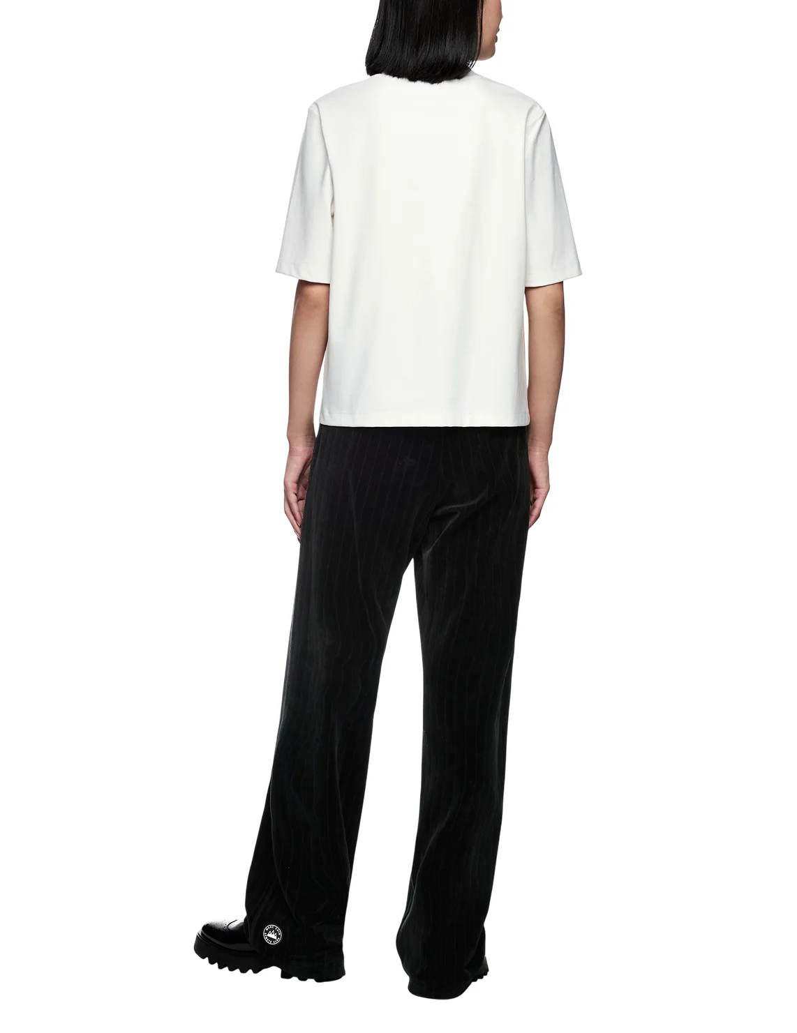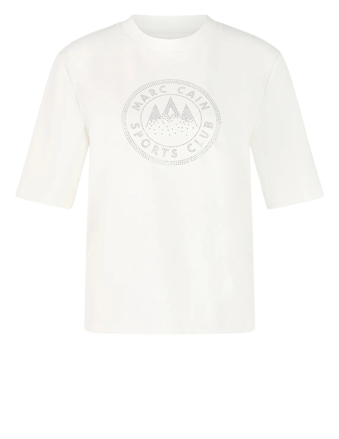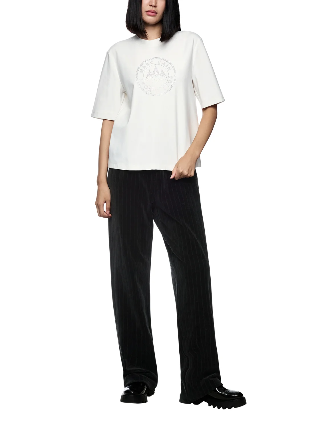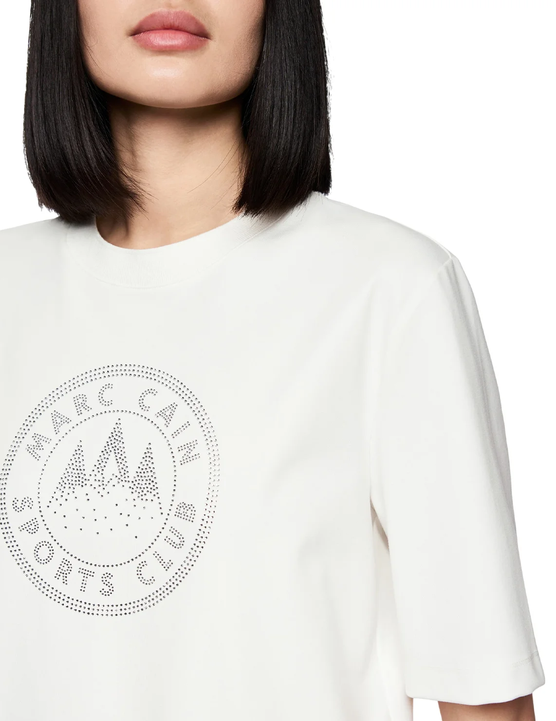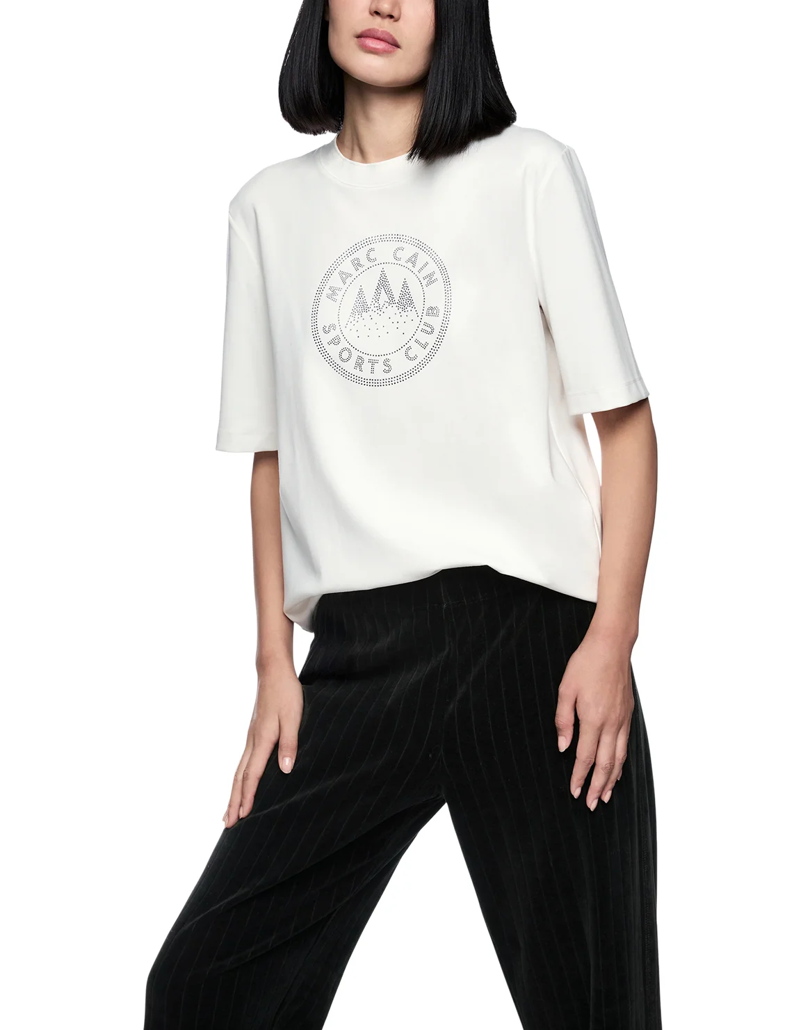 Футболка виготовлена з бавовни, модалу й еластану. Модель виконана у вільному крої. Має круглий виріз горловини та короткі рукави. Декорована оригінальним принтом і стразами.