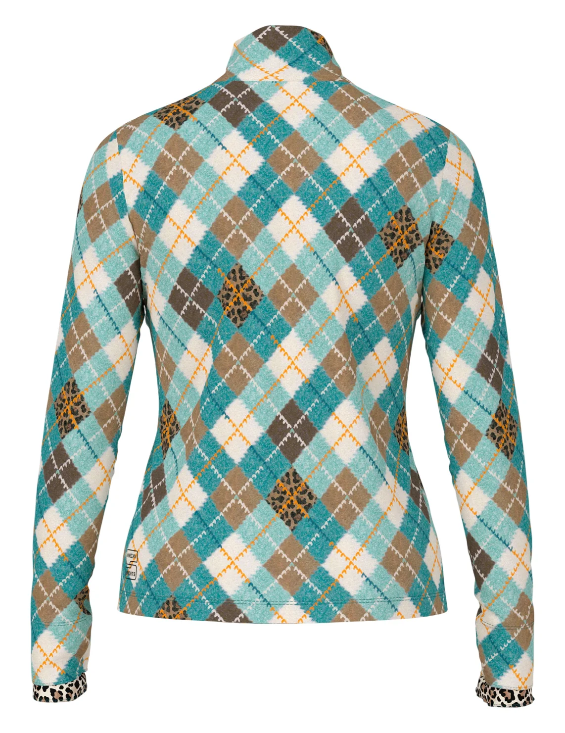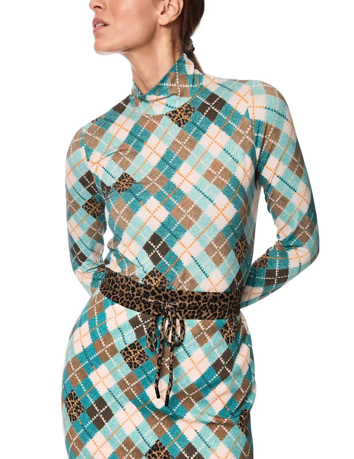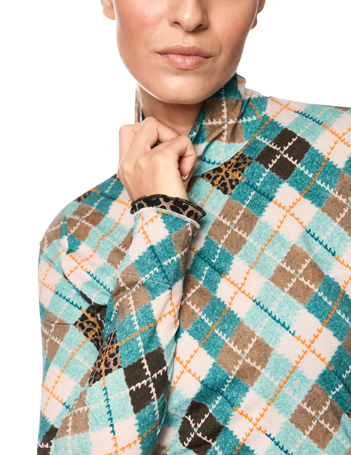 Гольф виготовлений із поліаміду й еластану. Модель виконана в приталеному крої. Має комір-стійку та довгі рукави з манжетами. Декорований геометричним принтом.