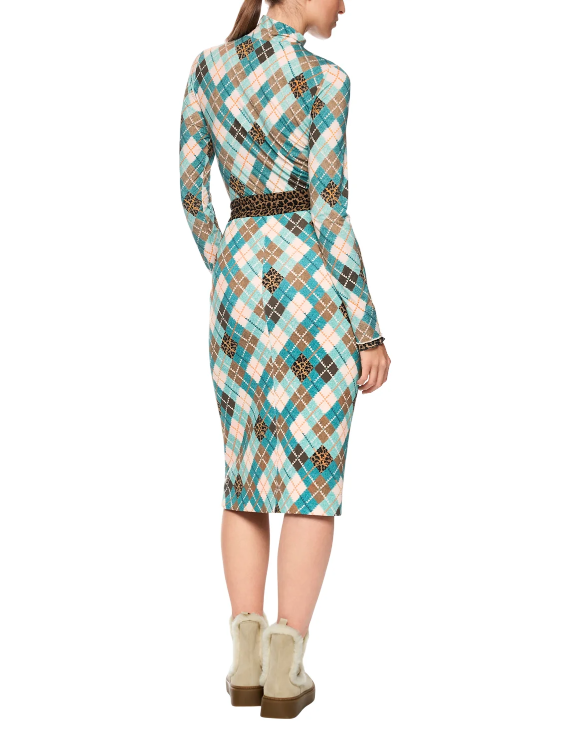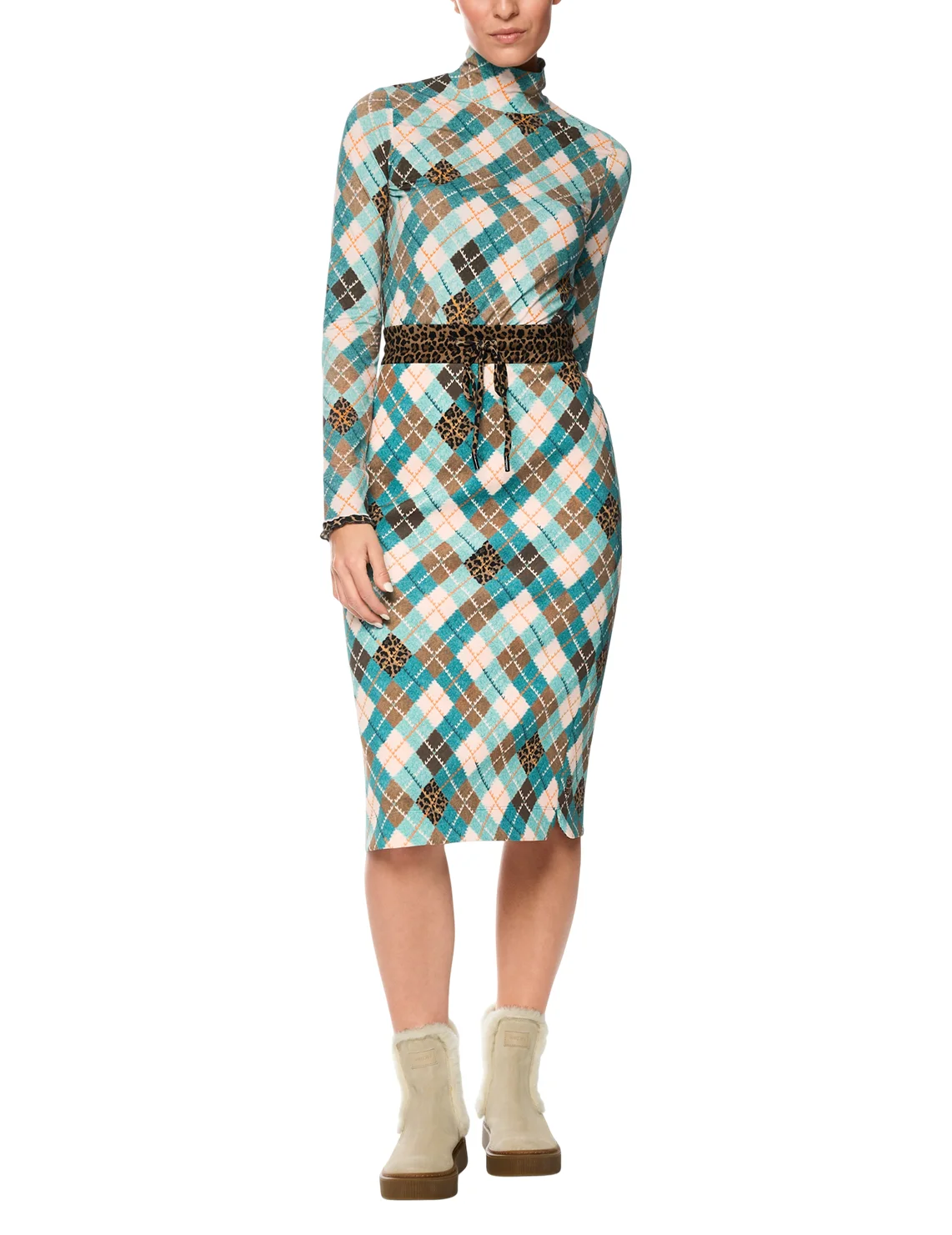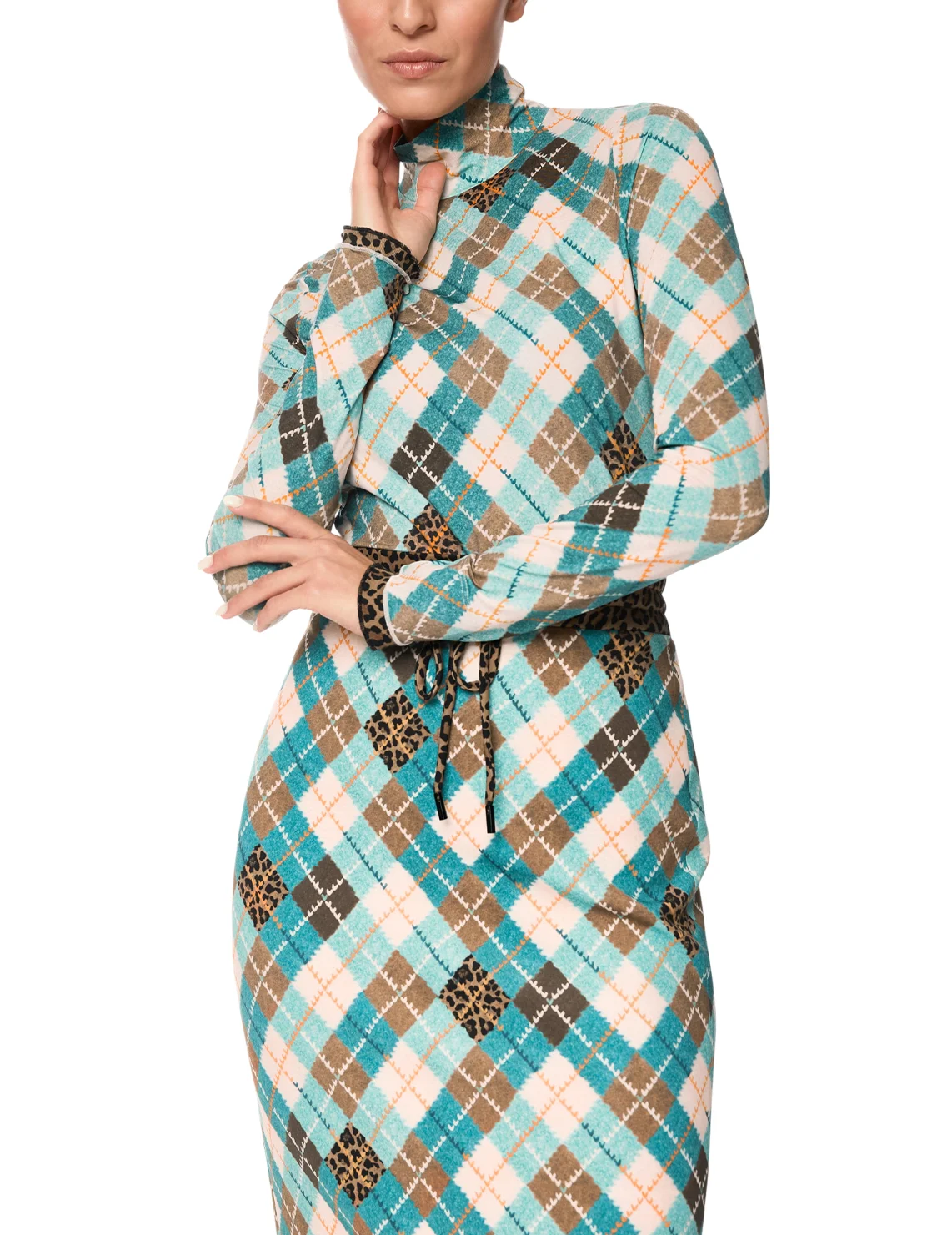 Гольф виготовлений із поліаміду й еластану. Модель виконана в приталеному крої. Має комір-стійку та довгі рукави з манжетами. Декорований геометричним принтом.