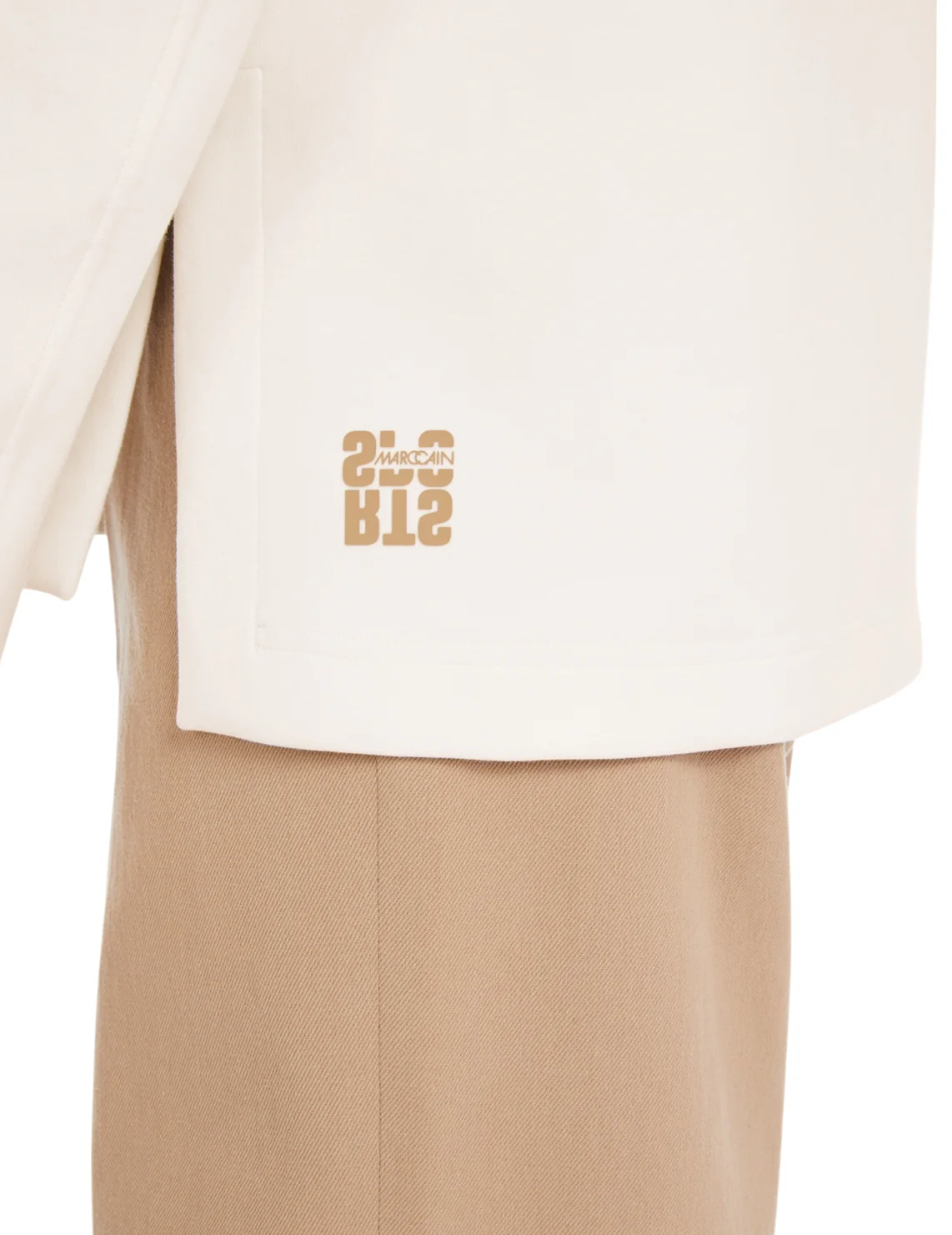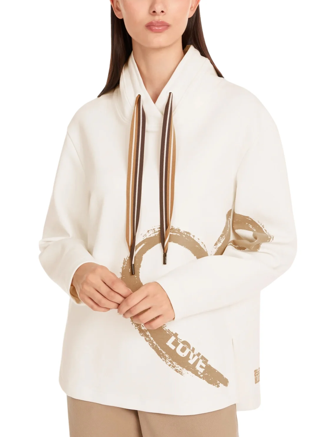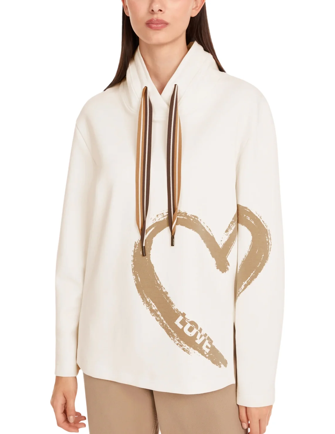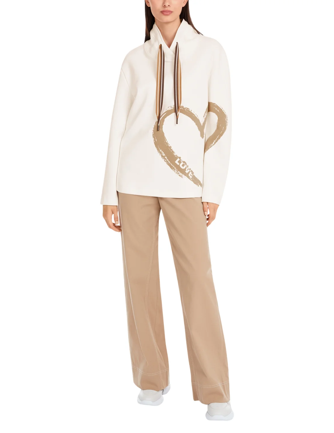 Худі виготовлено з бавовни, поліестеру та еластану. Модель прямого крою. Має комір-стійку з куліскою, довгі рукави та бічні розрізи на подолі. Декоровано принтом у вигляді серця і напису.