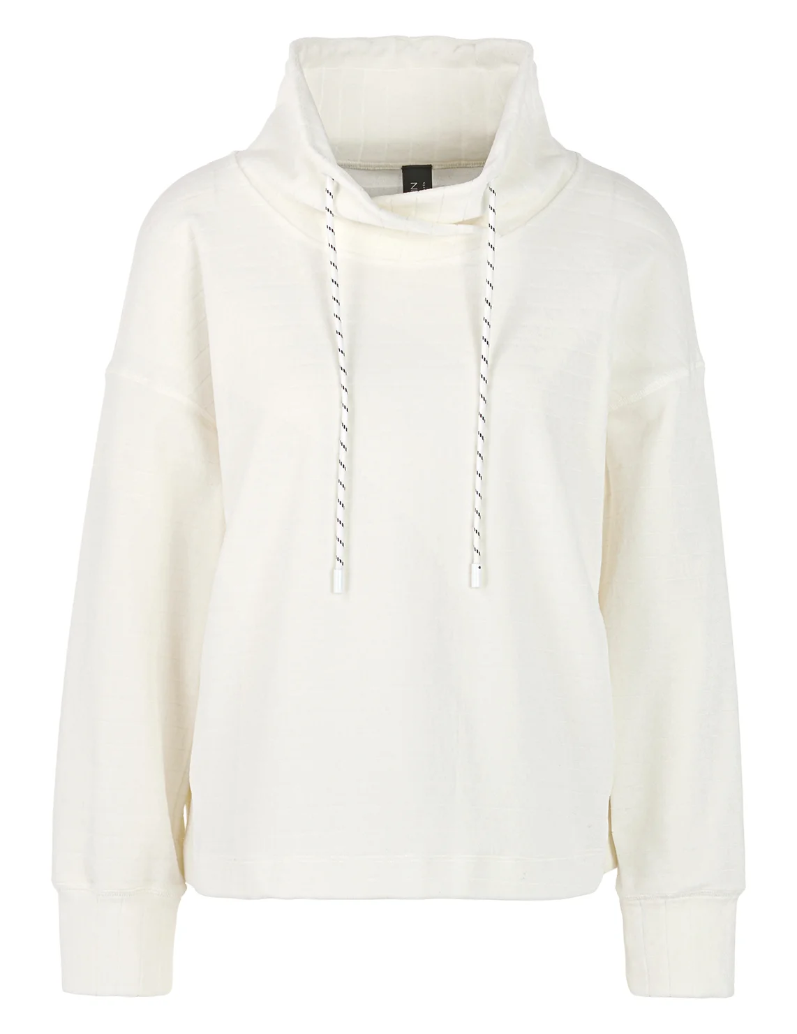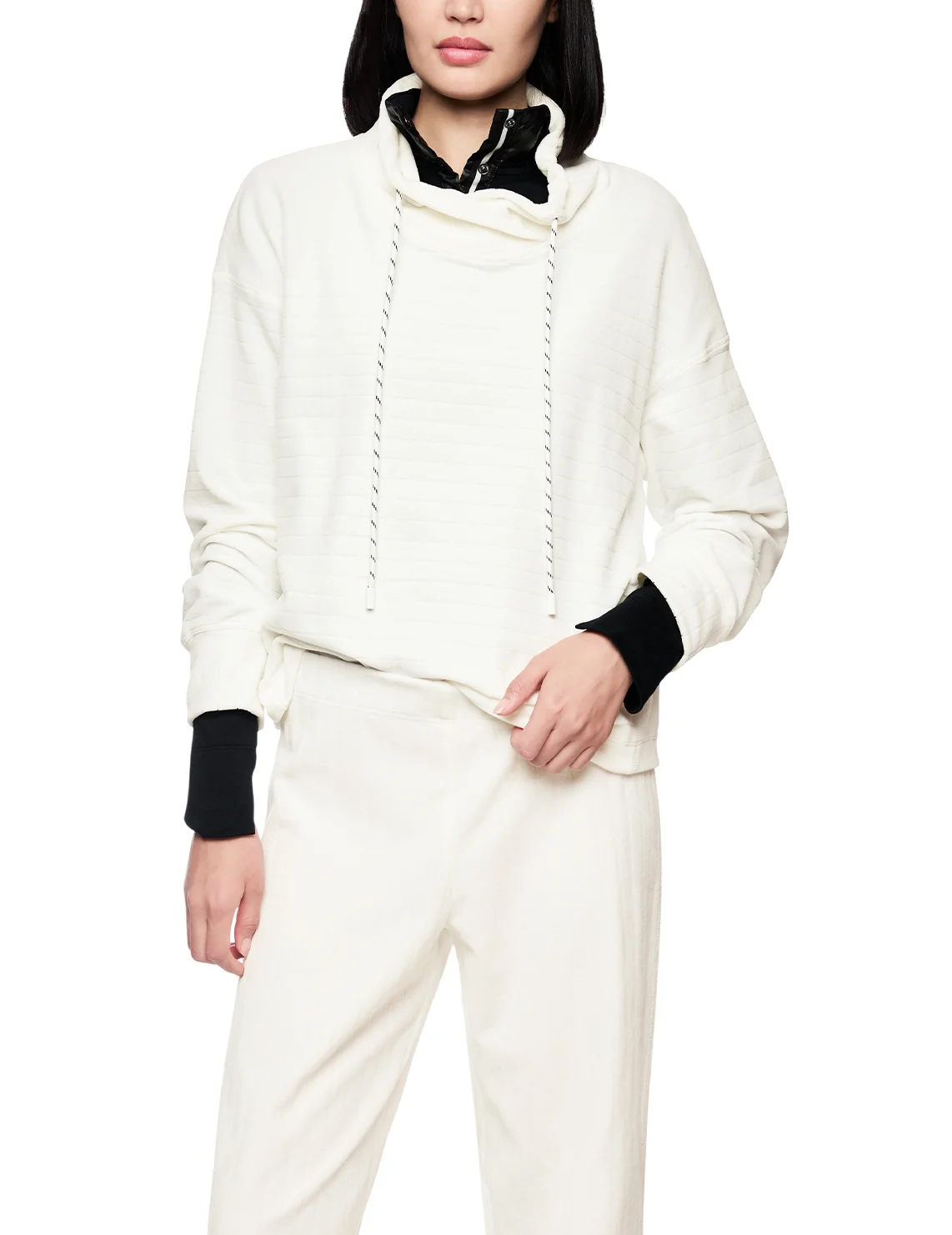 Худі виготовлено з бавовни, поліаміду та еластану. Модель виконана в прямому крої. Має комір-стійку, занижену плечову лінію, куліску та довгі рукави з манжетами.