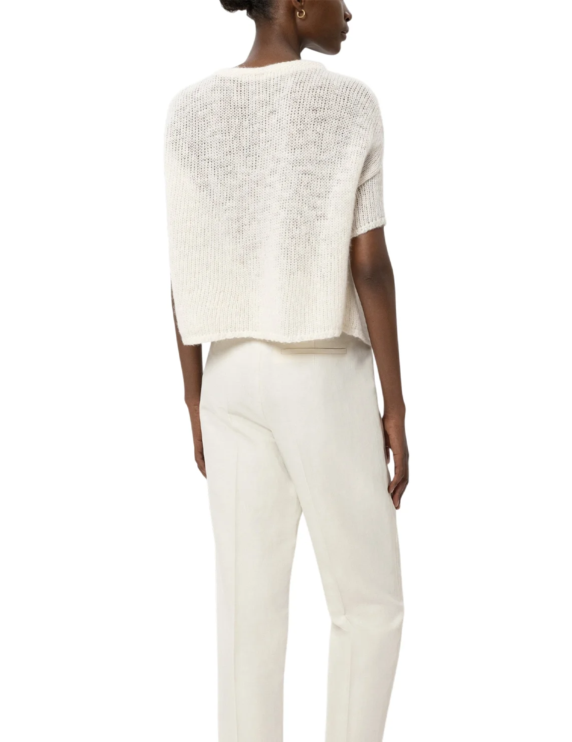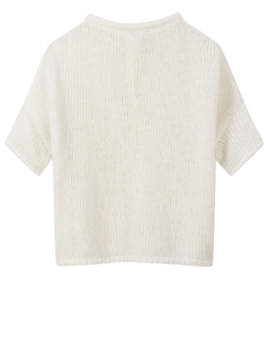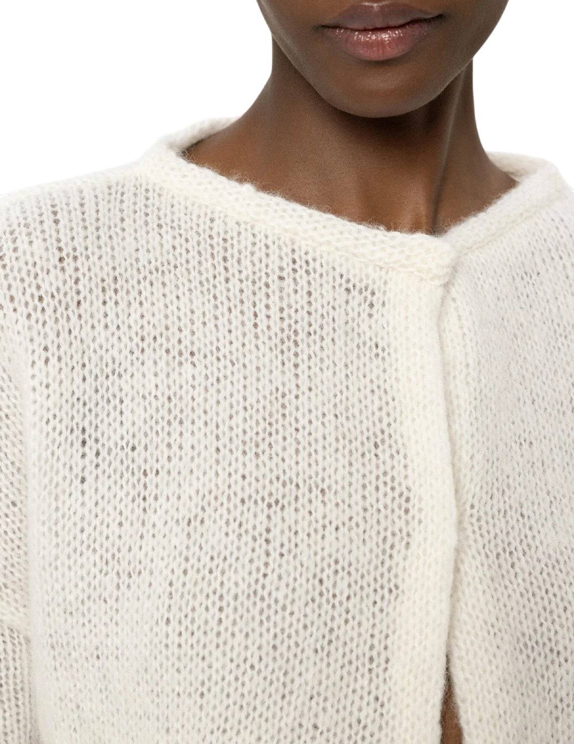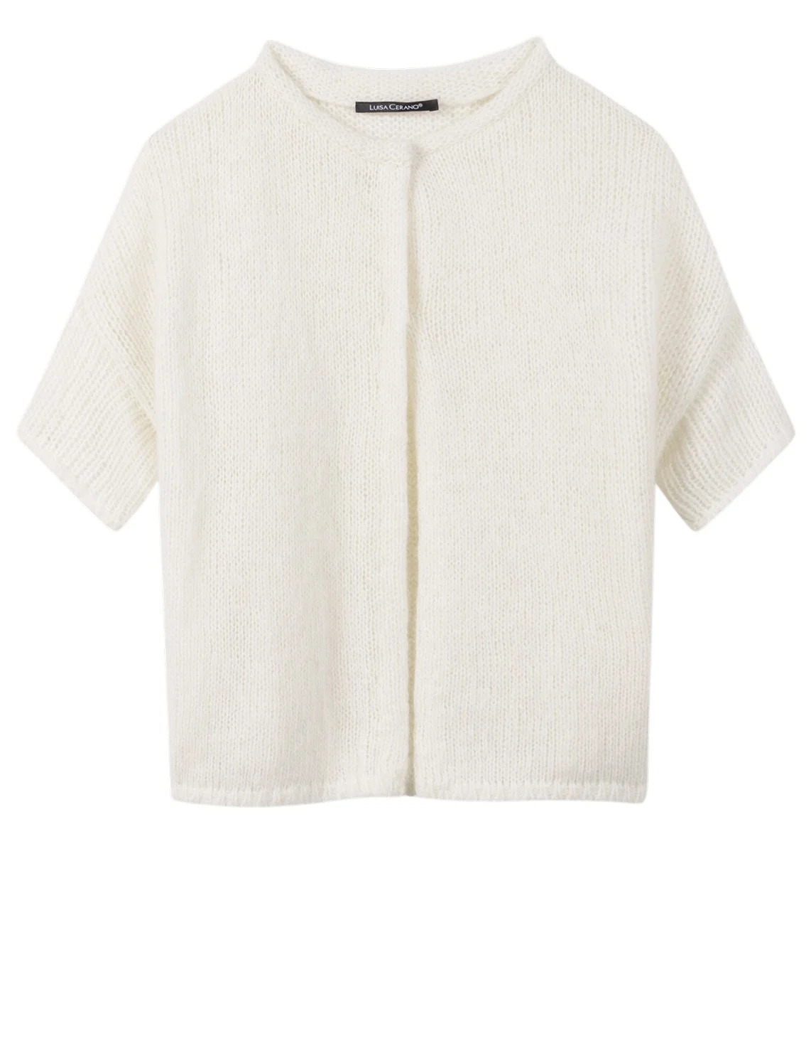 Кардиган виготовлений із поліаміду, альпаки та вовни. Модель виконана у вільному крої. Має круглий виріз горловини, занижену плечову лінію та короткі рукави. Застібається на три кнопки спереду.