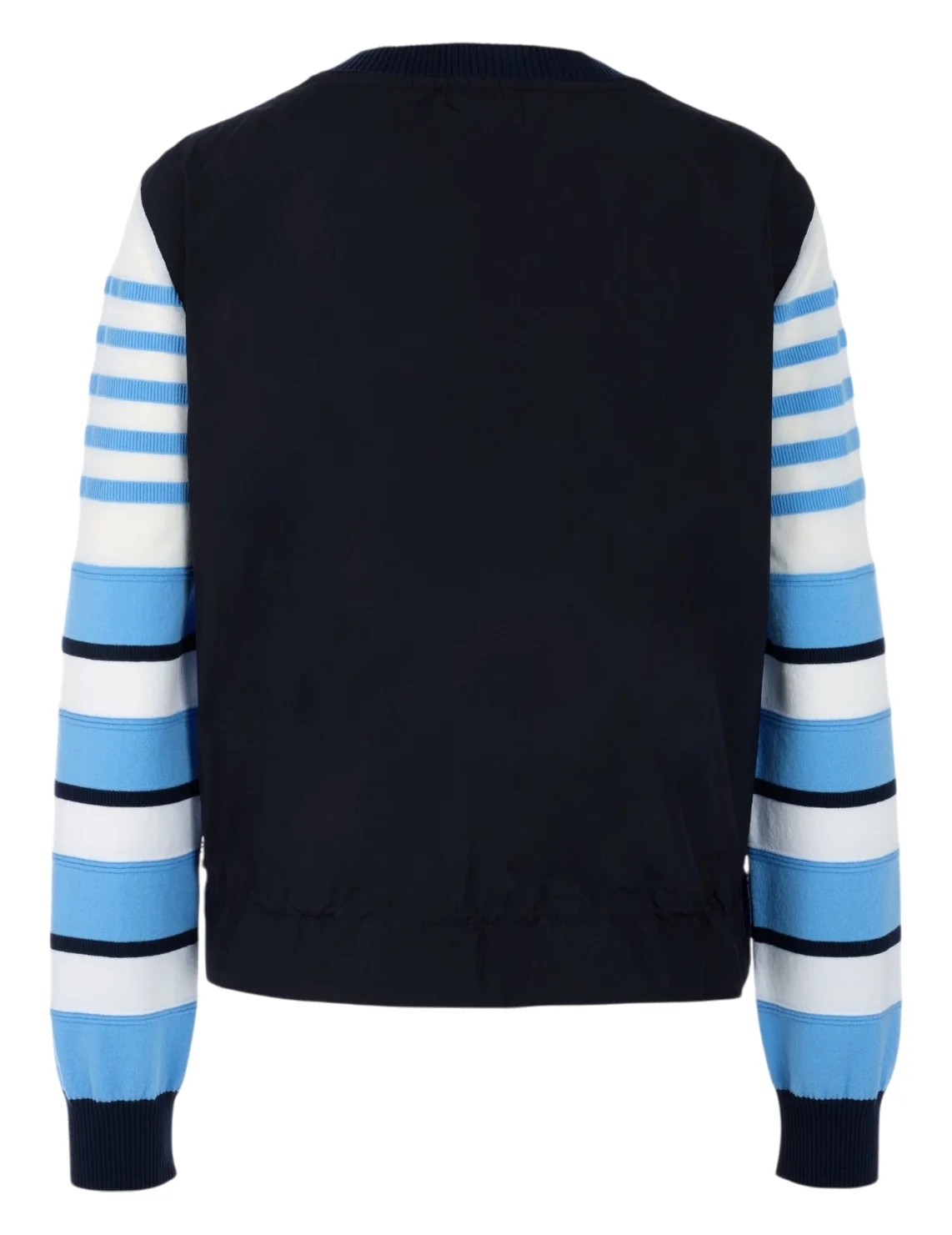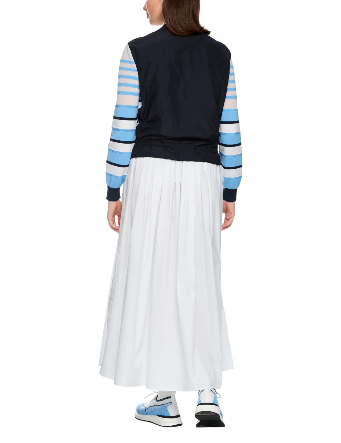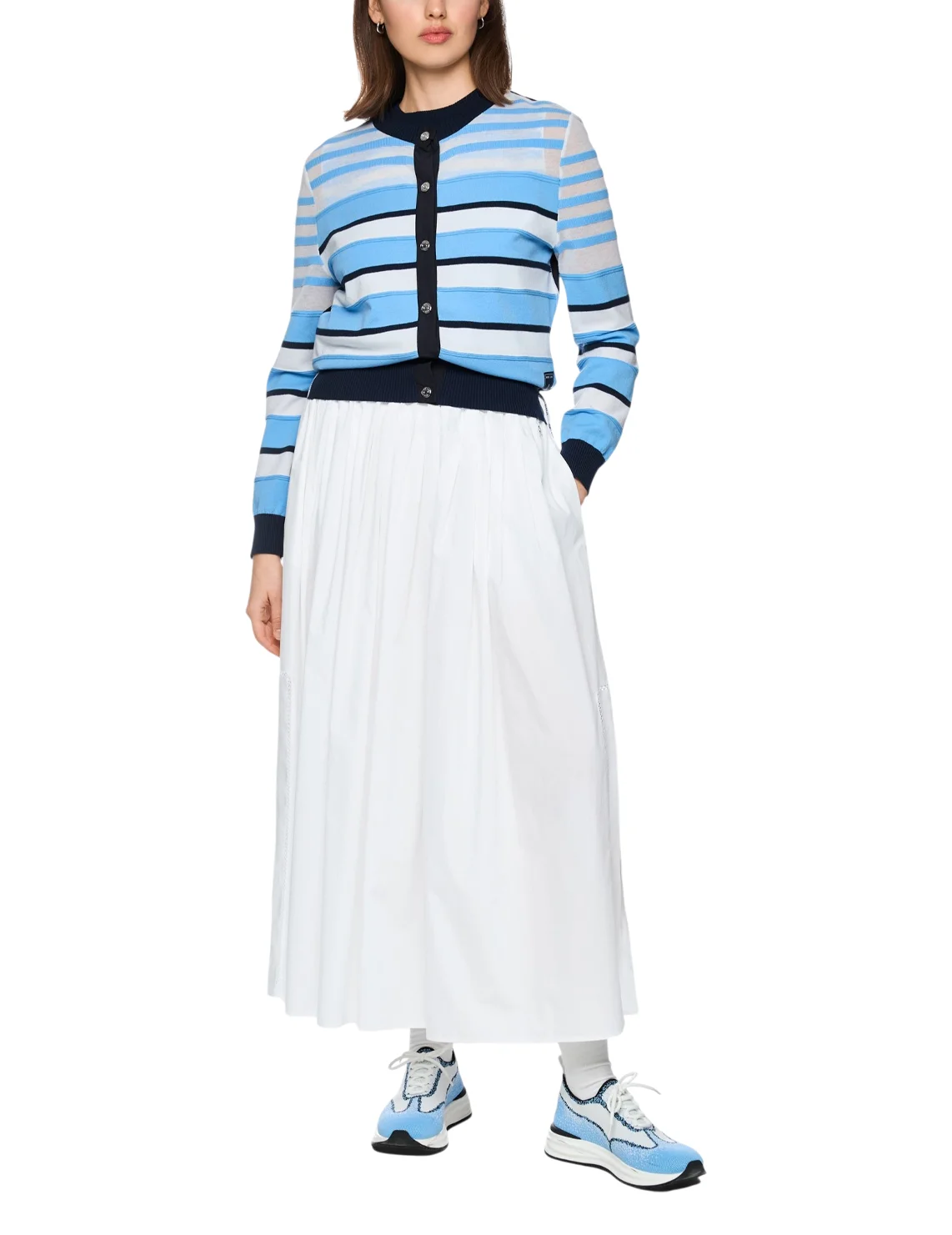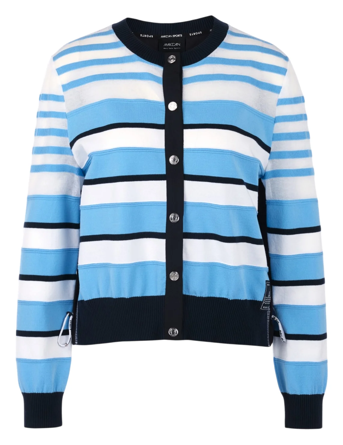 Кардиган виготовлений з ліоцелу, поліестеру, бавовни та поліаміду. Модель виконана в прямому крої. Має круглий виріз горловини, довгі рукави з манжетами, куліску на подолі. Застібається на кнопки. Декорований смугастим принтом.