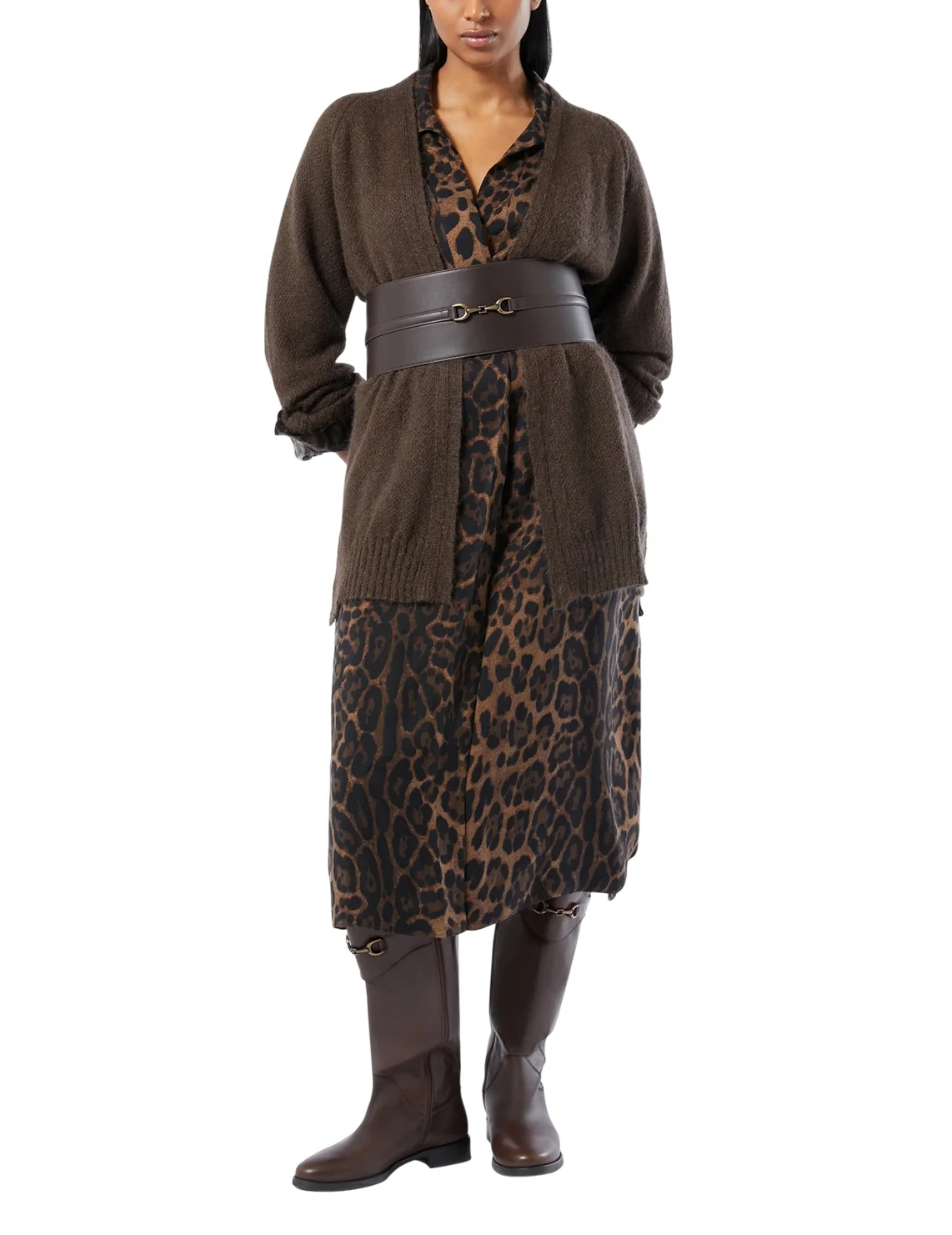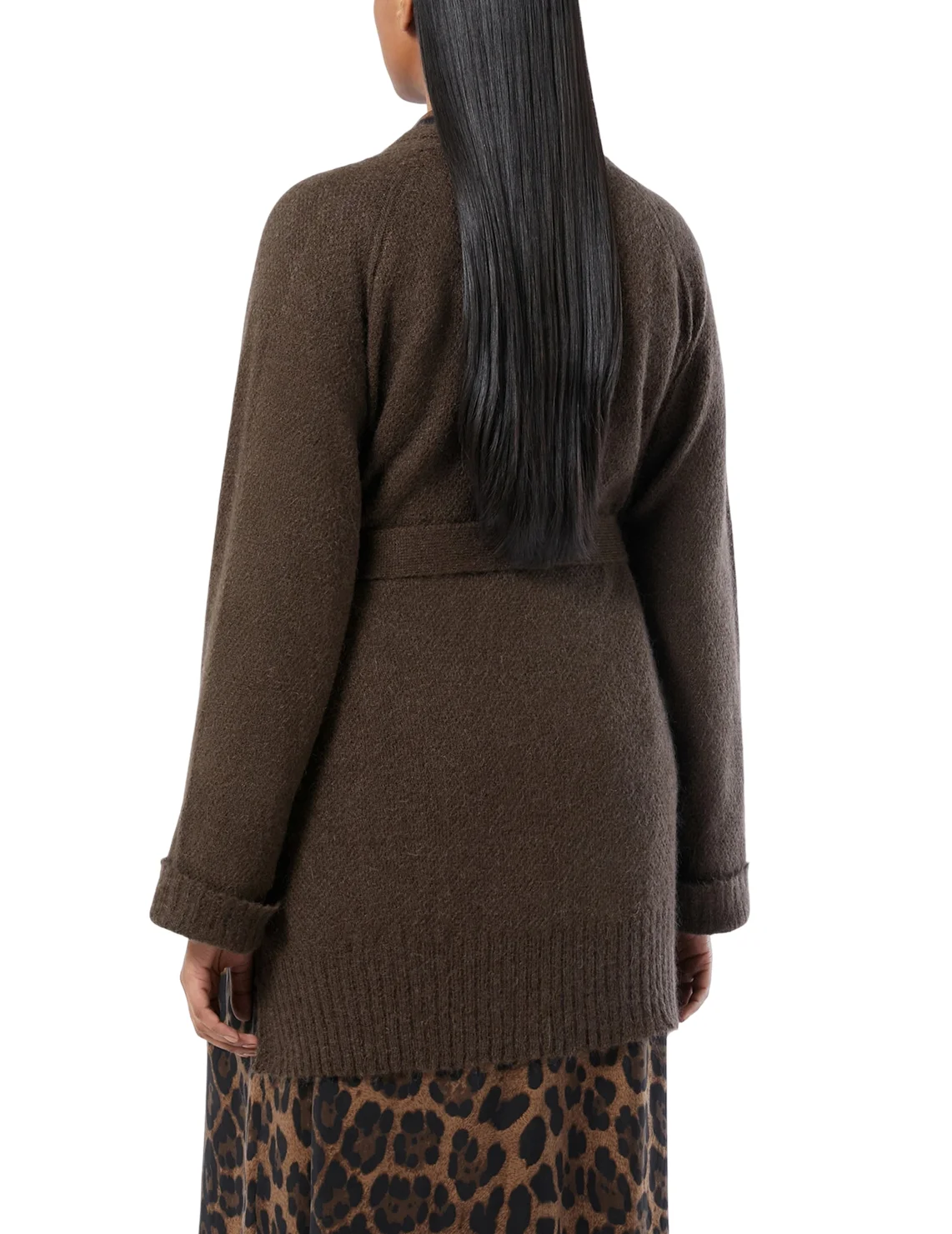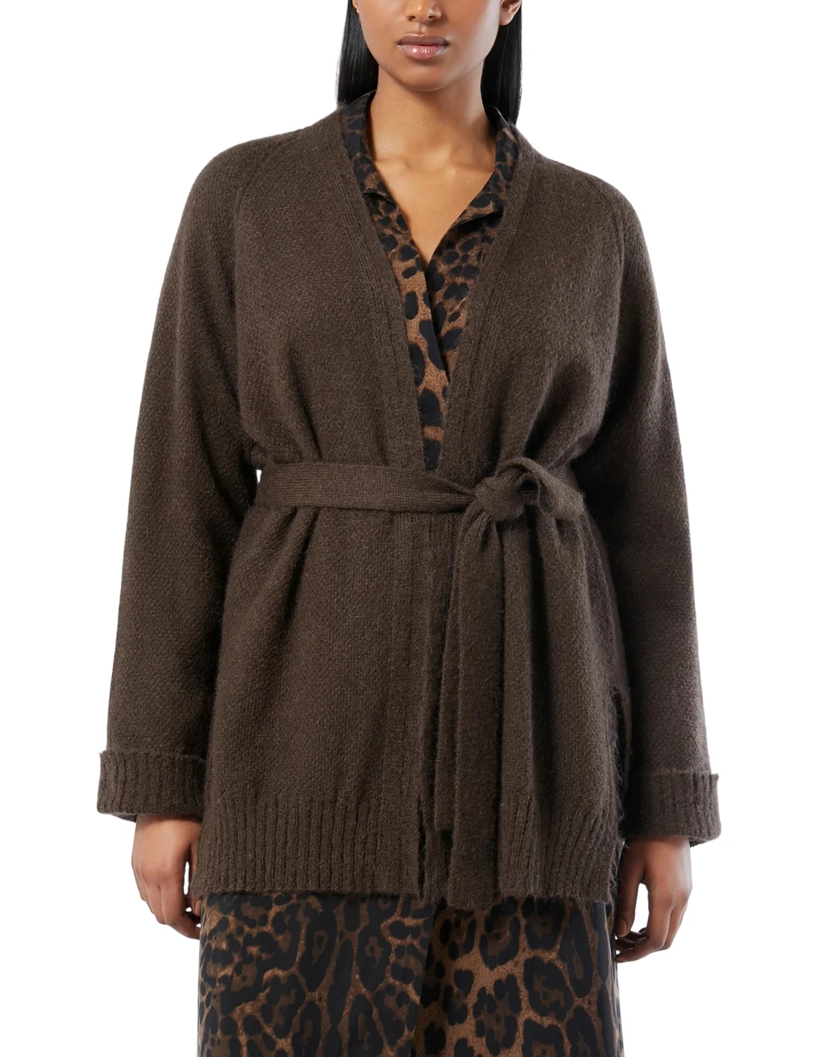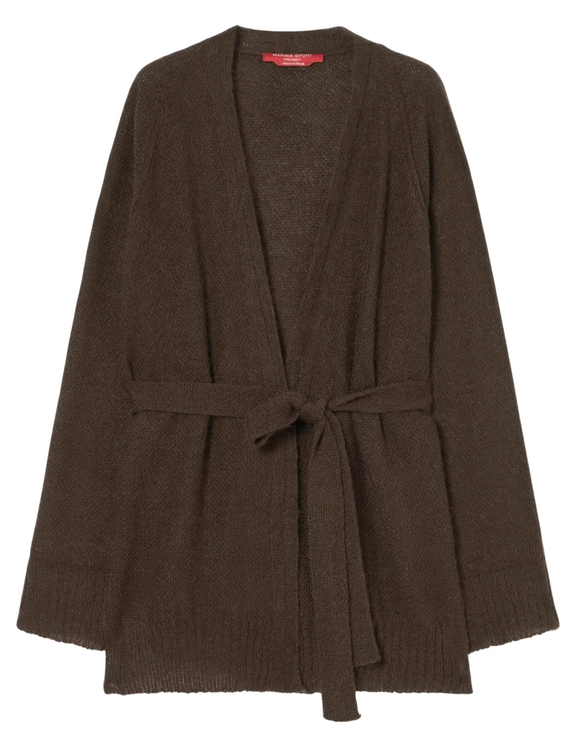 Кардиган виготовлений з акрилу, поліаміду та мохеру. Модель виконана в прямому крої. Має V-подібний виріз горловини, довгі рукави з відворотами та тканинний пояс у тон.