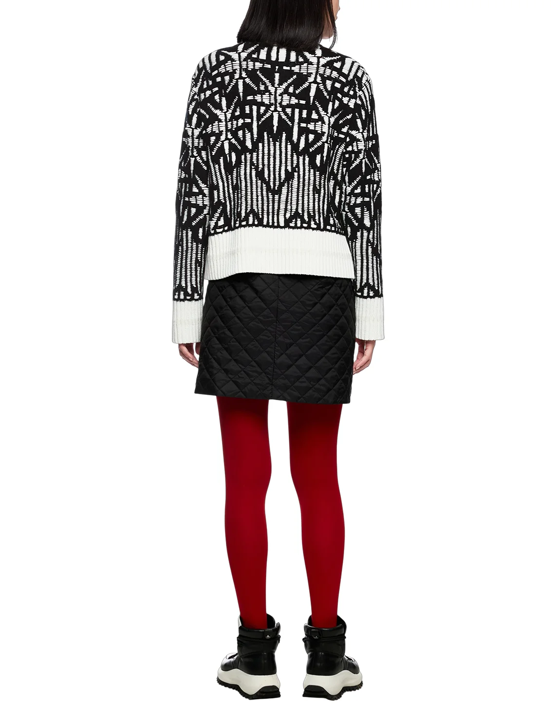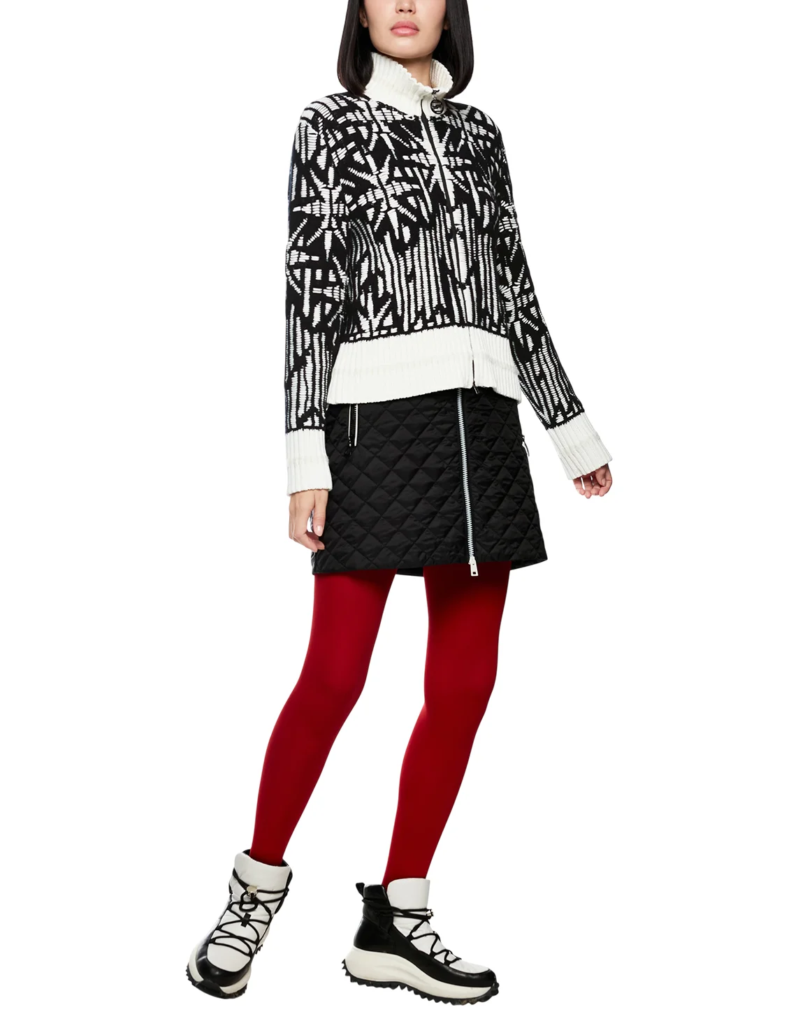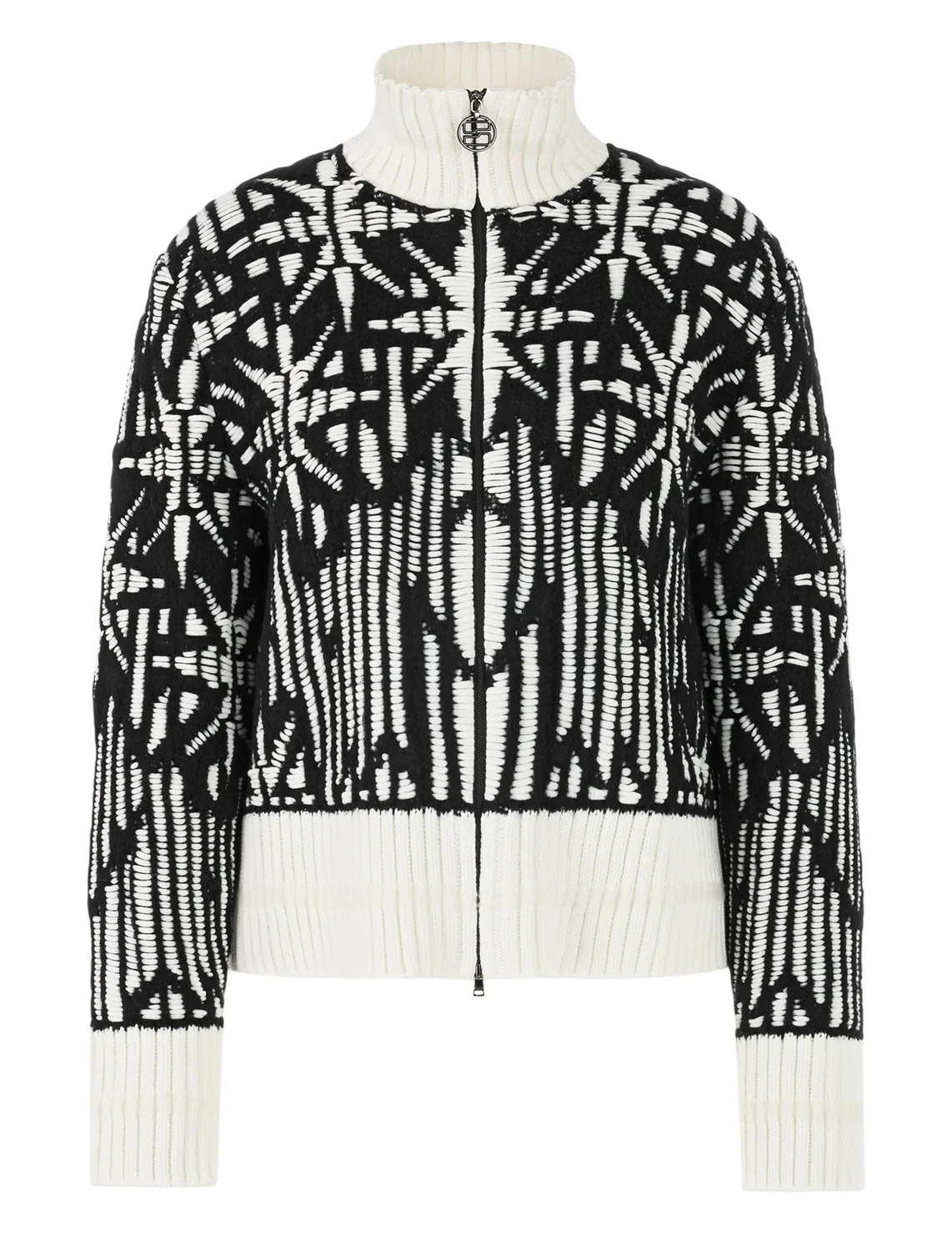 Кардиган виготовлений із бавовни, поліаміду та вовни. Модель виконана в прямому крої. Має комір-стійку, двосторонню застібку на блискавці та довгі рукави з манжетами. Декорований оригінальним візерунком.