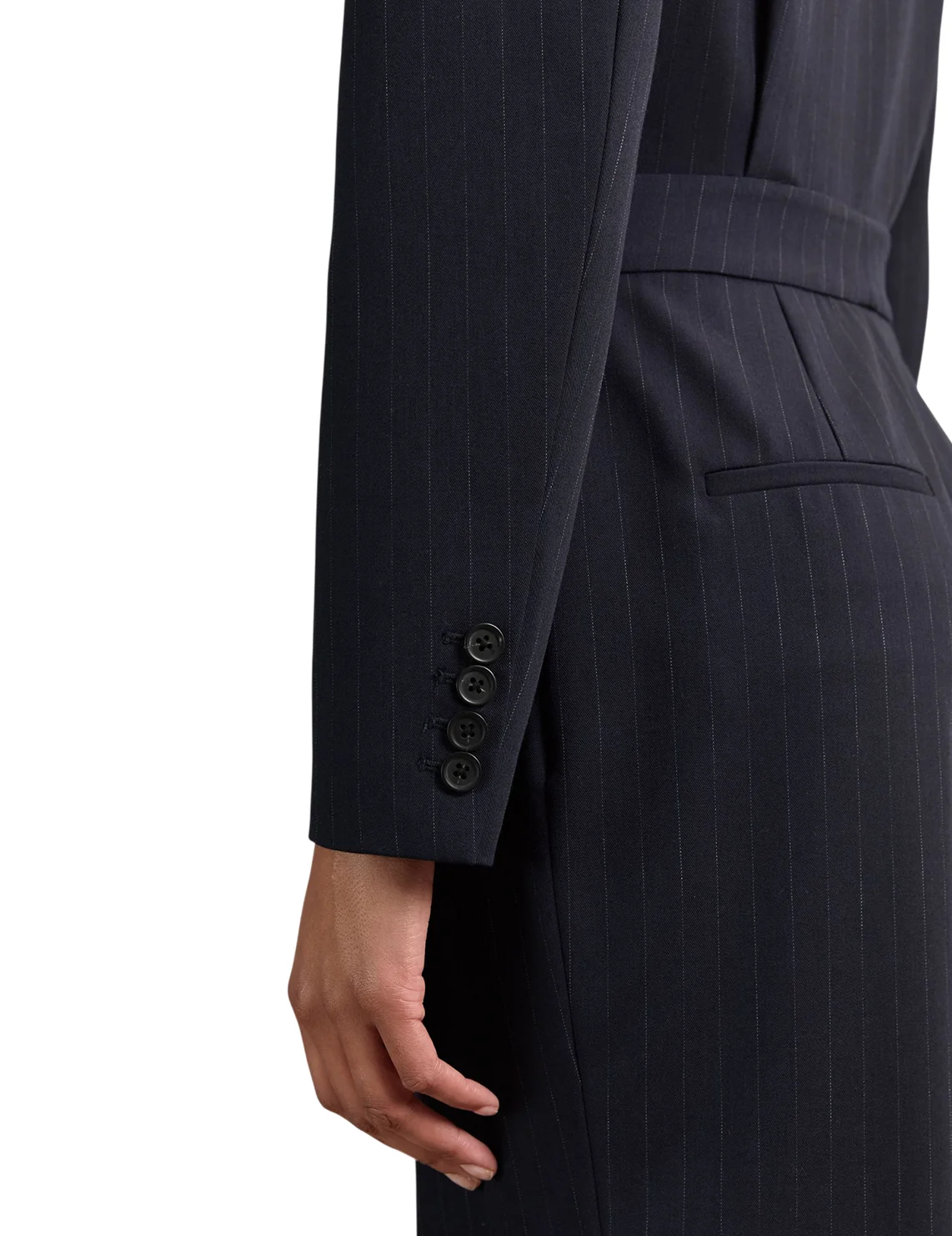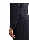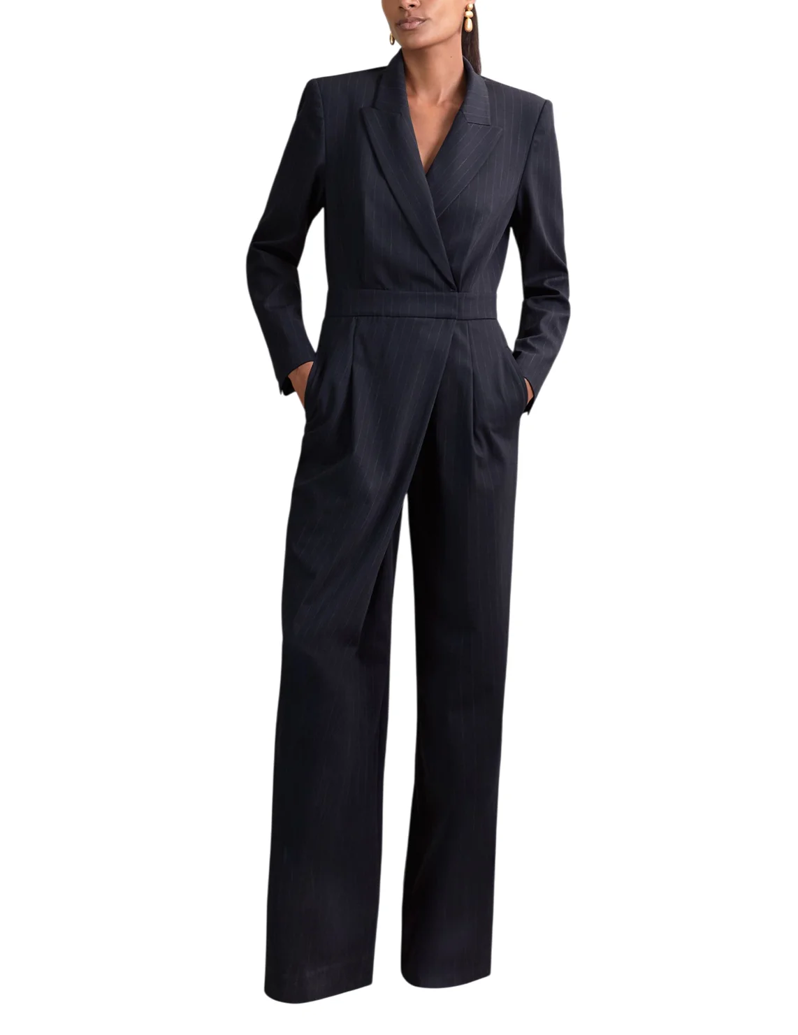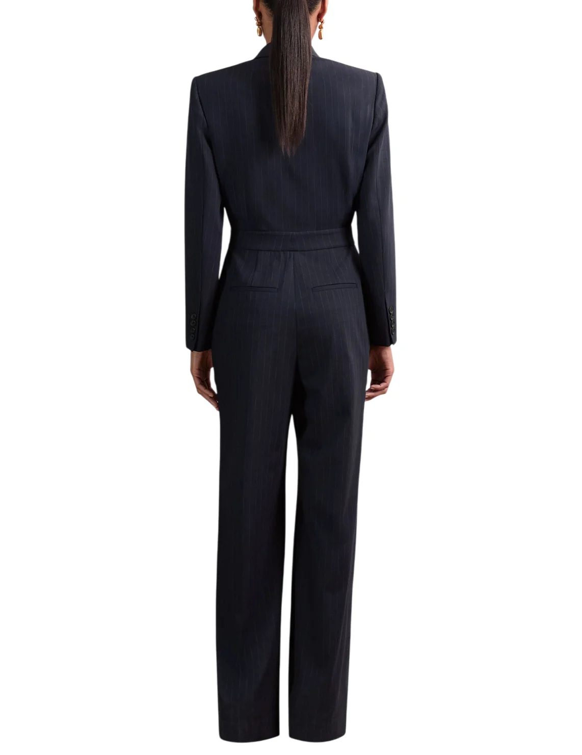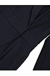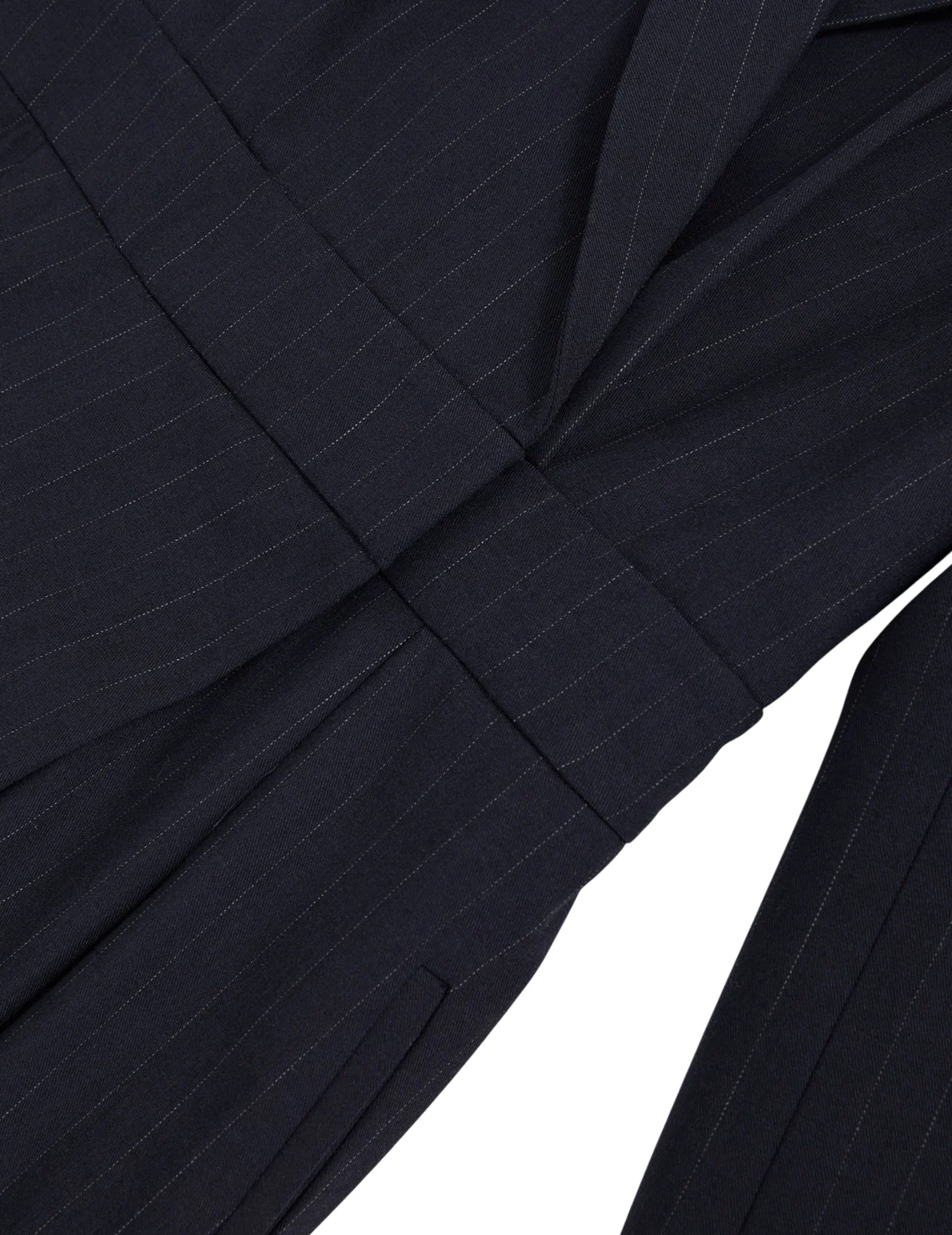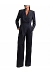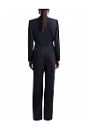 Комбінезон виготовлений з поліестеру, вовни та еластану. Модель виконана в прямому крої. Має відкладний комір з лацканами, довгі рукави, бічні та задні прорізні кишені, широкі штани, застібку на подвійний гачок і блискавку. Декорований принтом у смужку.