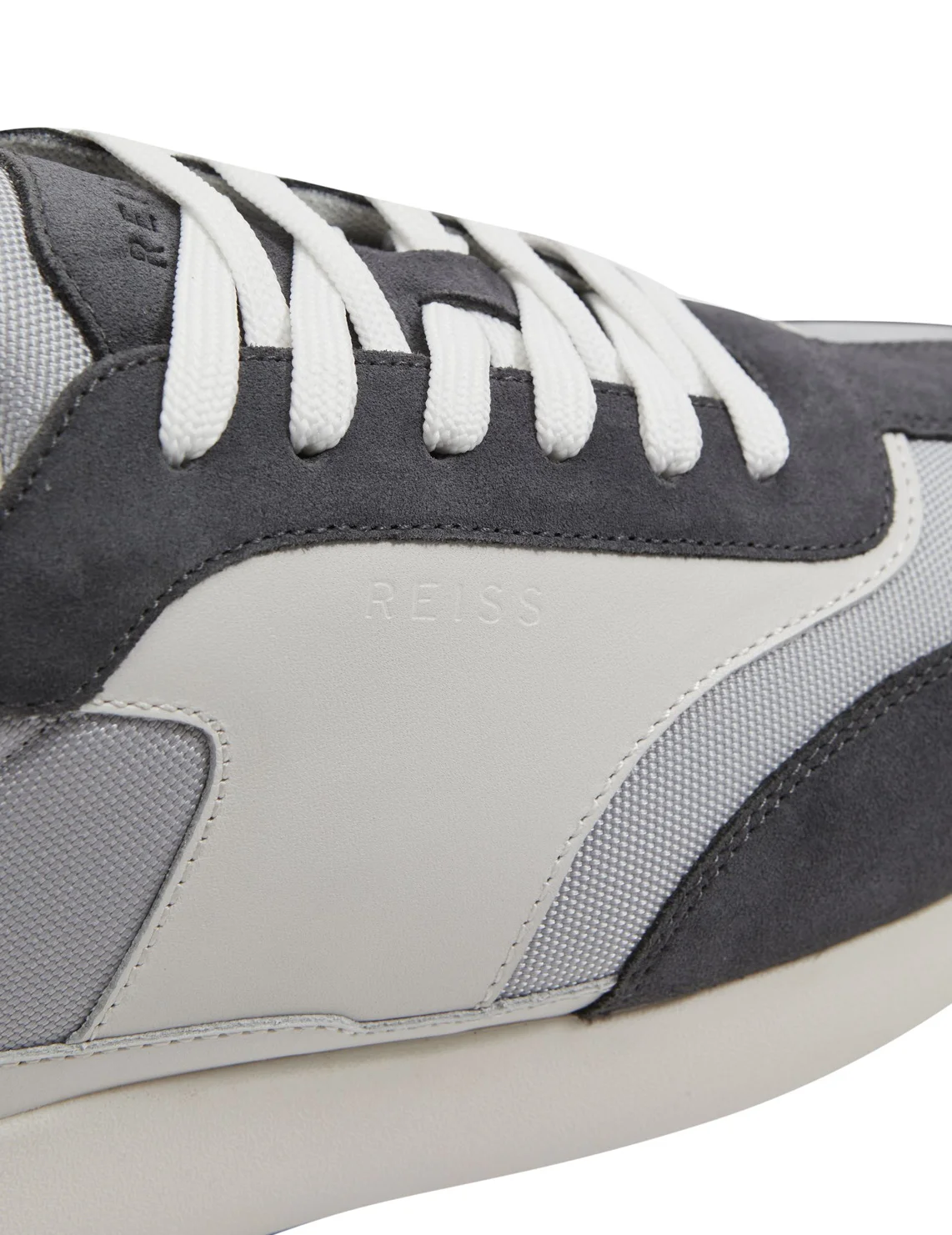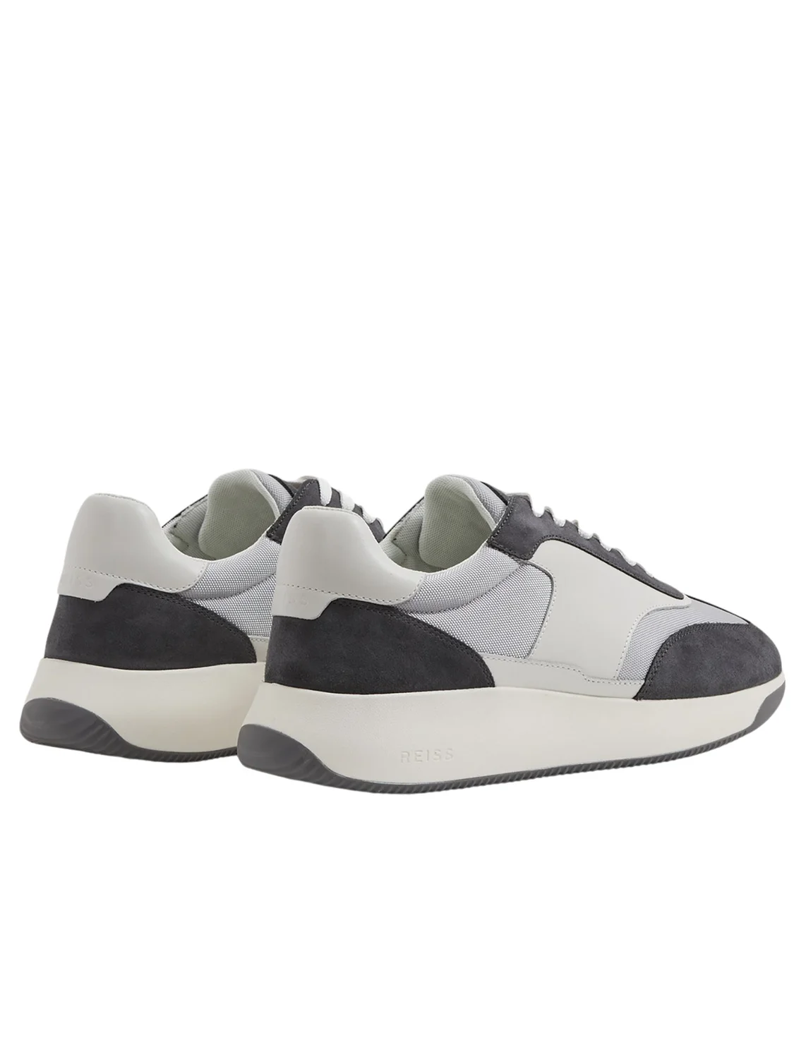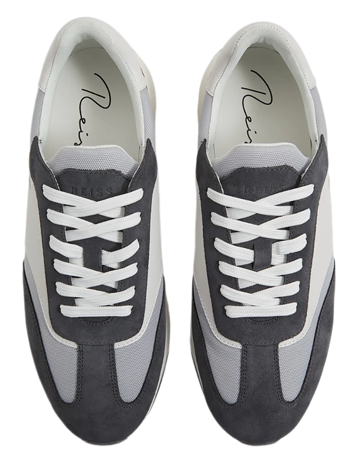 Кросівки Emmett від бренду Reiss виготовлені зі шкіри та поліестеру. Дизайн моделі виконаний у вигляді високої м'якої підошви, контрастних вставок та класичного шнурування.