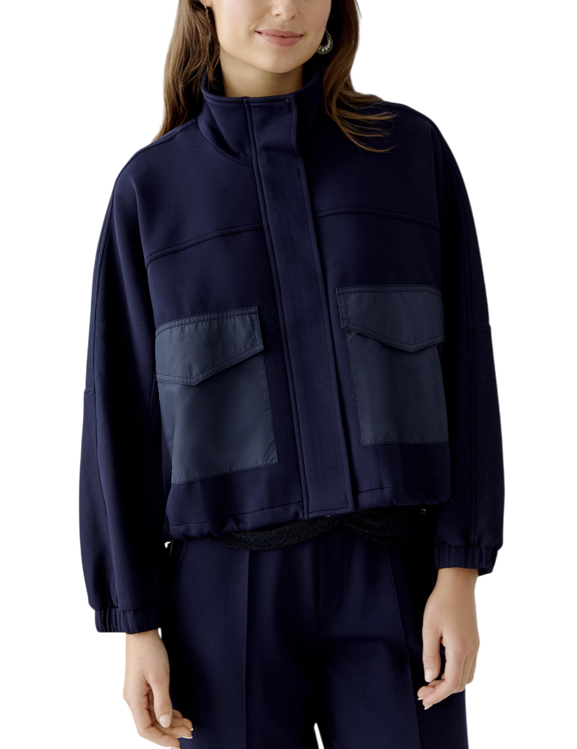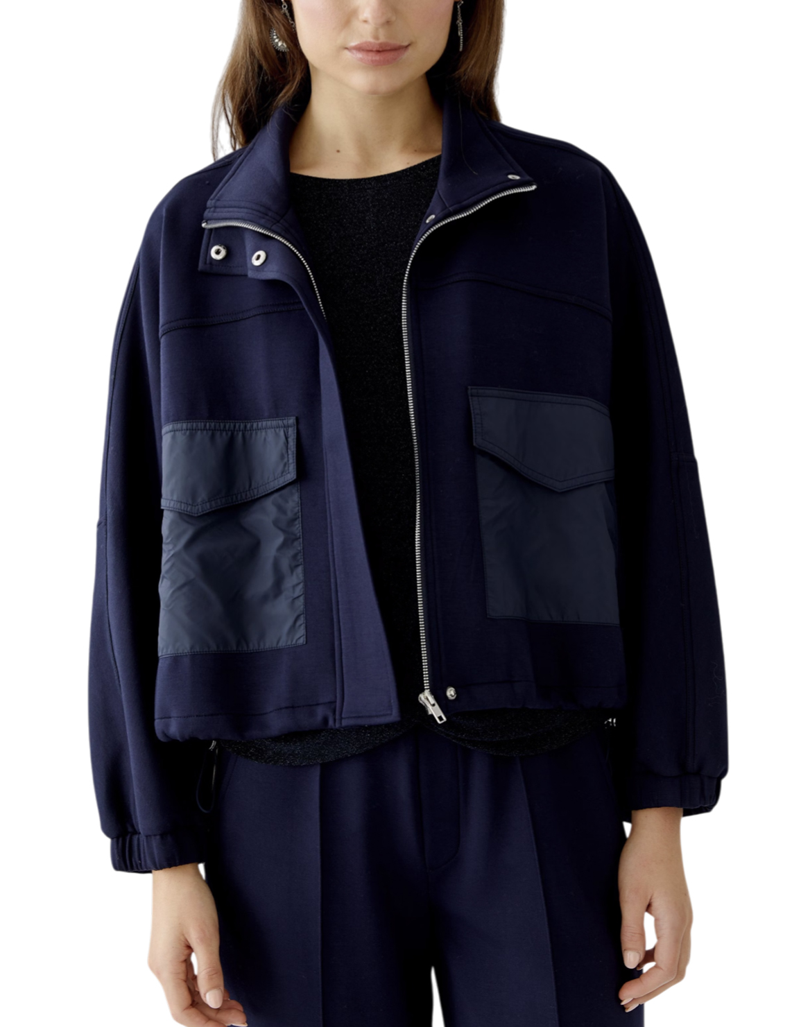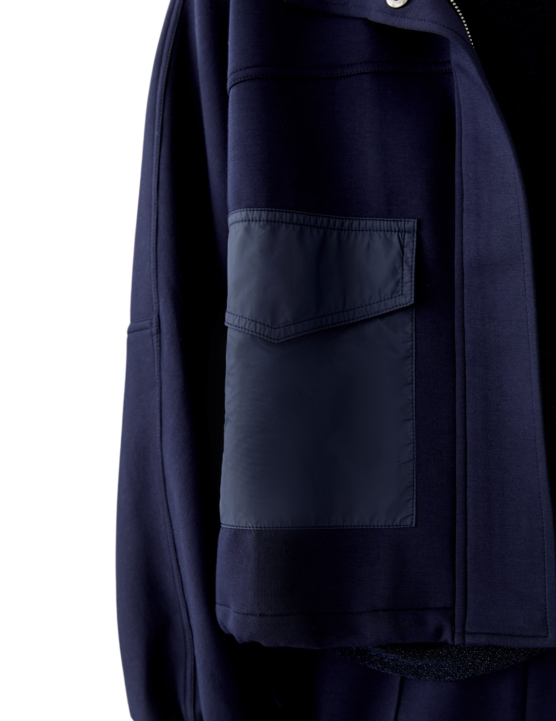 Куртка виготовлена з поліестеру, віскози та еластану. Модель виконана у вільному крої. Має комір-стійку, передні накладні кишені з клапанами, довгі рукави з манжетами, куліску по низу виробу, застібку на блискавці та кнопках.