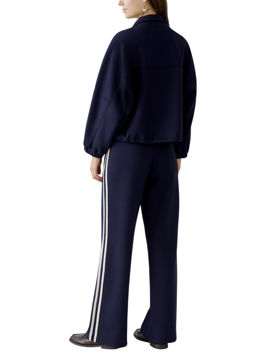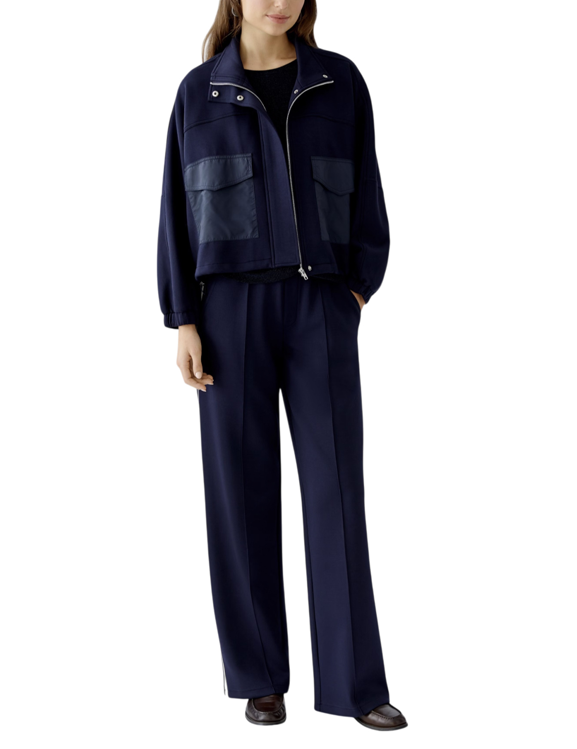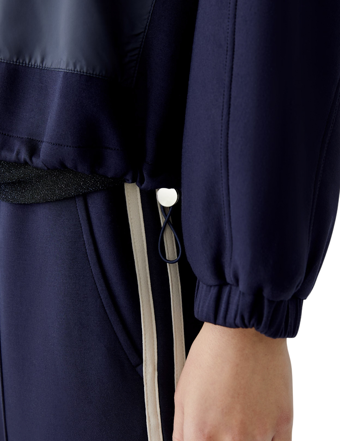 Куртка виготовлена з поліестеру, віскози та еластану. Модель виконана у вільному крої. Має комір-стійку, передні накладні кишені з клапанами, довгі рукави з манжетами, куліску по низу виробу, застібку на блискавці та кнопках.