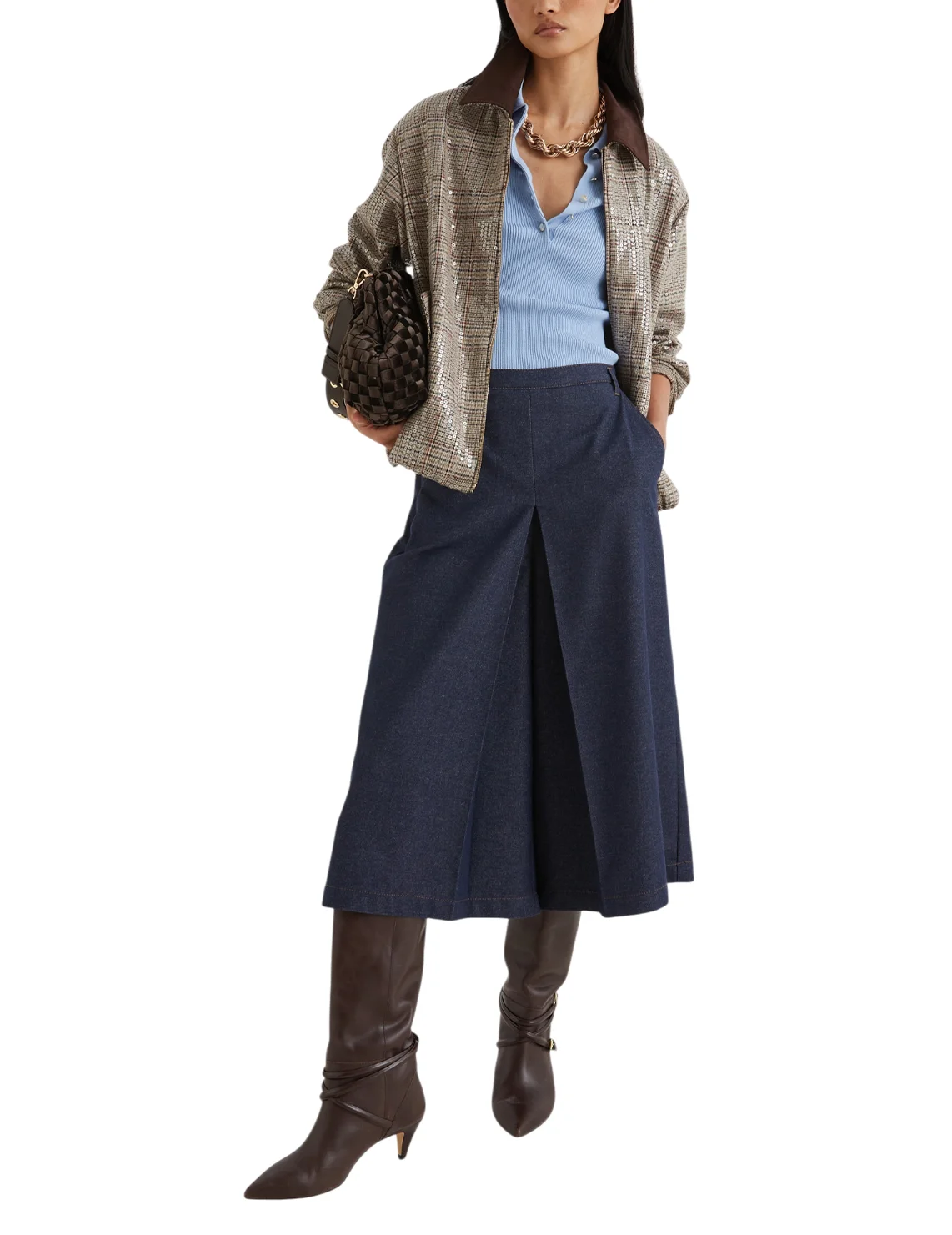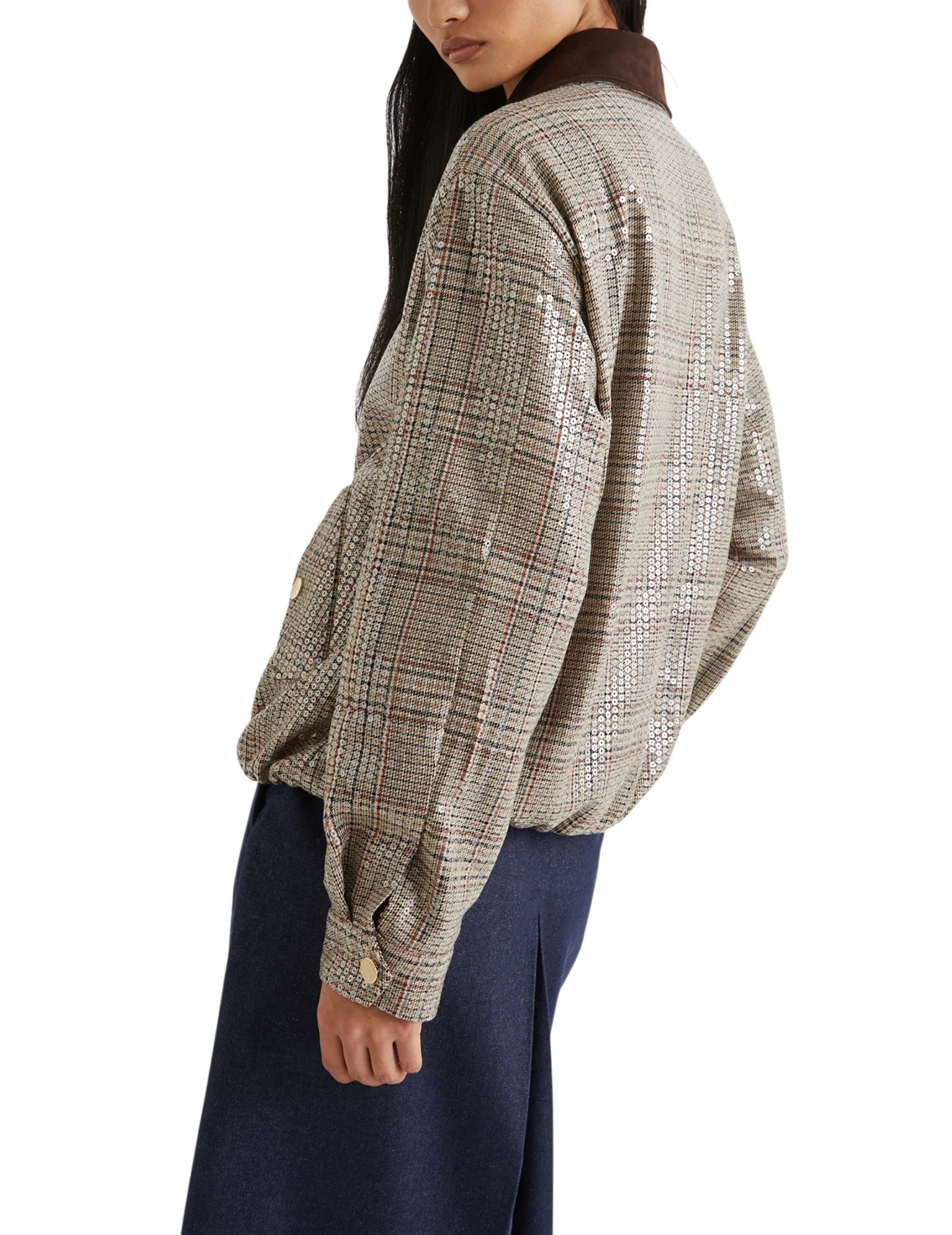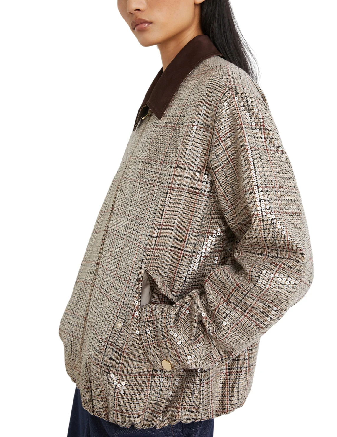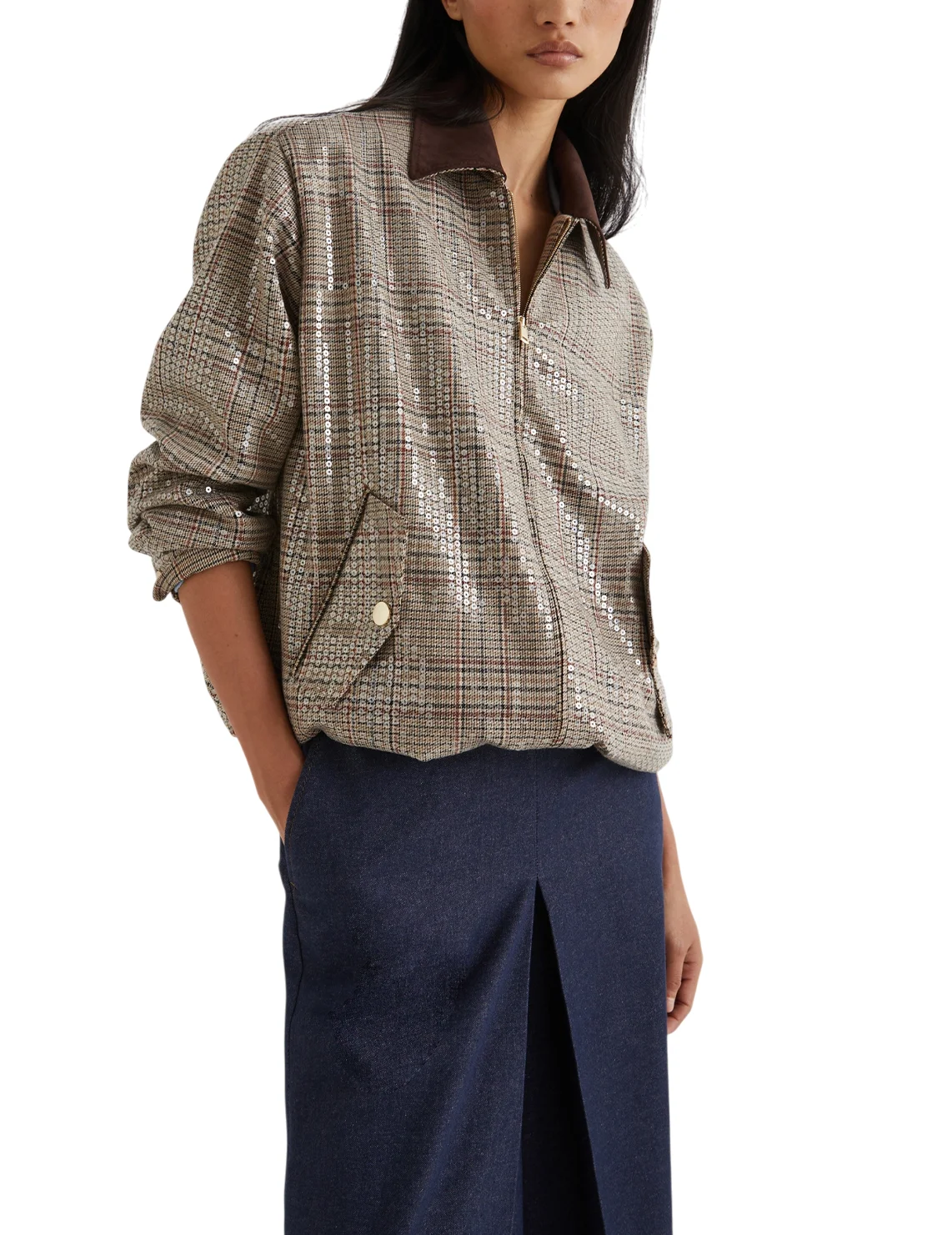 Куртка виготовлена з поліестеру, віскози та еластану, підкладка з поліестеру та еластану. Модель виконана в прямому крої. Має застібку на блискавку, відкладний комір, довгі рукави з манжетами та прорізні кишені з клапанами. Декорована принтом у клітинку.