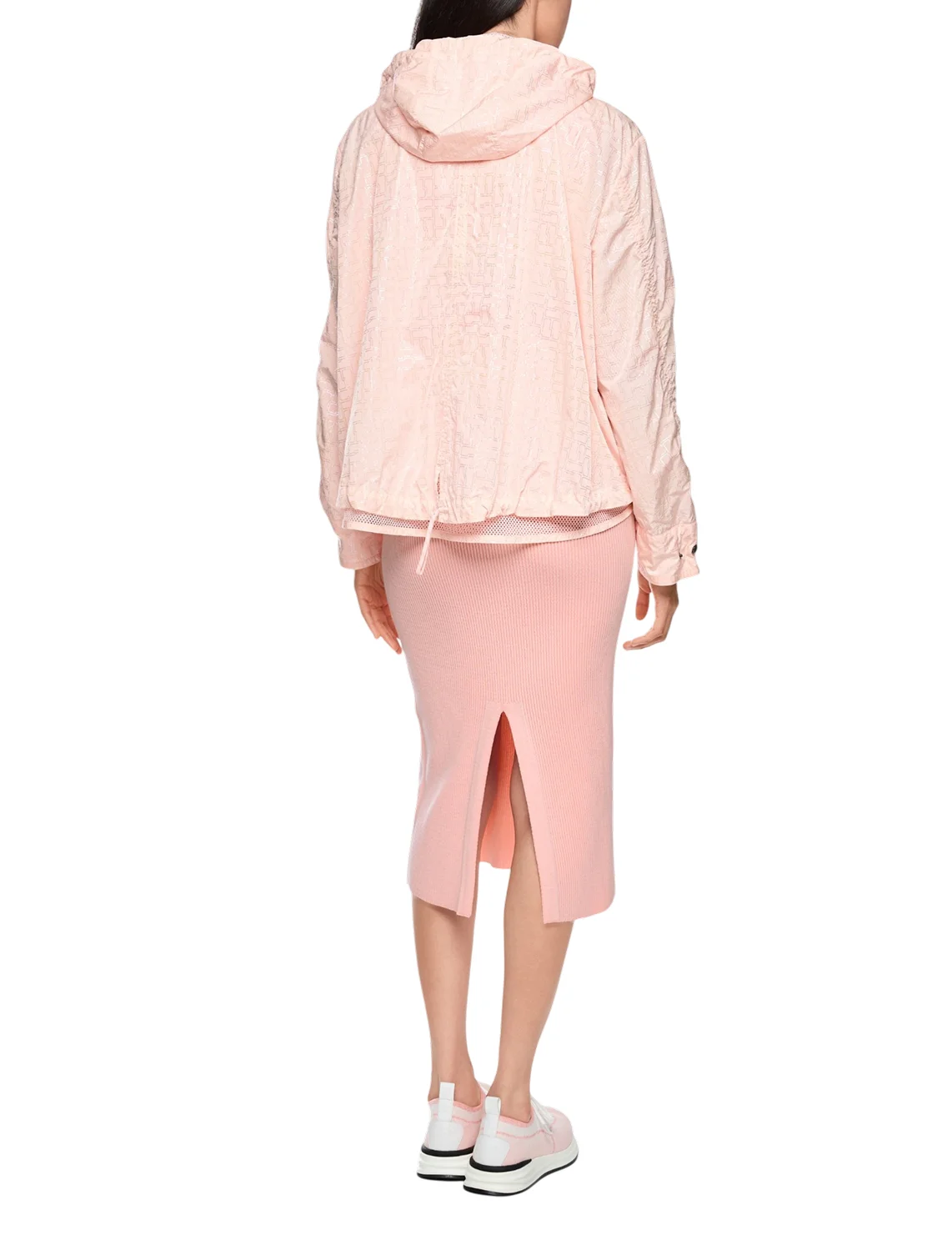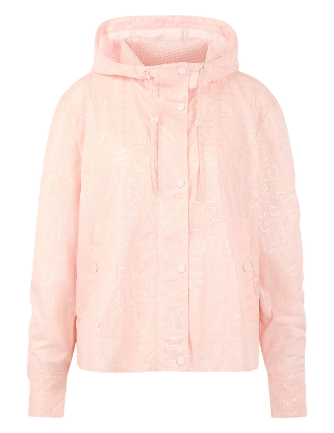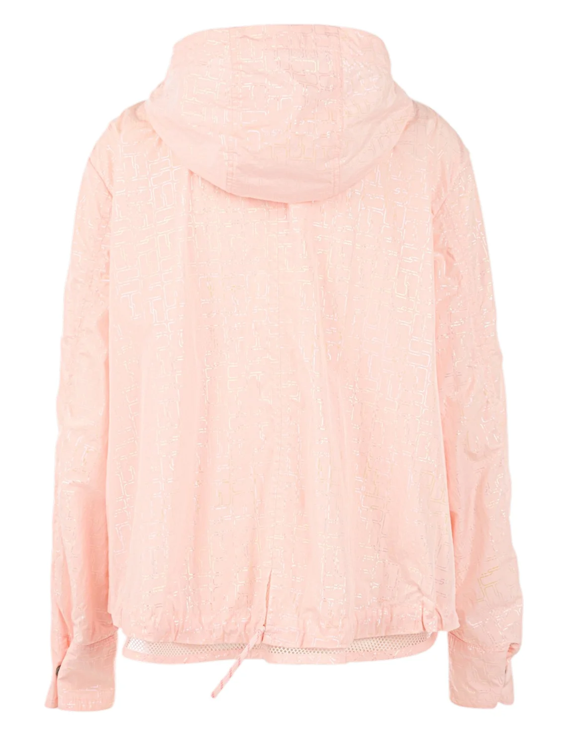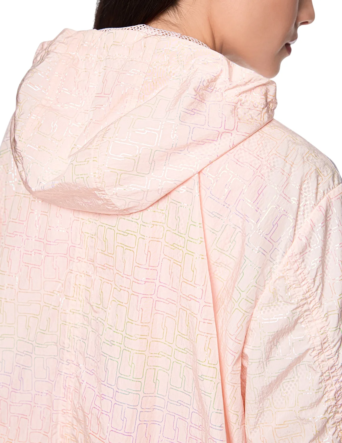 Куртка виготовлена зі 100% поліаміду, сітчаста підкладка з поліестеру. Модель виконана у вільному крої. Має комір-стійку, капюшон з куліскою, прорізні кишені, довгі рукави з манжетами, розріз ззаду на зав'язках, застібку на кнопках і двосторонню застібку на блискавці. Декорована оригінальним принтом.