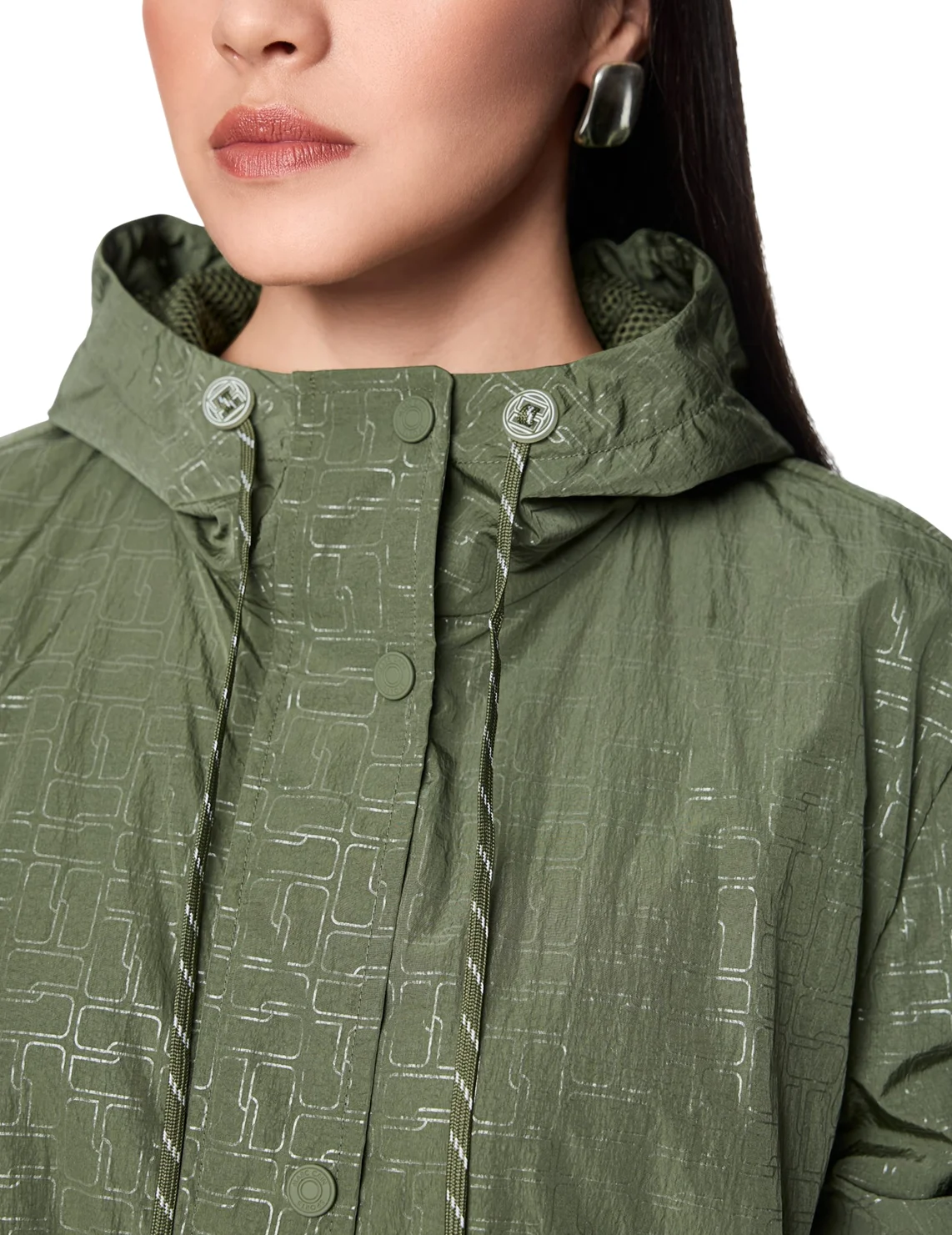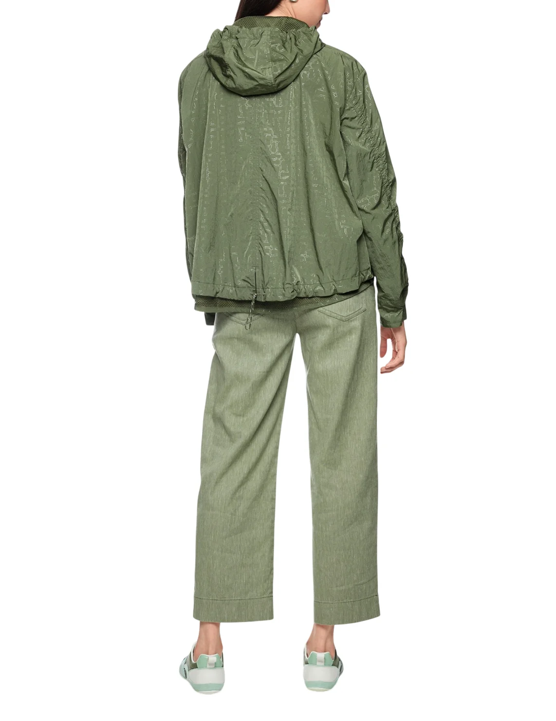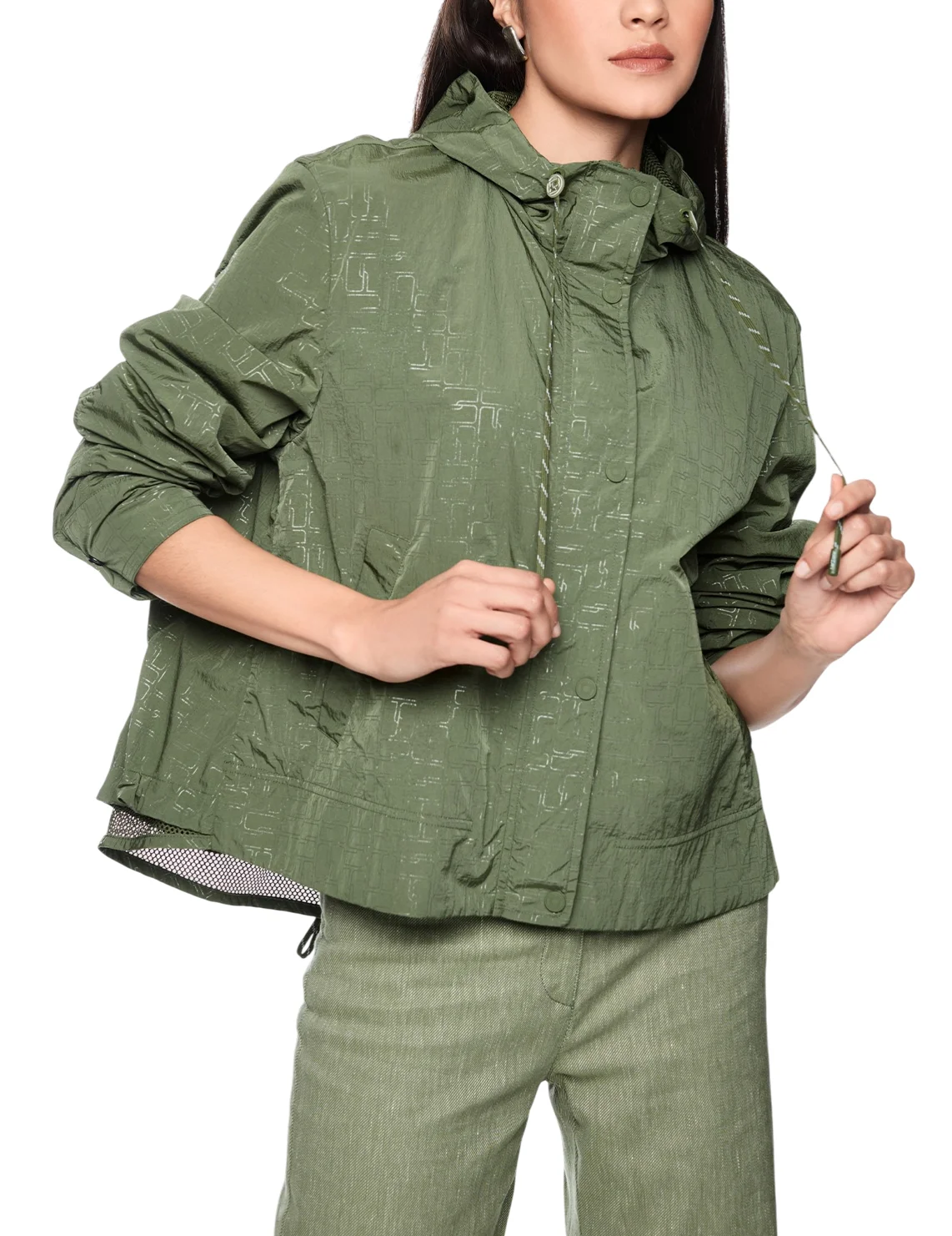 Куртка виготовлена зі 100% поліаміду, сітчаста підкладка з поліестеру. Модель виконана у вільному крої. Має комір-стійку, капюшон з куліскою, прорізні кишені, довгі рукави з манжетами, розріз ззаду на зав'язках, застібку на кнопках і двосторонню застібку на блискавці. Декорована оригінальним принтом.
