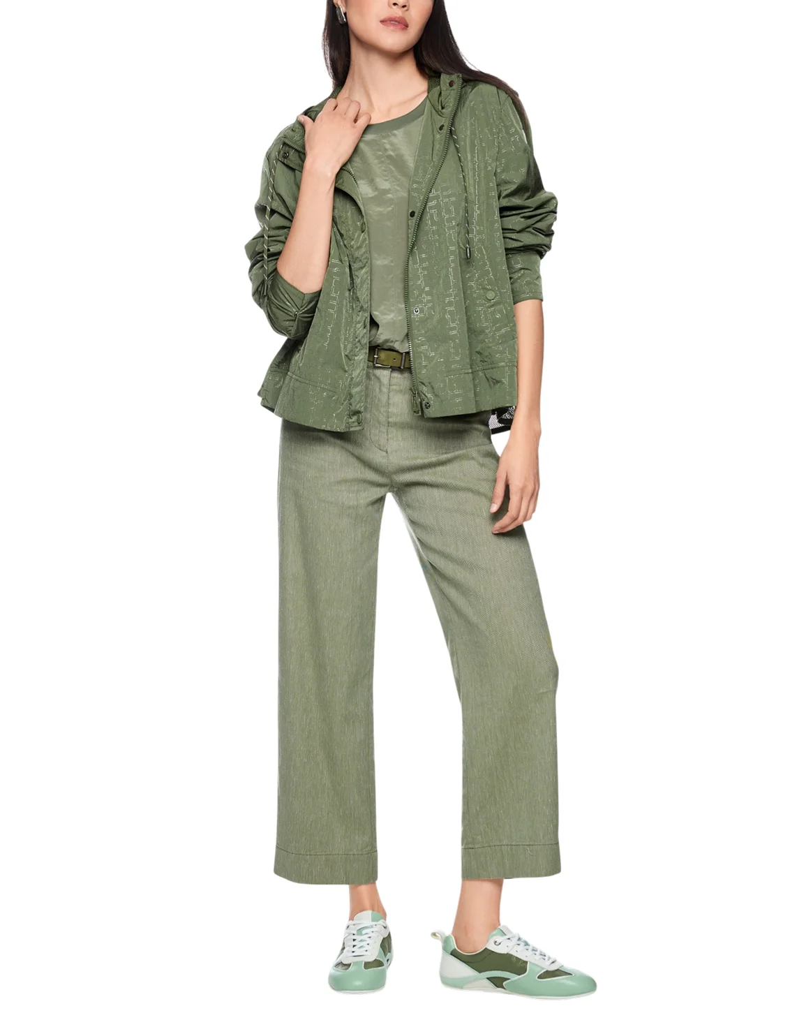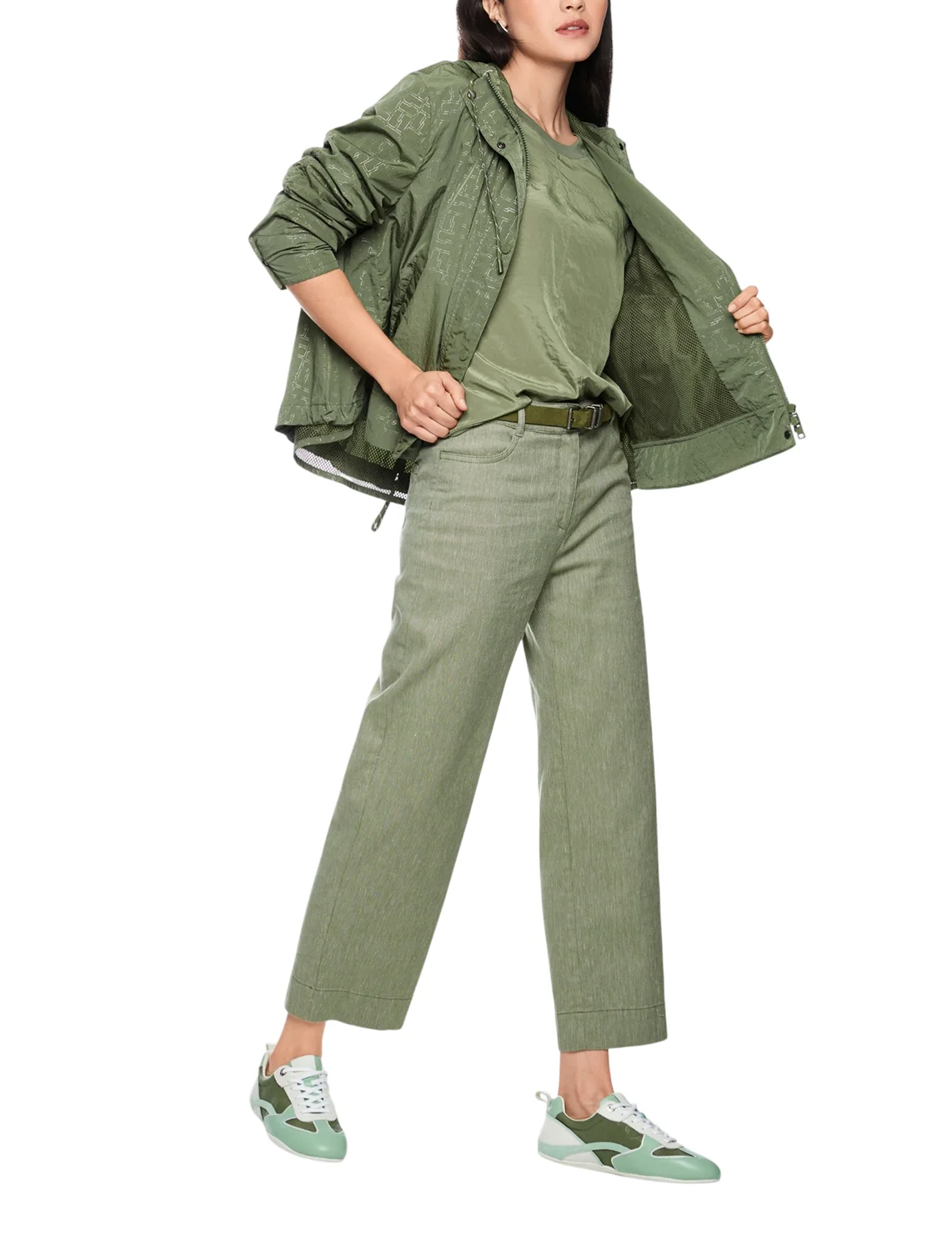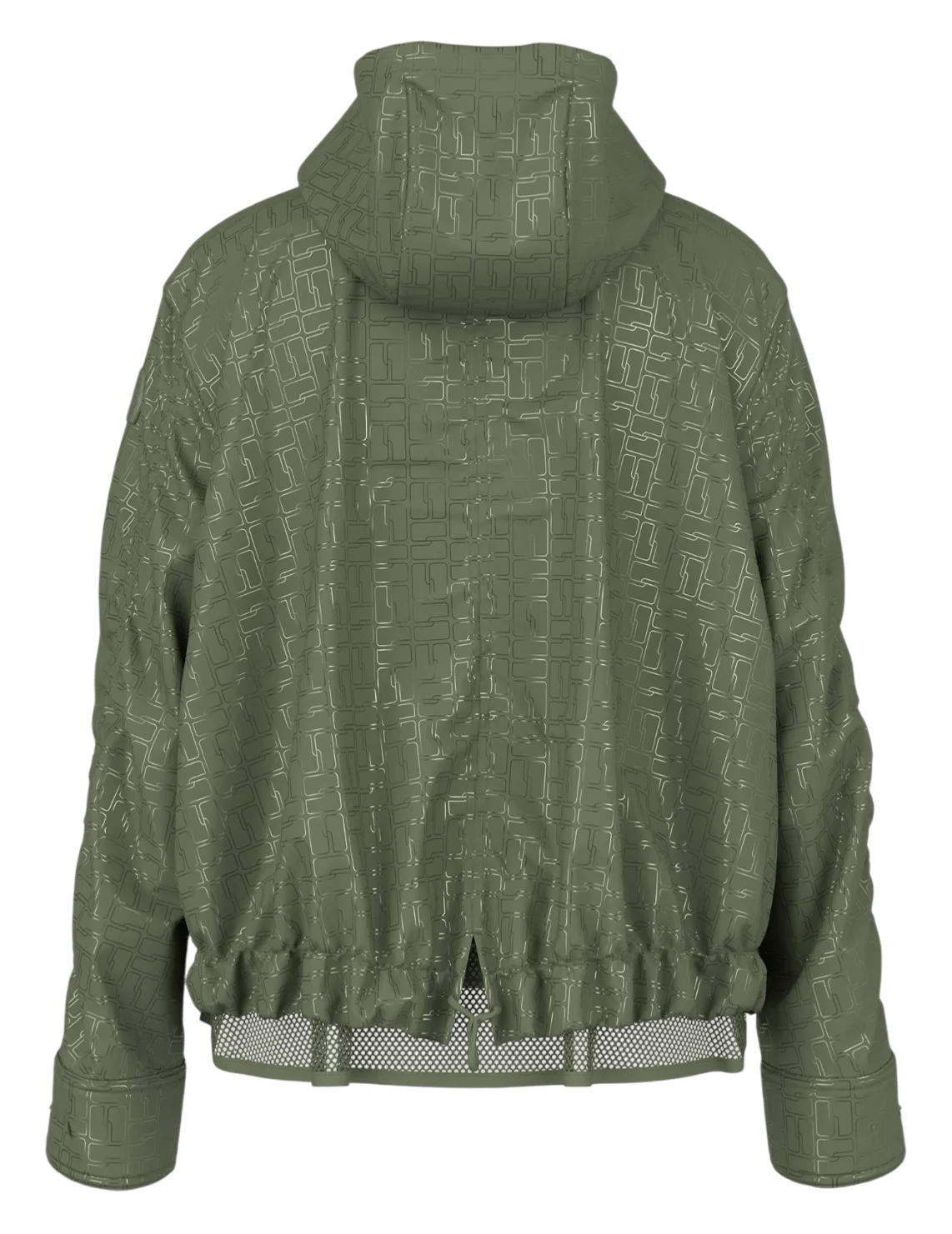 Куртка виготовлена зі 100% поліаміду, сітчаста підкладка з поліестеру. Модель виконана у вільному крої. Має комір-стійку, капюшон з куліскою, прорізні кишені, довгі рукави з манжетами, розріз ззаду на зав'язках, застібку на кнопках і двосторонню застібку на блискавці. Декорована оригінальним принтом.