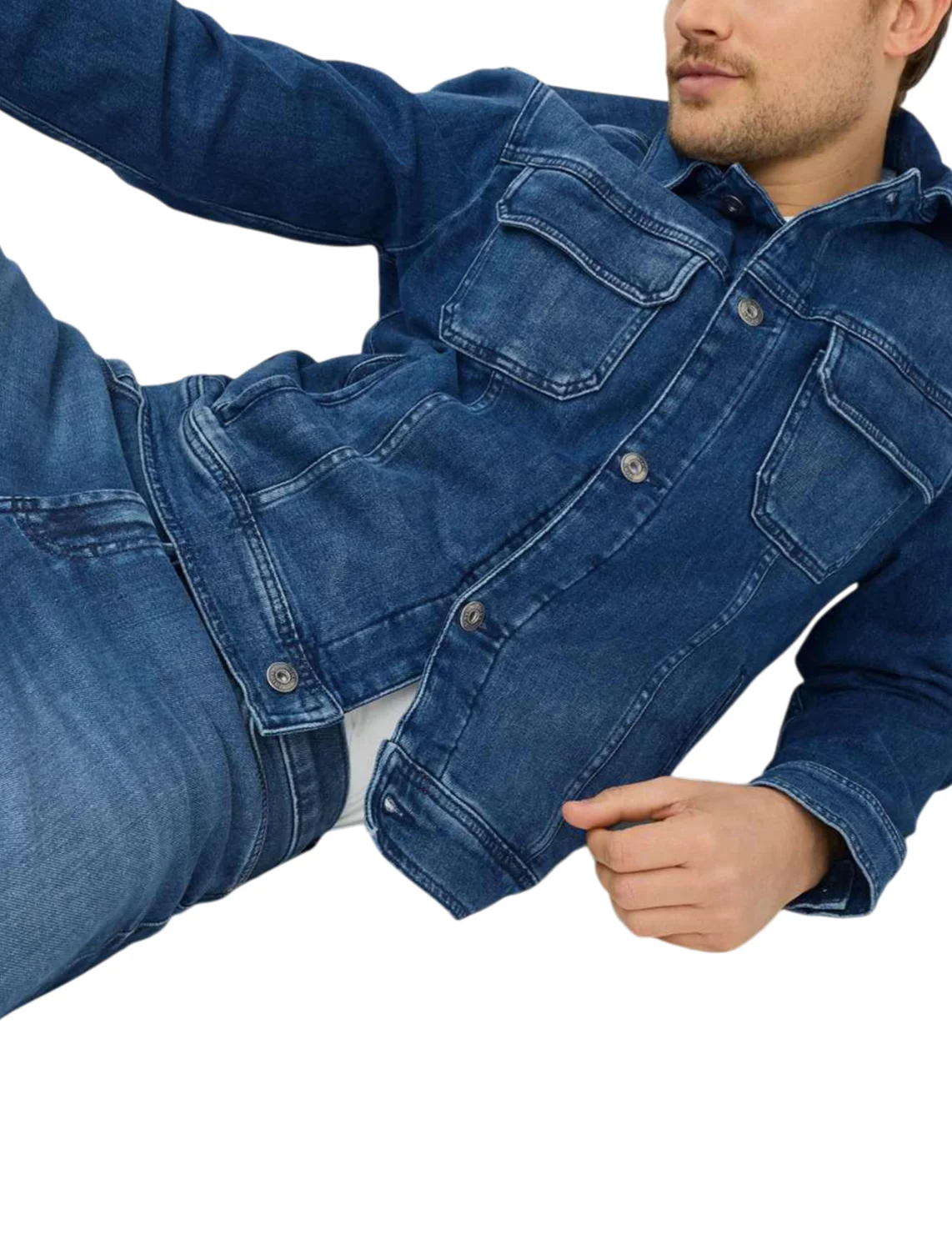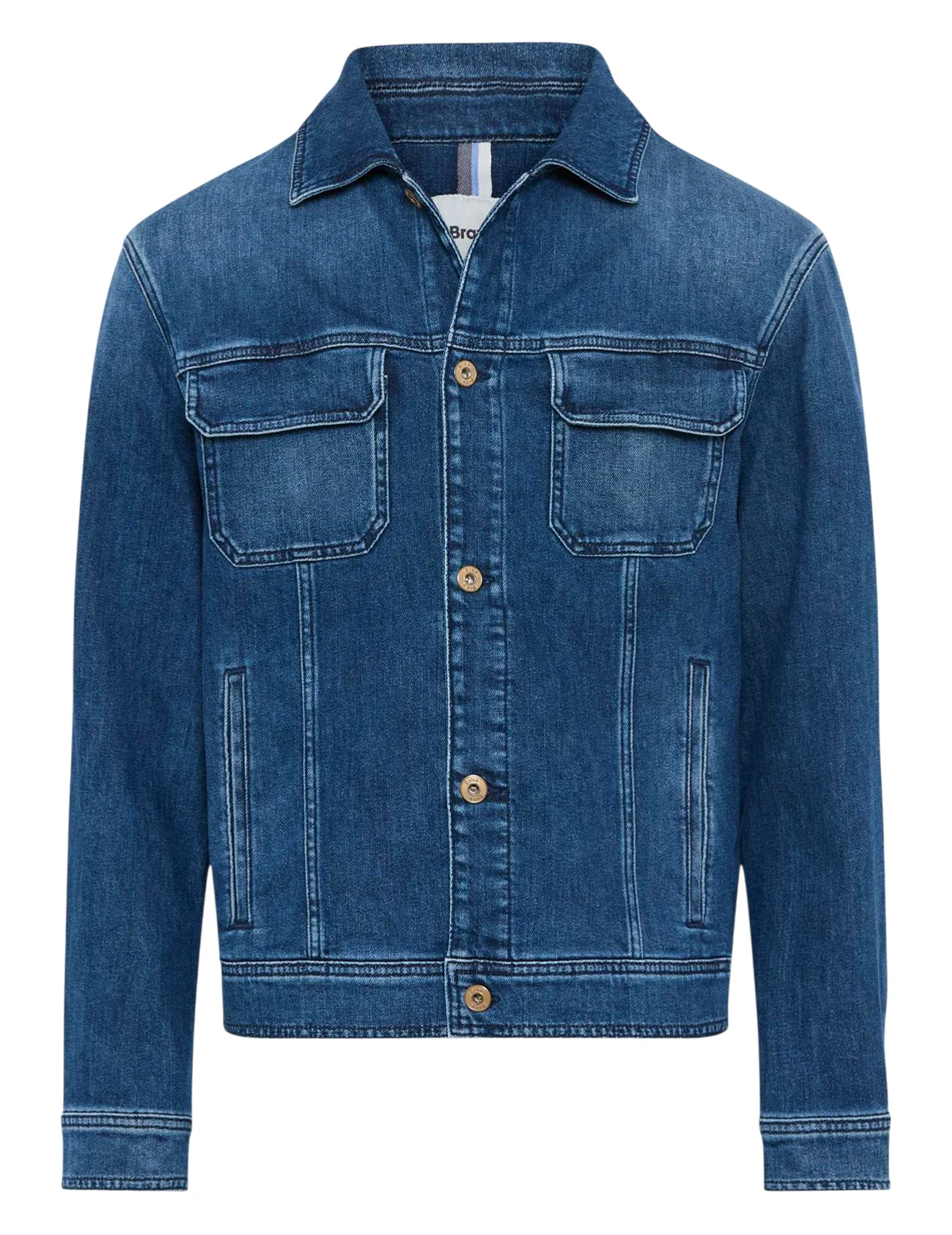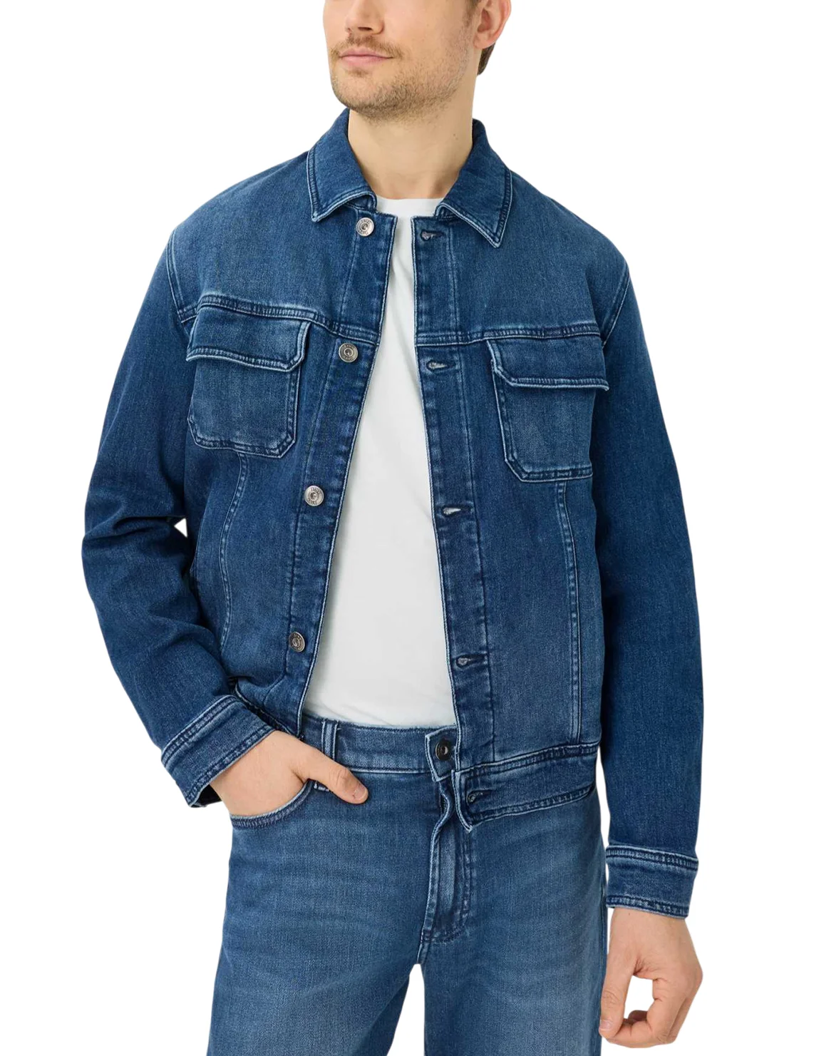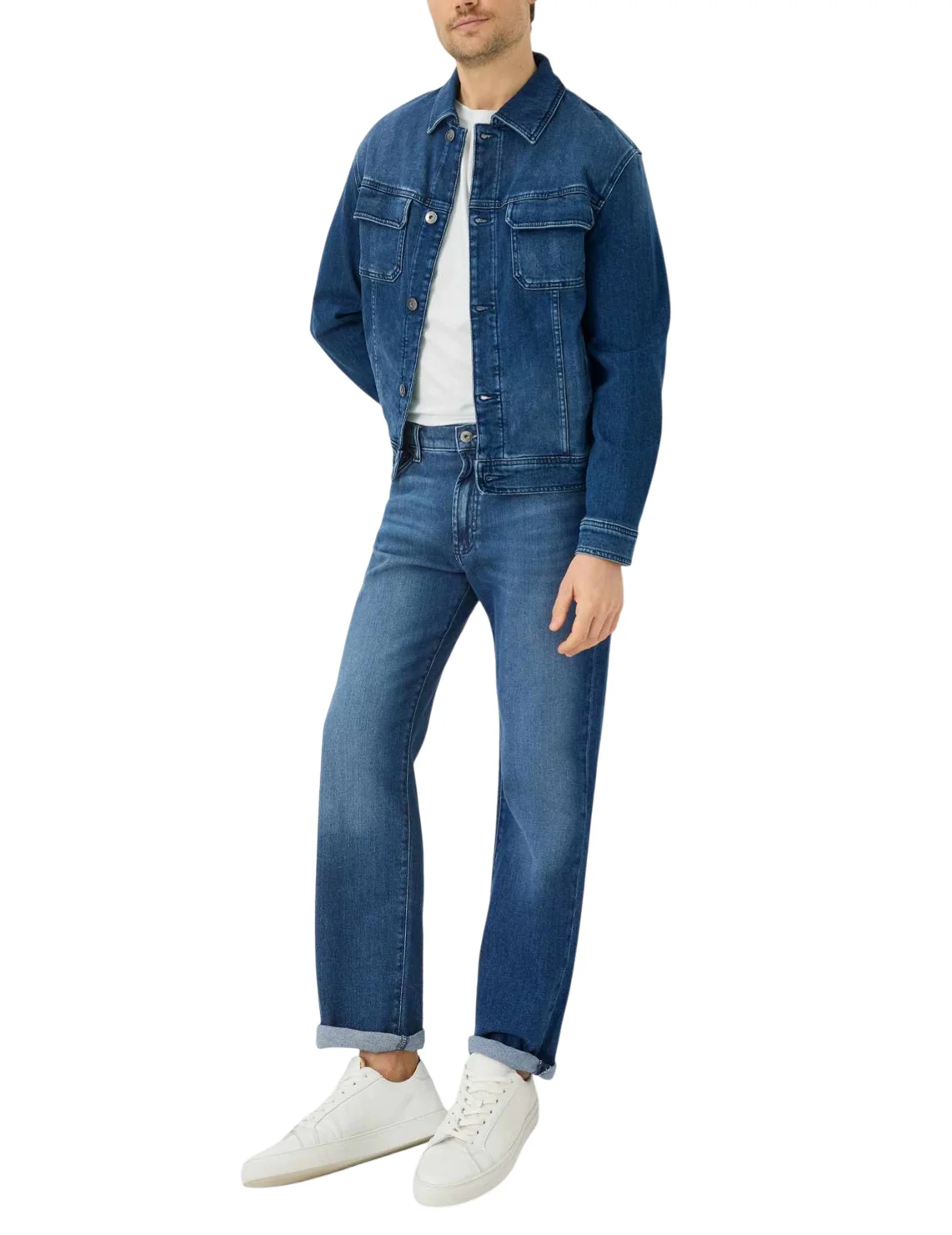 Джинсова куртка виготовлена з бавовни, еластомультіестеру та еластану. Модель виконана в прямому крої. Має відкладний комір, передні прорізні кишені, нагрудні кишені з клапанами, довгі рукави з манжетами та застібку на ґудзиках.