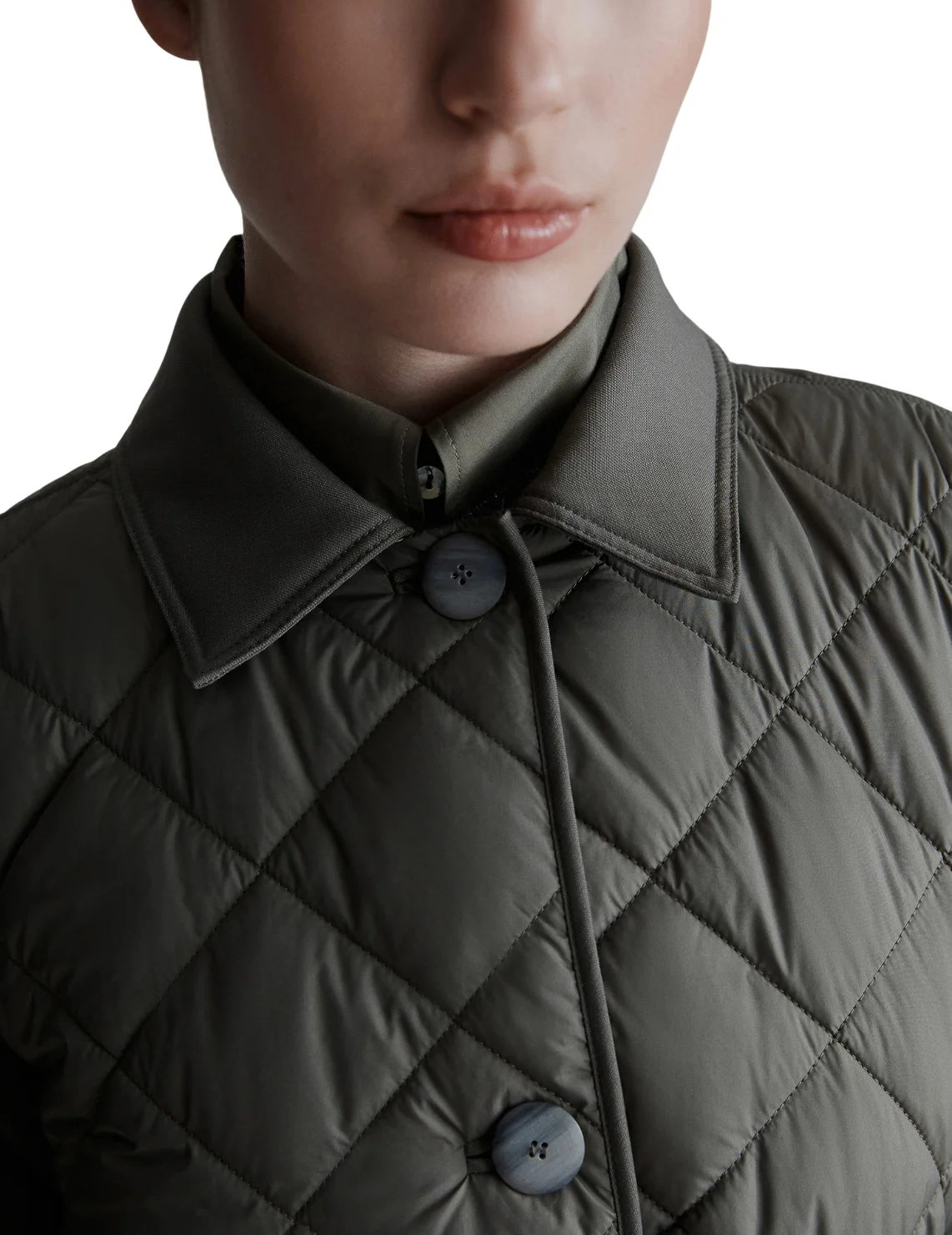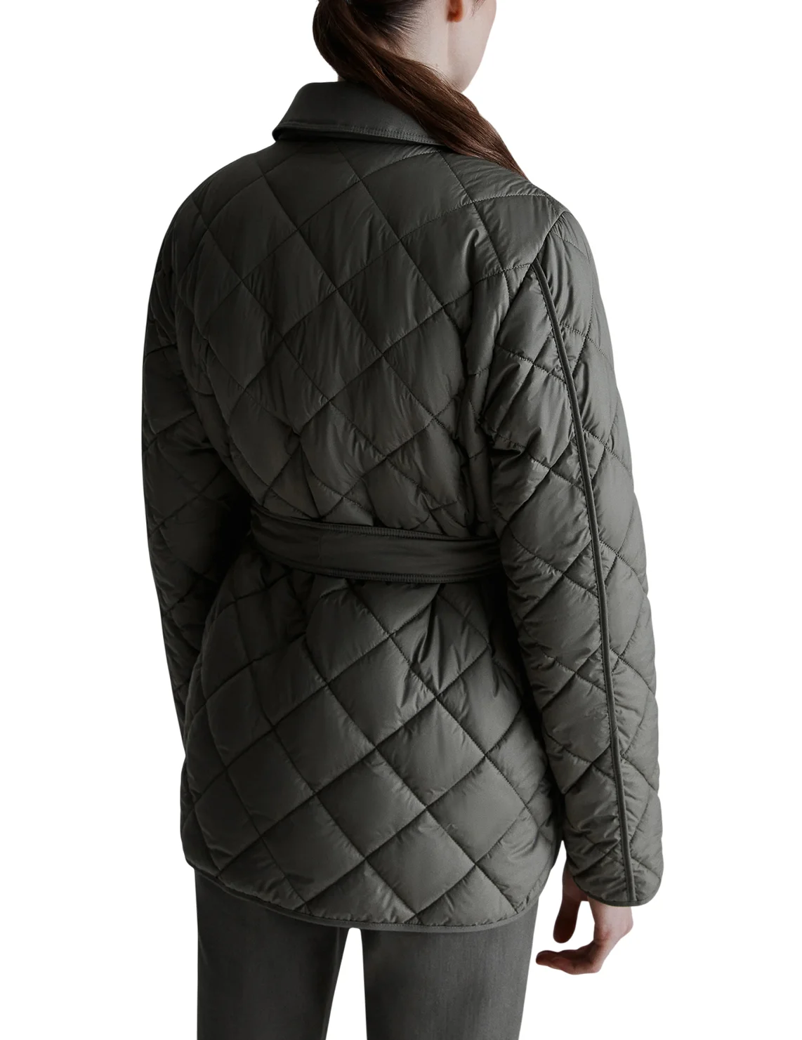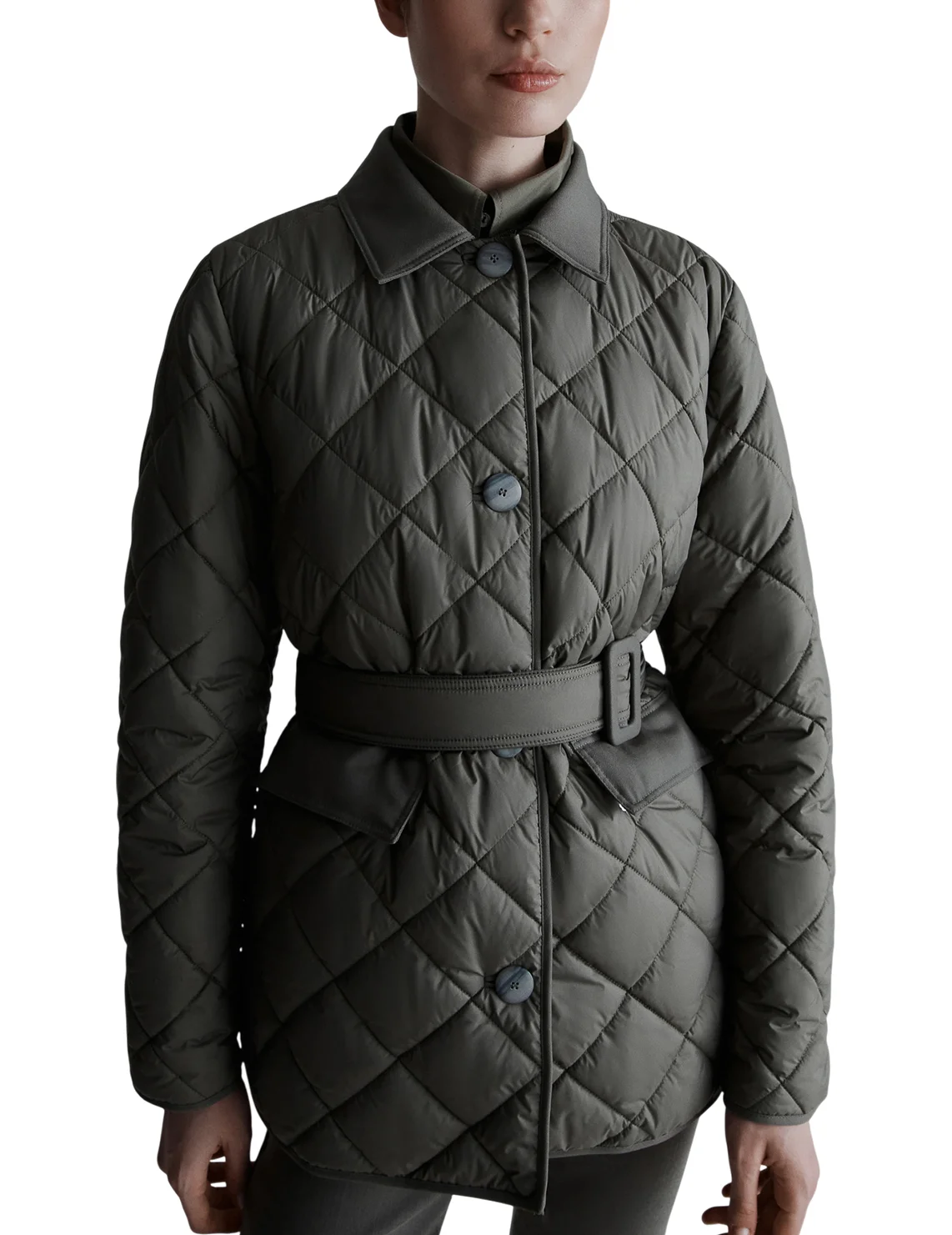Куртка виготовлена з поліестеру та вовни, підкладка та наповнювач з поліестеру. Модель виконана в прямому крої. Має відкладний комір, застібку на ґудзиках, тканинний пояс у тон, довгі рукави та бічні кишені з клапанами.