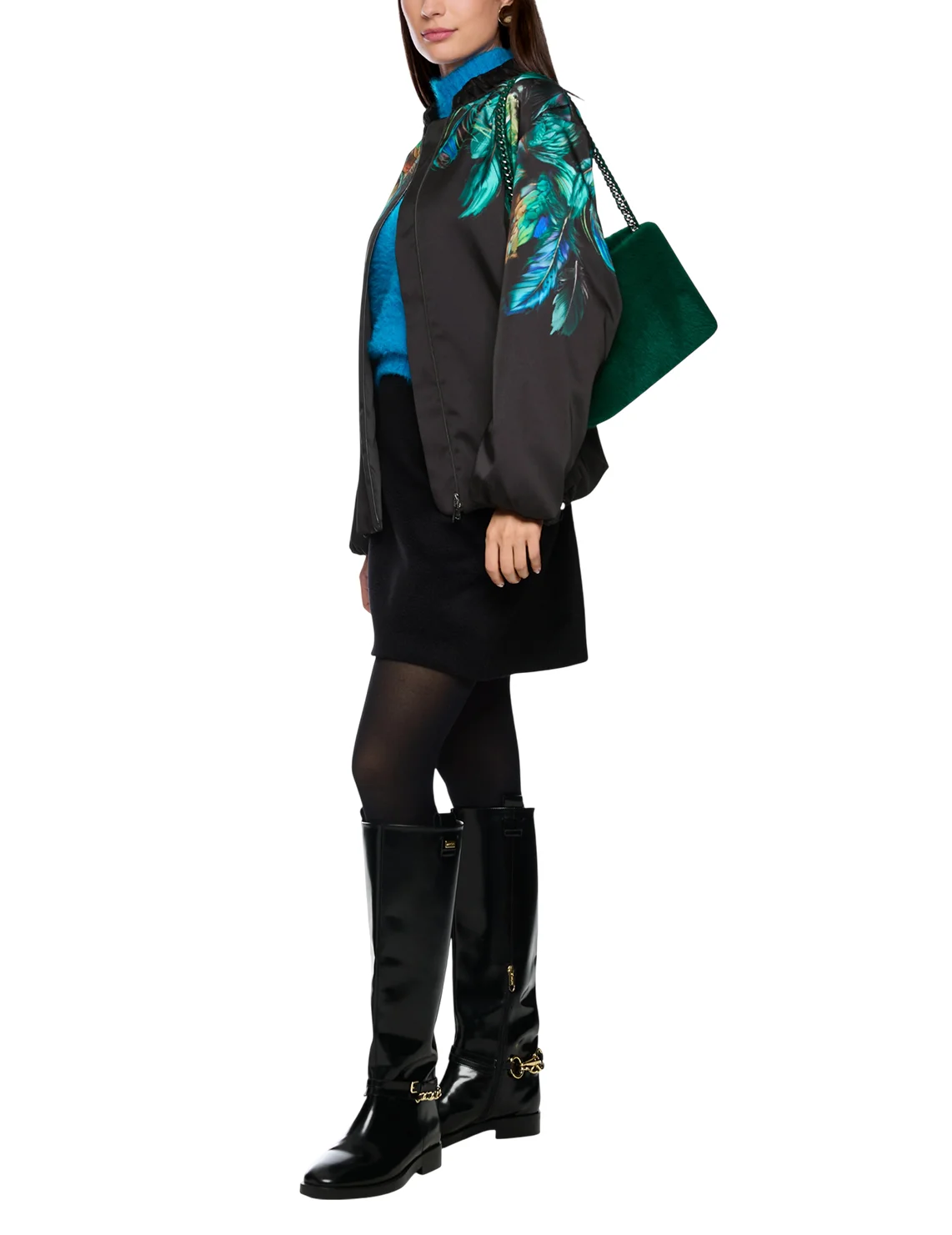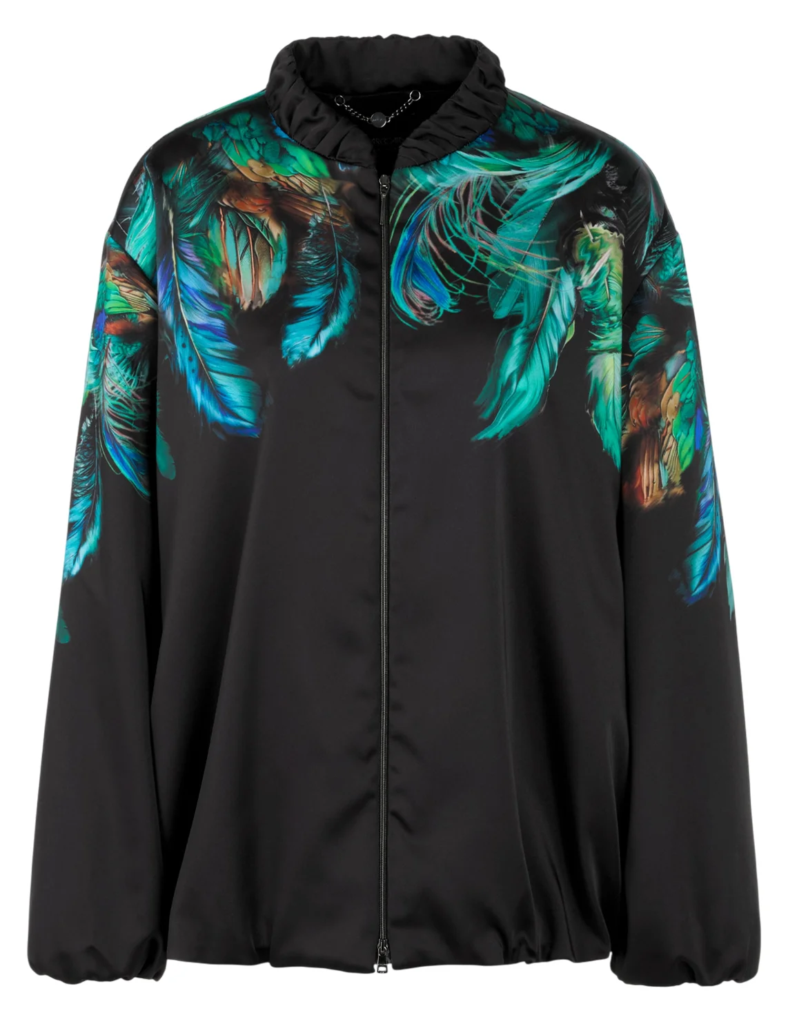 Куртка виготовлена з поліестеру та еластану, підкладка з поліестеру та бавовни. Модель виконана у вільному крої. Має комір-стійку, прорізні кишені, довгі рукави з манжетами та двосторонню застібку-блискавку. Декорована оригінальним принтом.