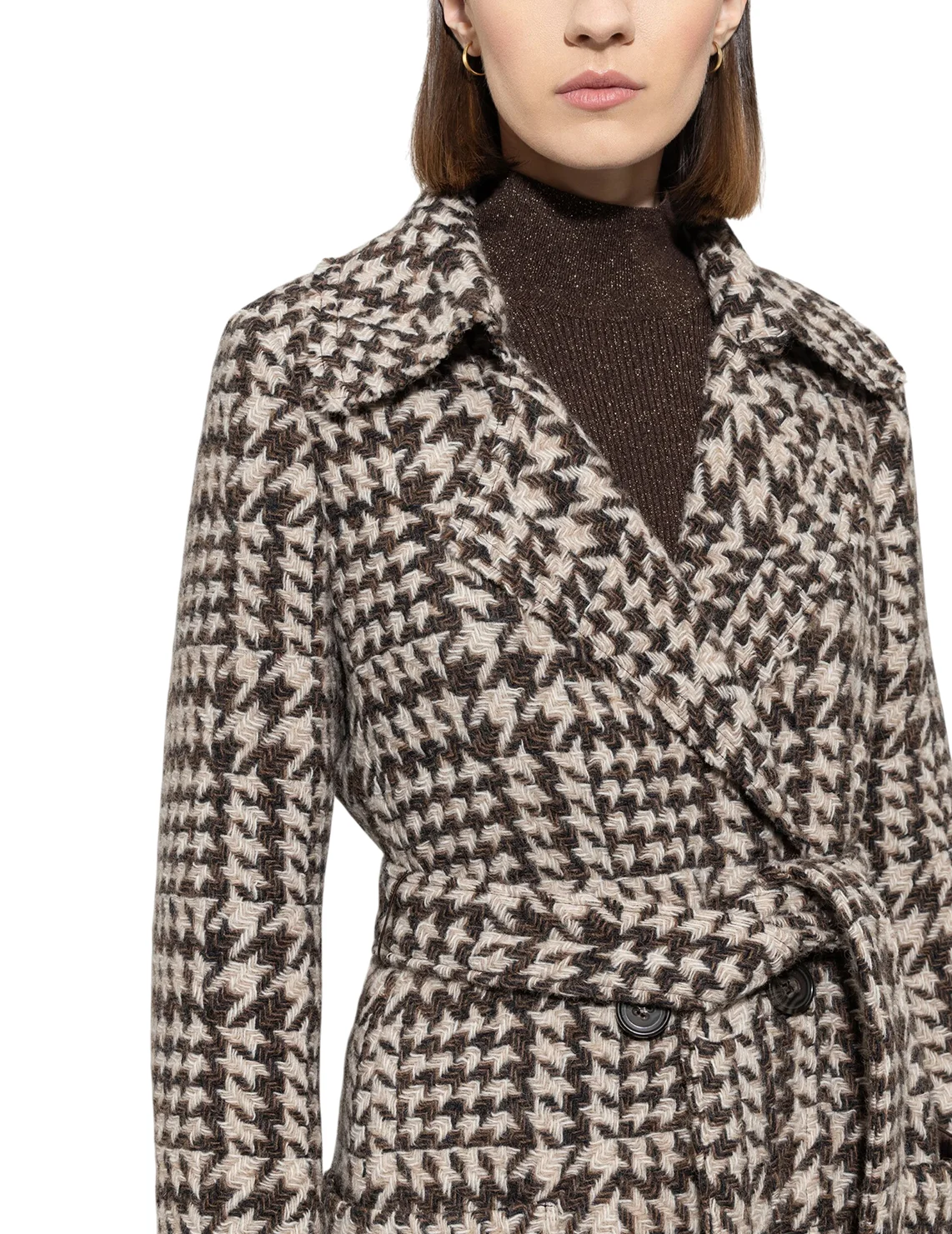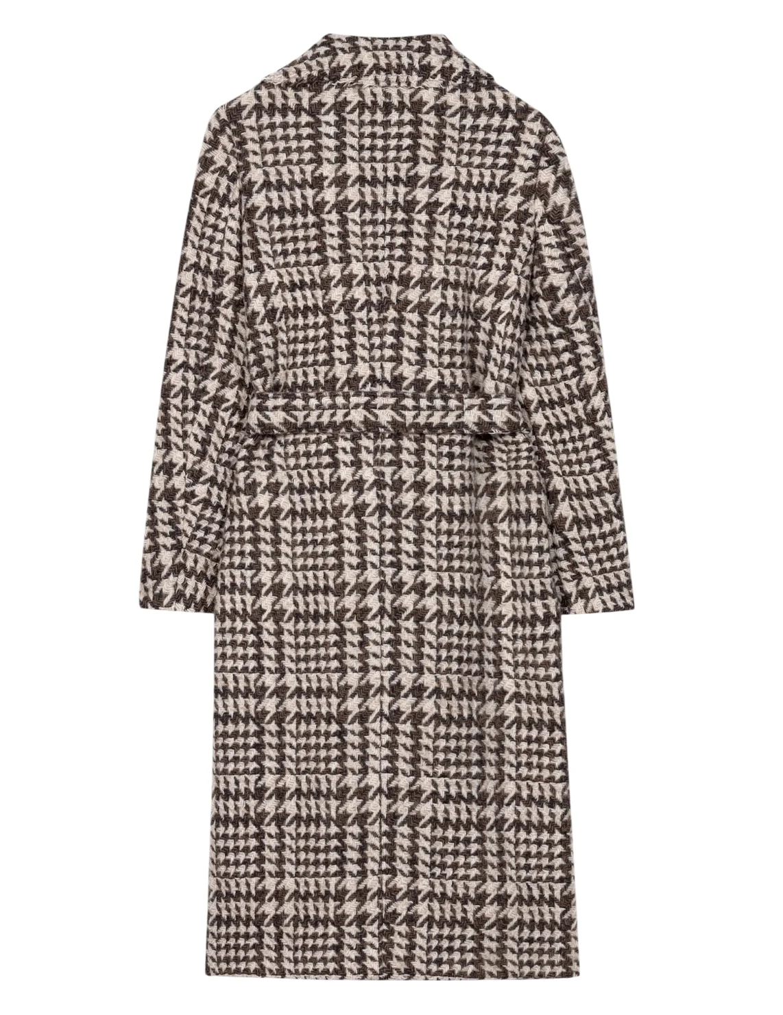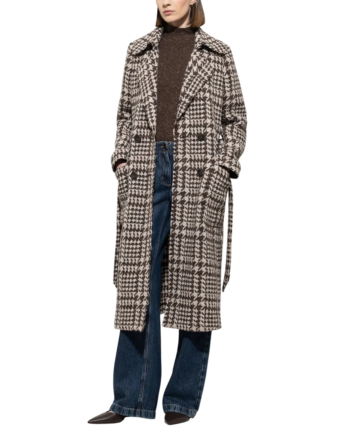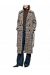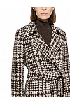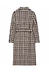 Двобортне пальто виготовлене зі 100% вовни, підкладка з віскози та поліестеру. Модель виконана в прямому крої. Має відкладний комір з лацканами, застібку на ґудзиках, довгі рукави, пояс у тон і накладні кишені. Декорована оригінальним принтом.