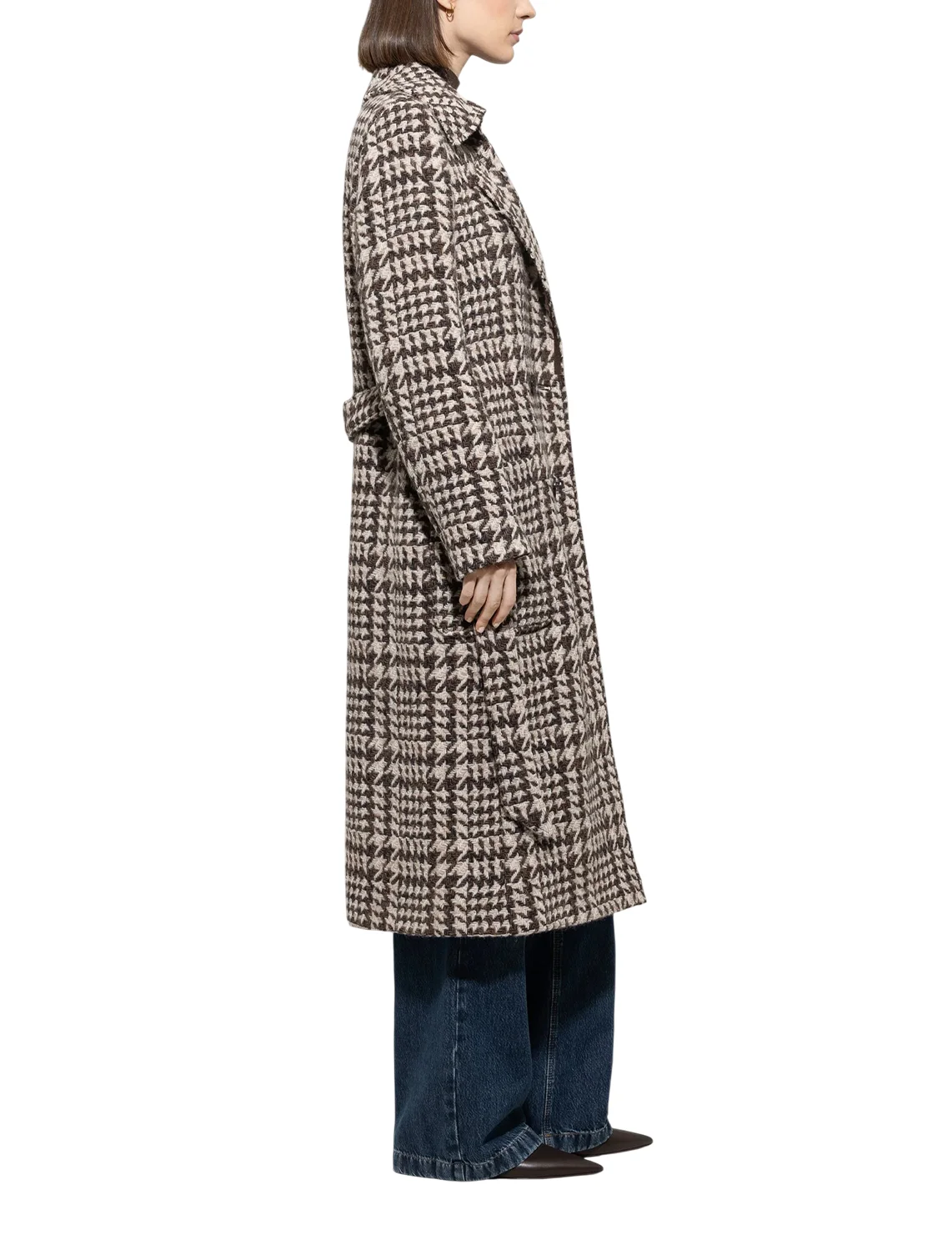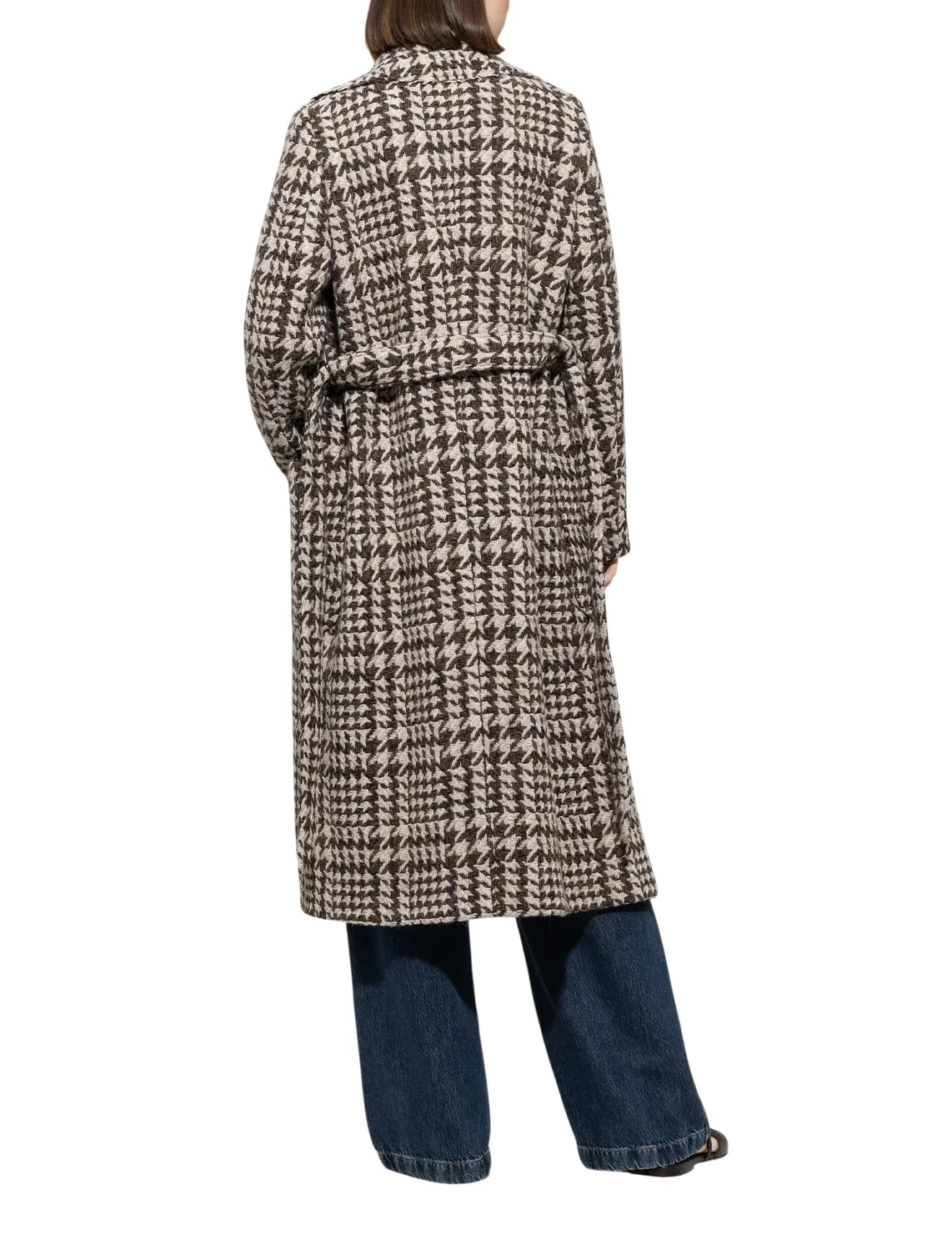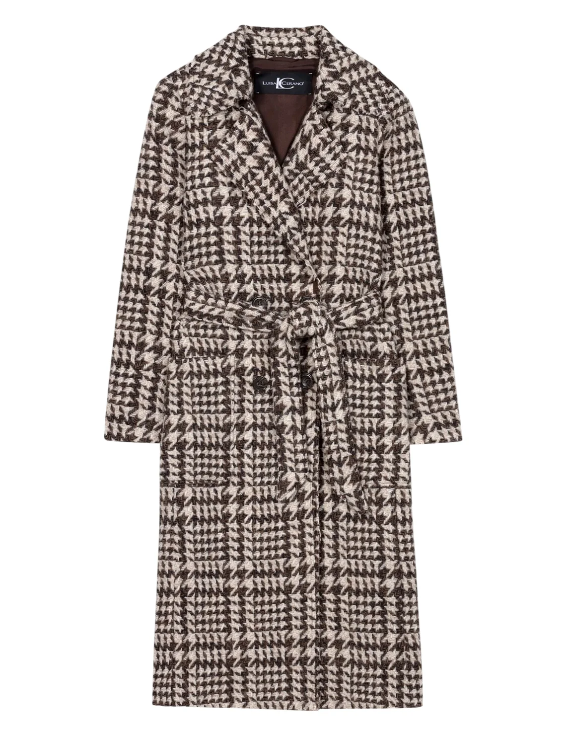 Двобортне пальто виготовлене зі 100% вовни, підкладка з віскози та поліестеру. Модель виконана в прямому крої. Має відкладний комір з лацканами, застібку на ґудзиках, довгі рукави, пояс у тон і накладні кишені. Декорована оригінальним принтом.