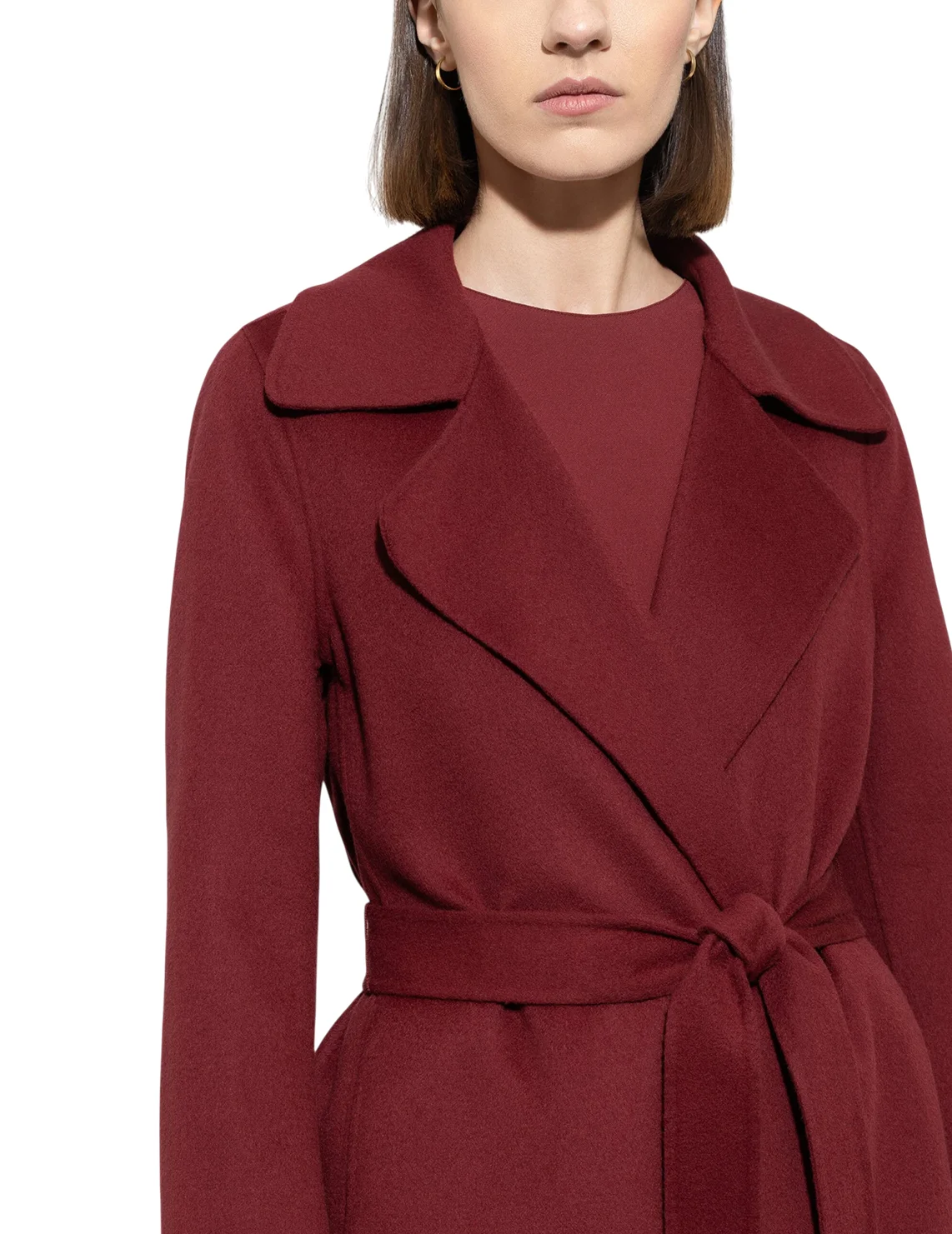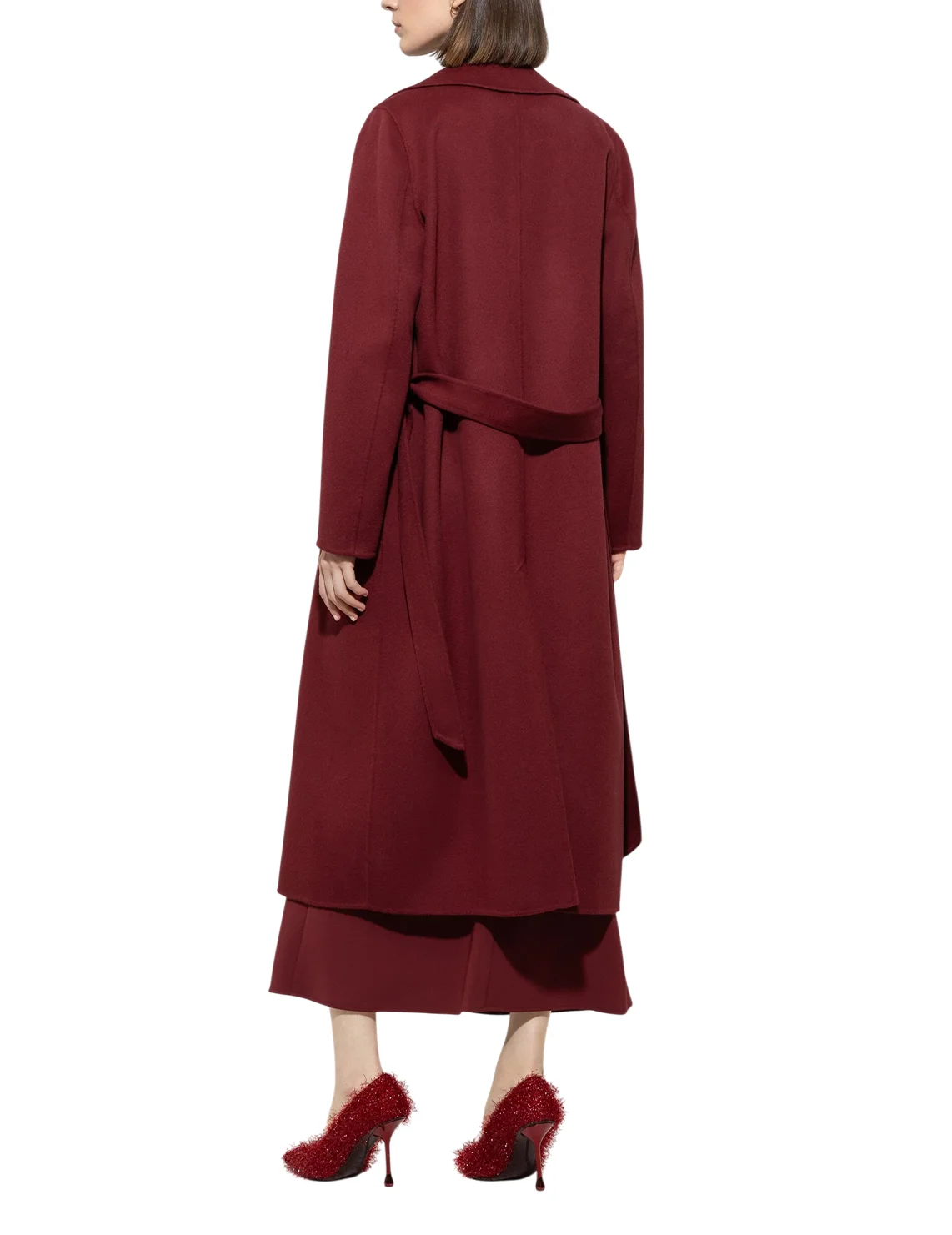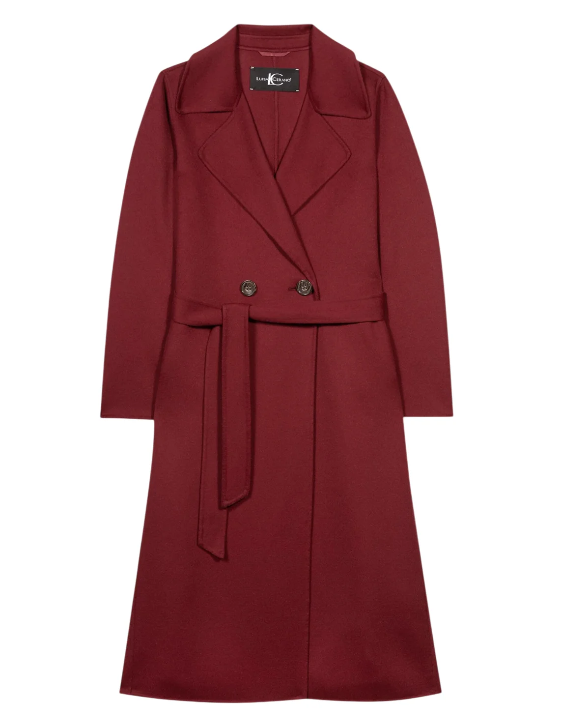 Двобортне пальто виготовлене з вовни та поліаміду, підкладка з віскози та поліестеру. Модель виконана в прямому крої. Має відкладний комір з лацканами, застібку на ґудзиках, довгі рукави, пояс у тон і прорізні кишені.