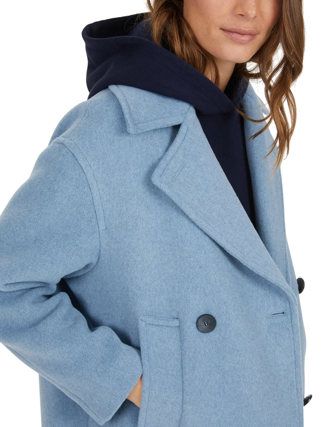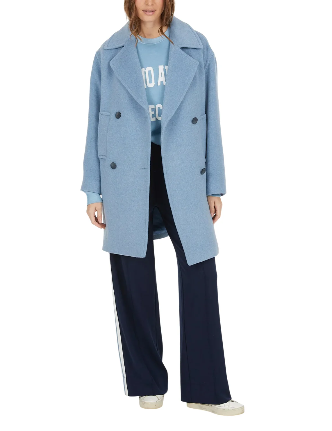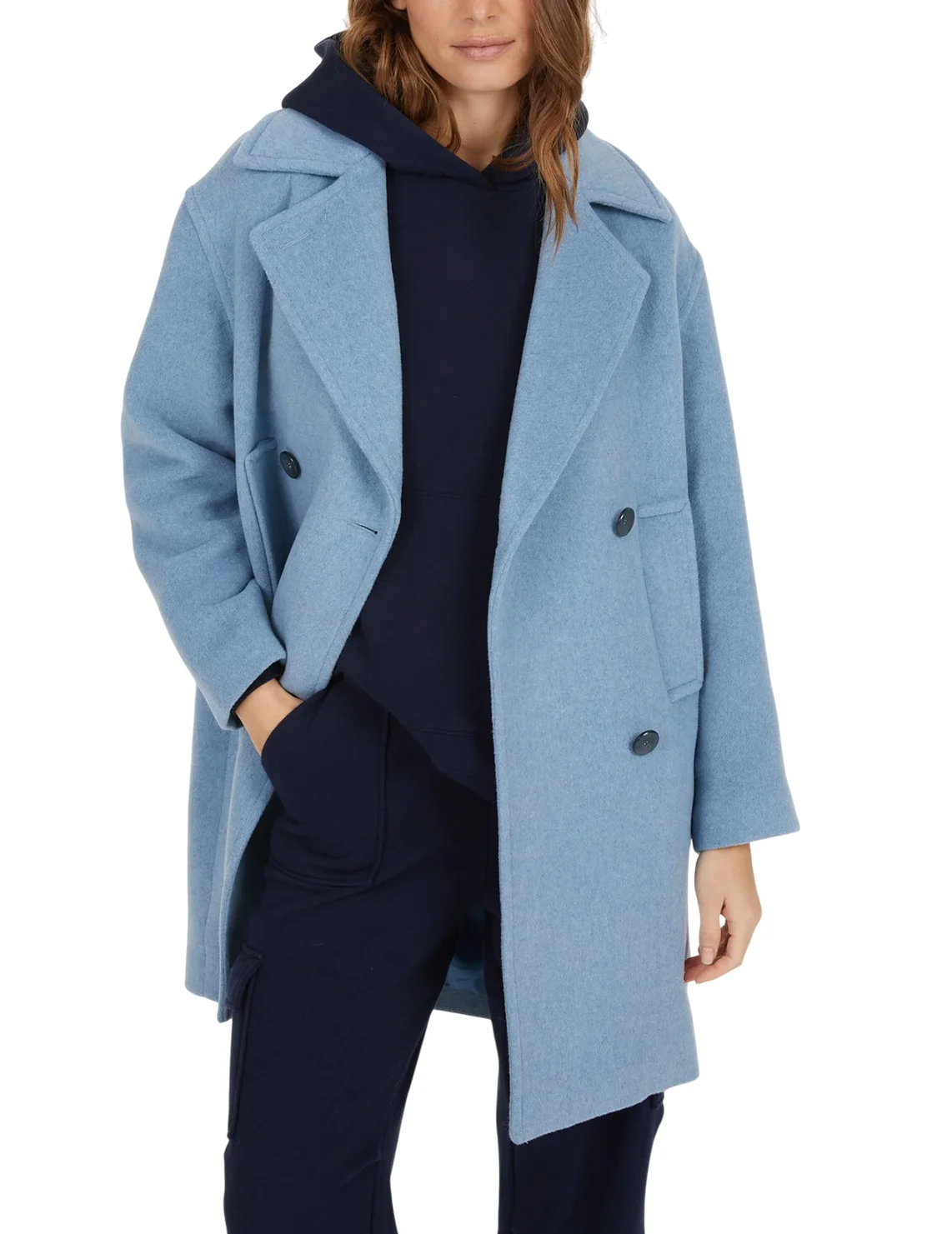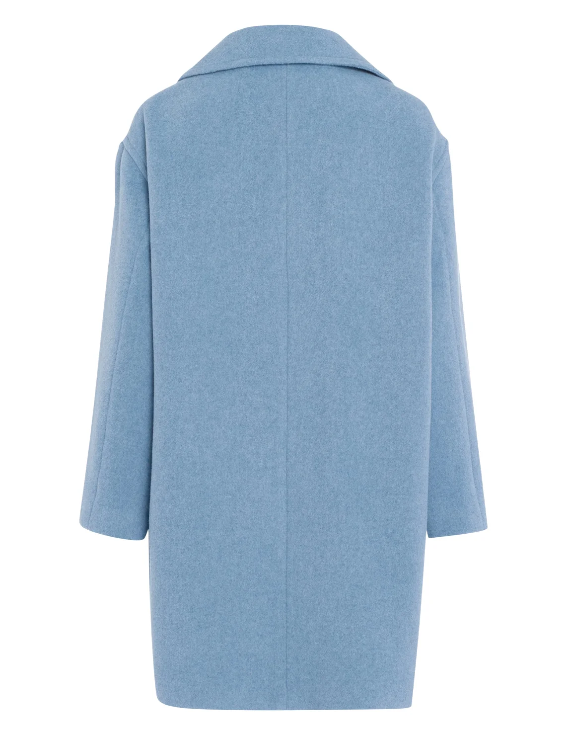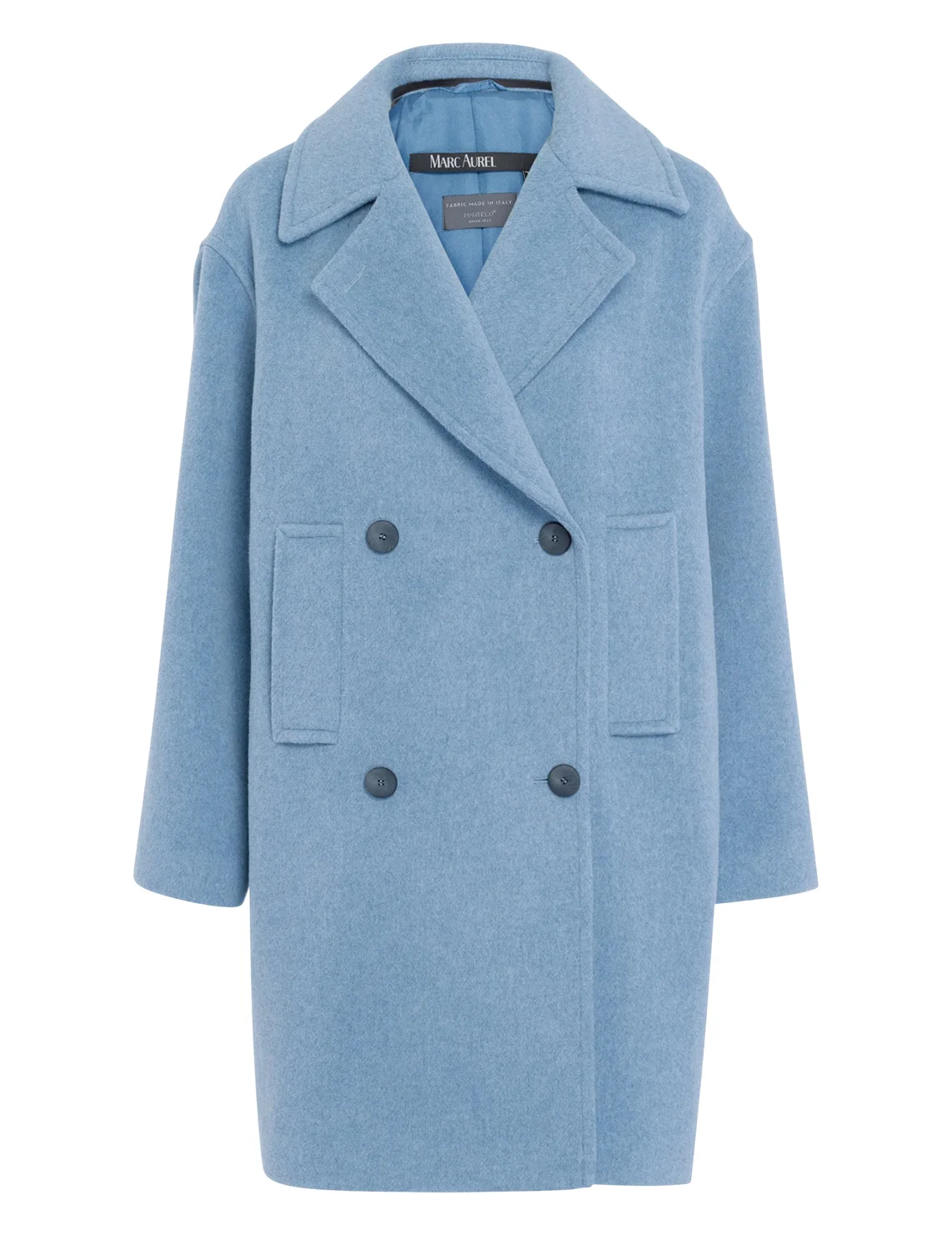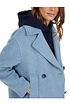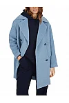 Двобортне пальто виготовлене з поліакрилу, поліестеру та вовни. Модель виконана у вільному крої. Має відкладний комір з лацканами, застібку на ґудзиках, довгі рукави та прорізні кишені.