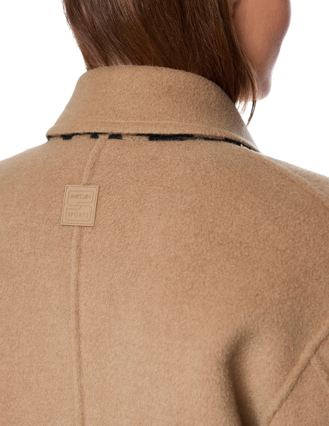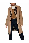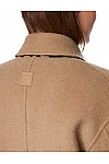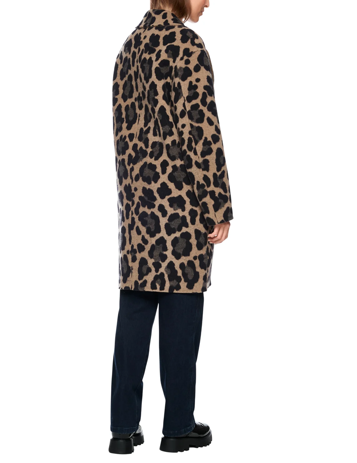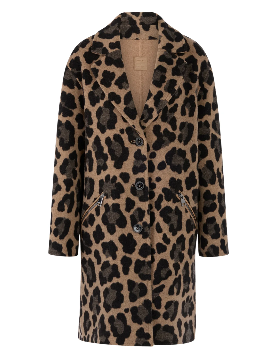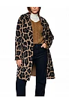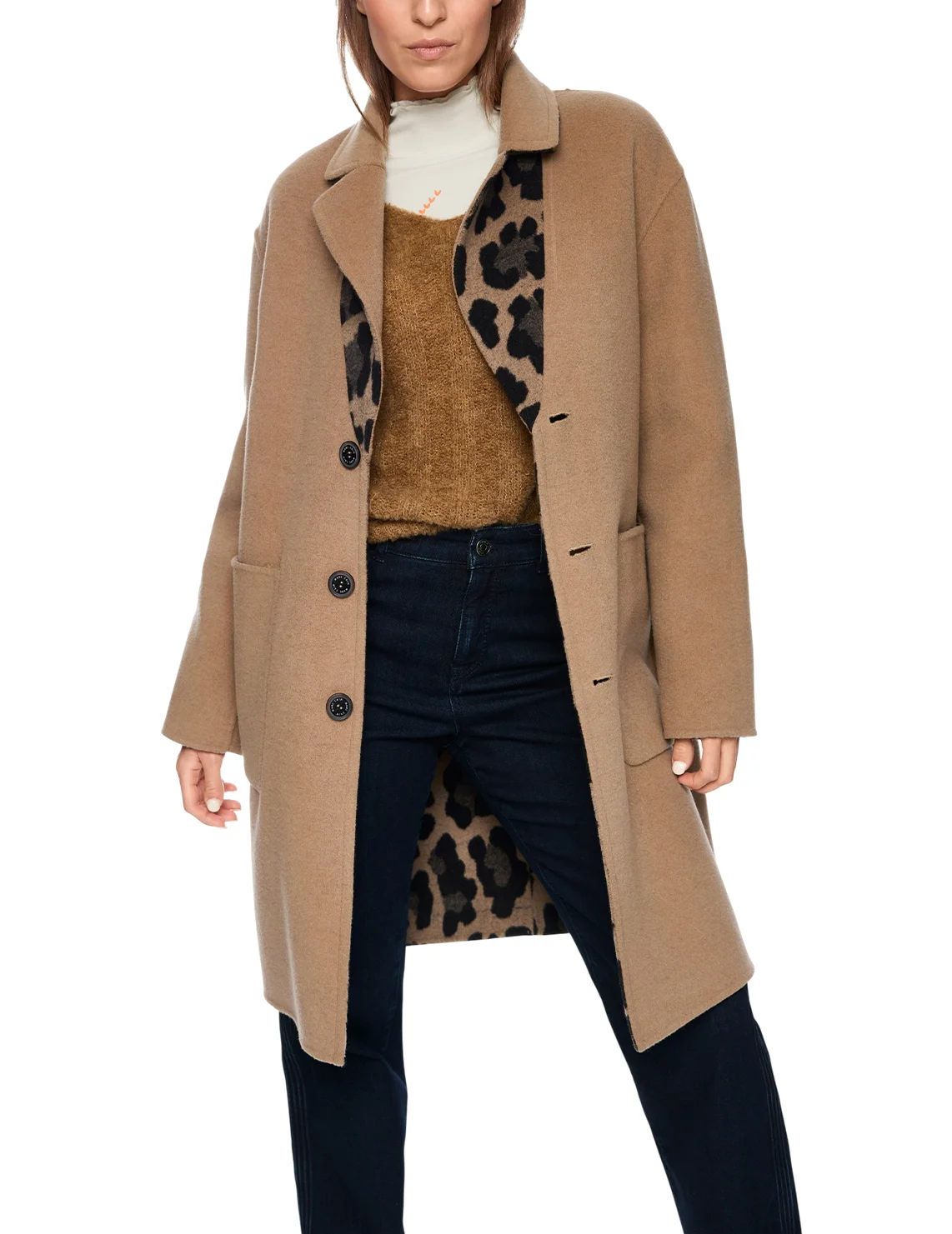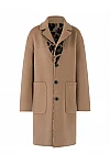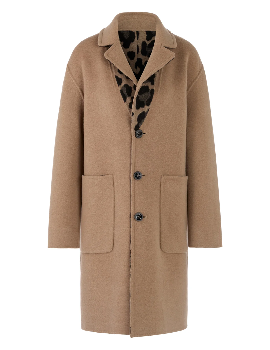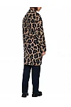 Двостороннє пальто виготовлене з вовни та поліаміду. Модель виконана в прямому крої. Має відкладний комір з лацканами, застібку на ґудзиках, довгі рукави, накладні кишені з одного боку та прорізні кишені на блискавках з іншого боку. Декорований анімалістичним принтом.