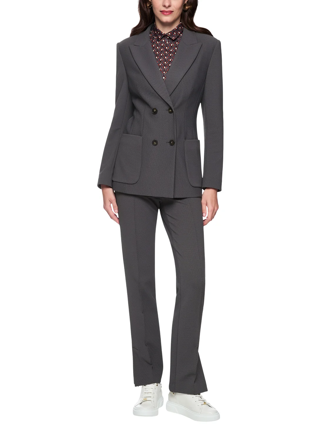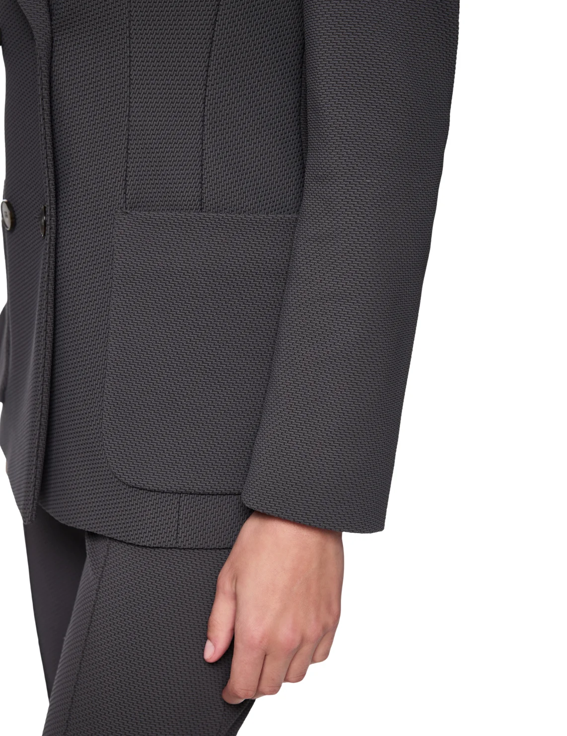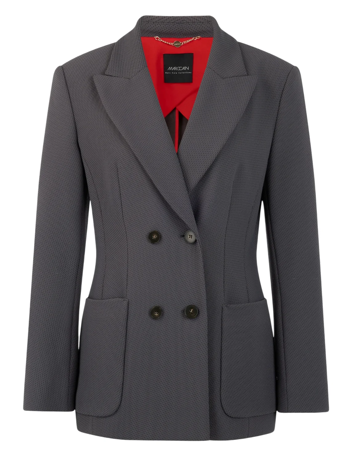 Двобортний піджак виготовлений з поліаміду та еластану, підкладка з поліестеру. Модель виконана в приталеному крої. Має відкладний комір з лацканами, розріз ззаду, передні накладні кишені та довгі рукави.