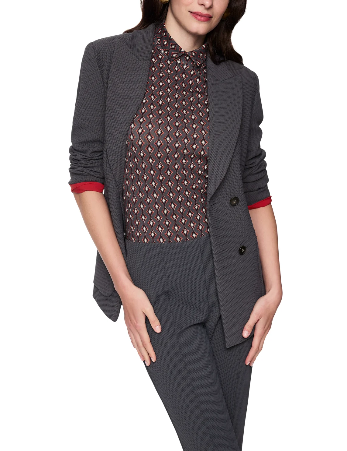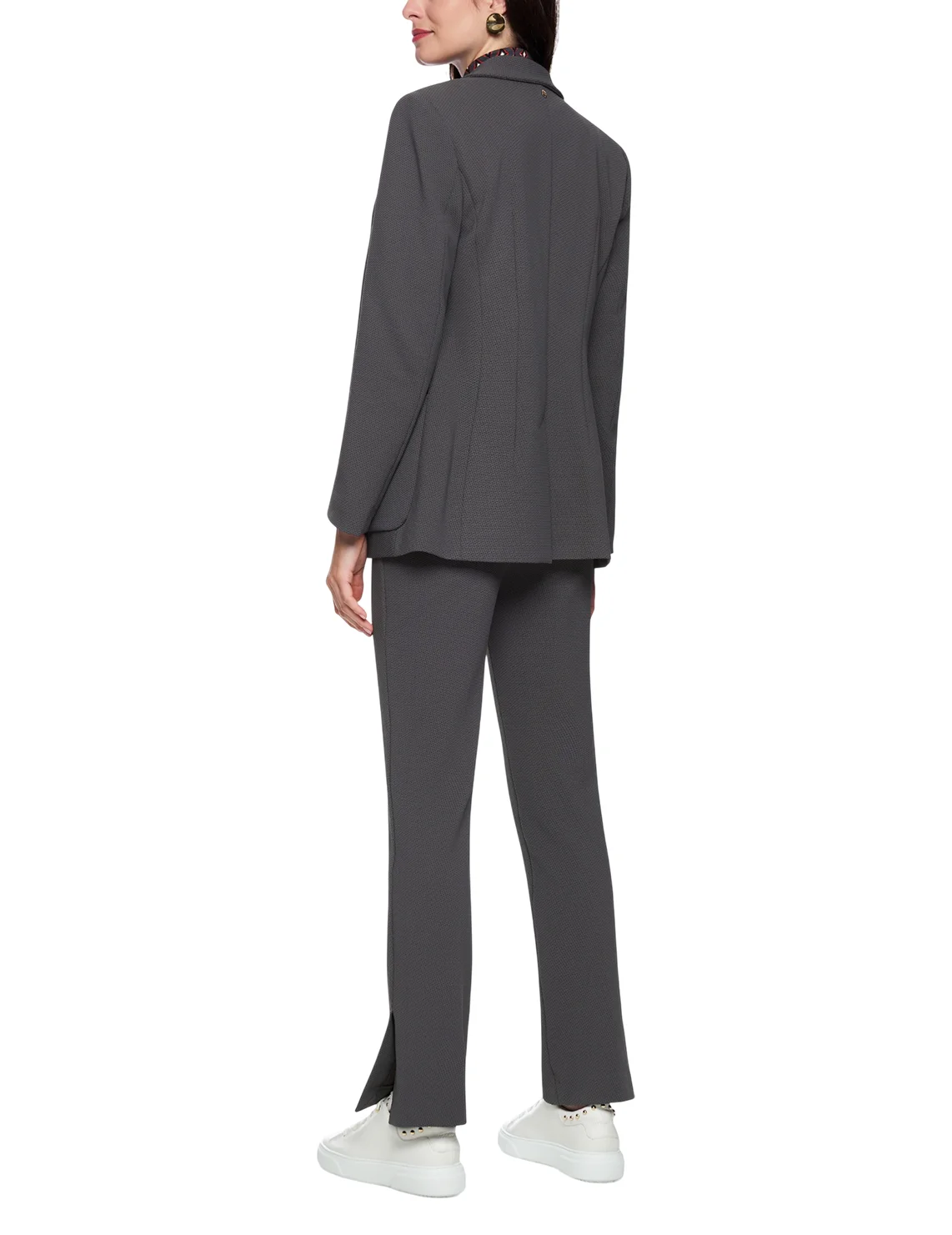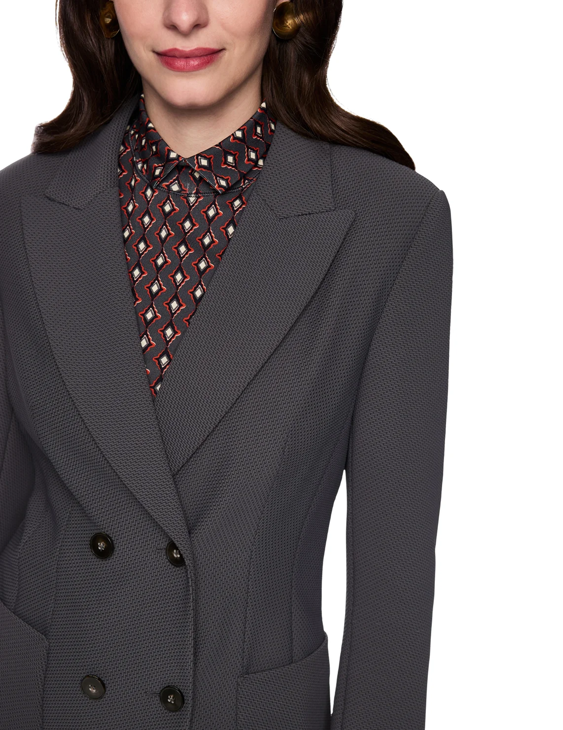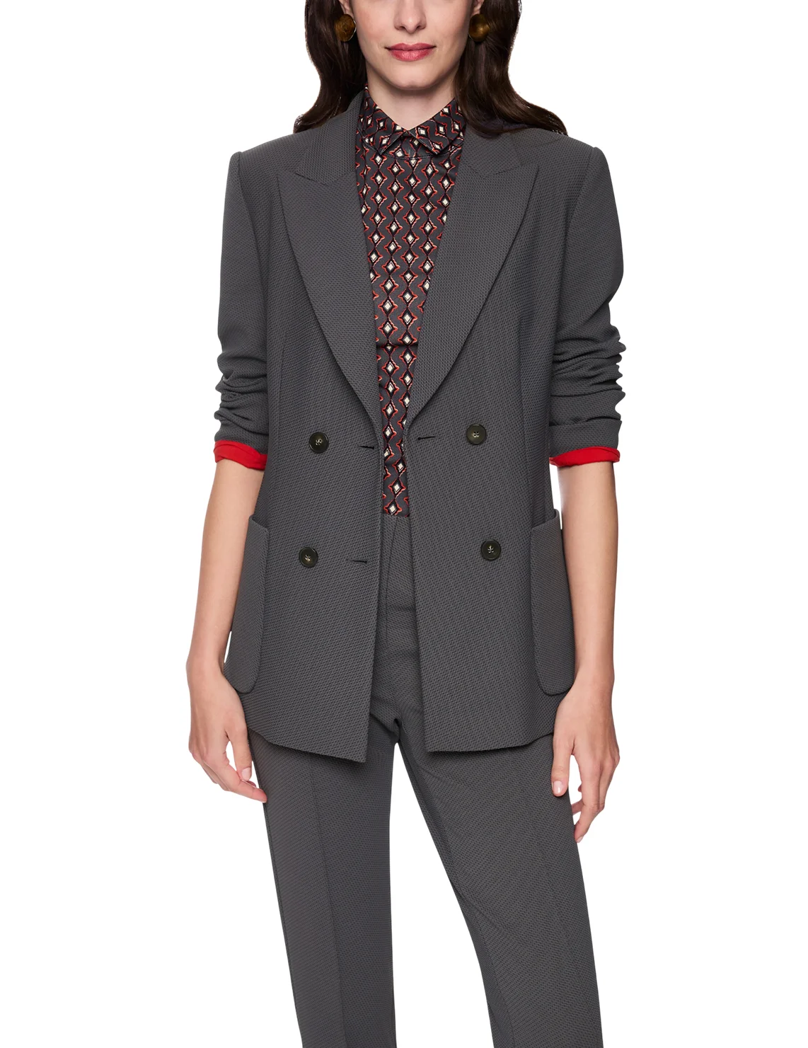 Двобортний піджак виготовлений з поліаміду та еластану, підкладка з поліестеру. Модель виконана в приталеному крої. Має відкладний комір з лацканами, розріз ззаду, передні накладні кишені та довгі рукави.