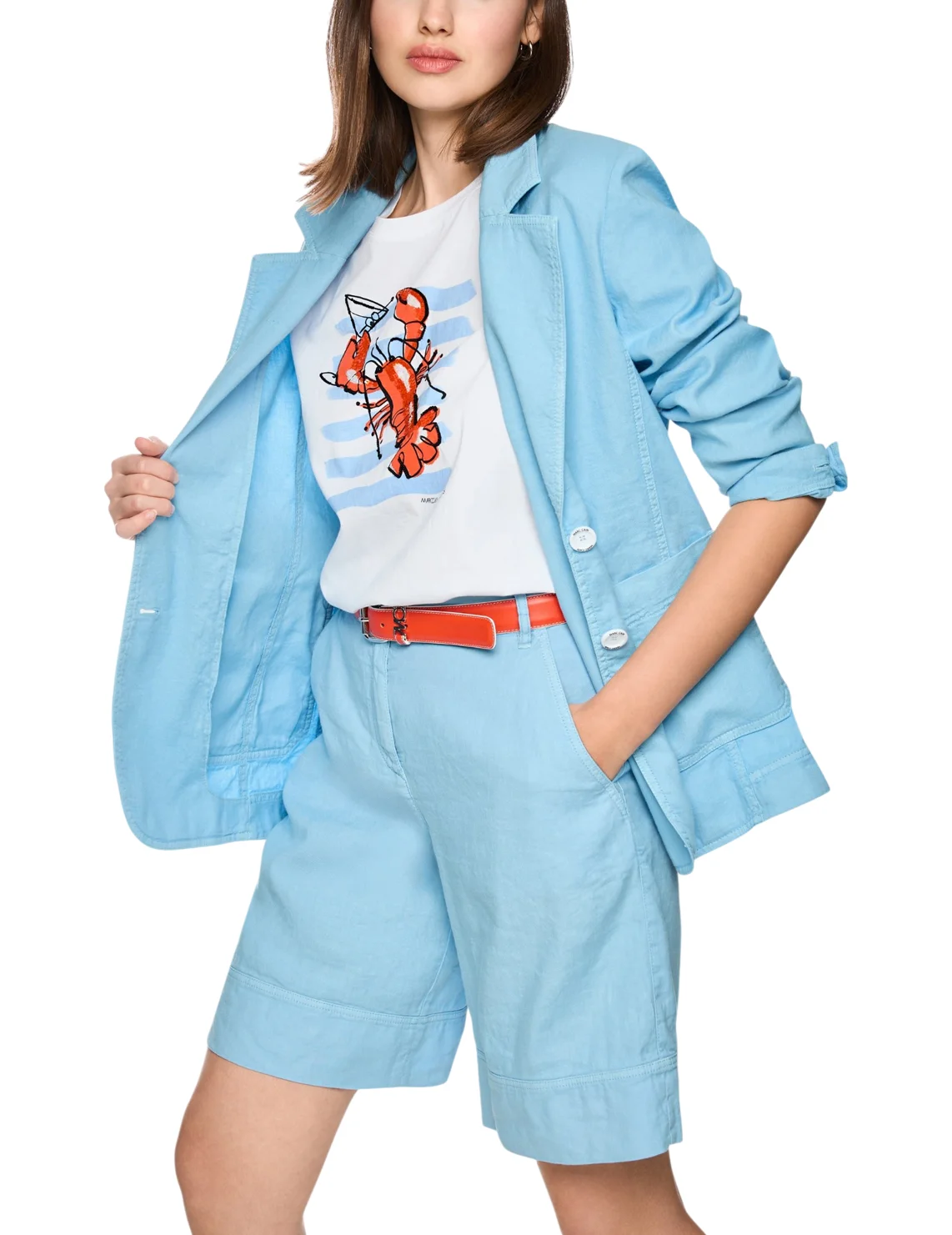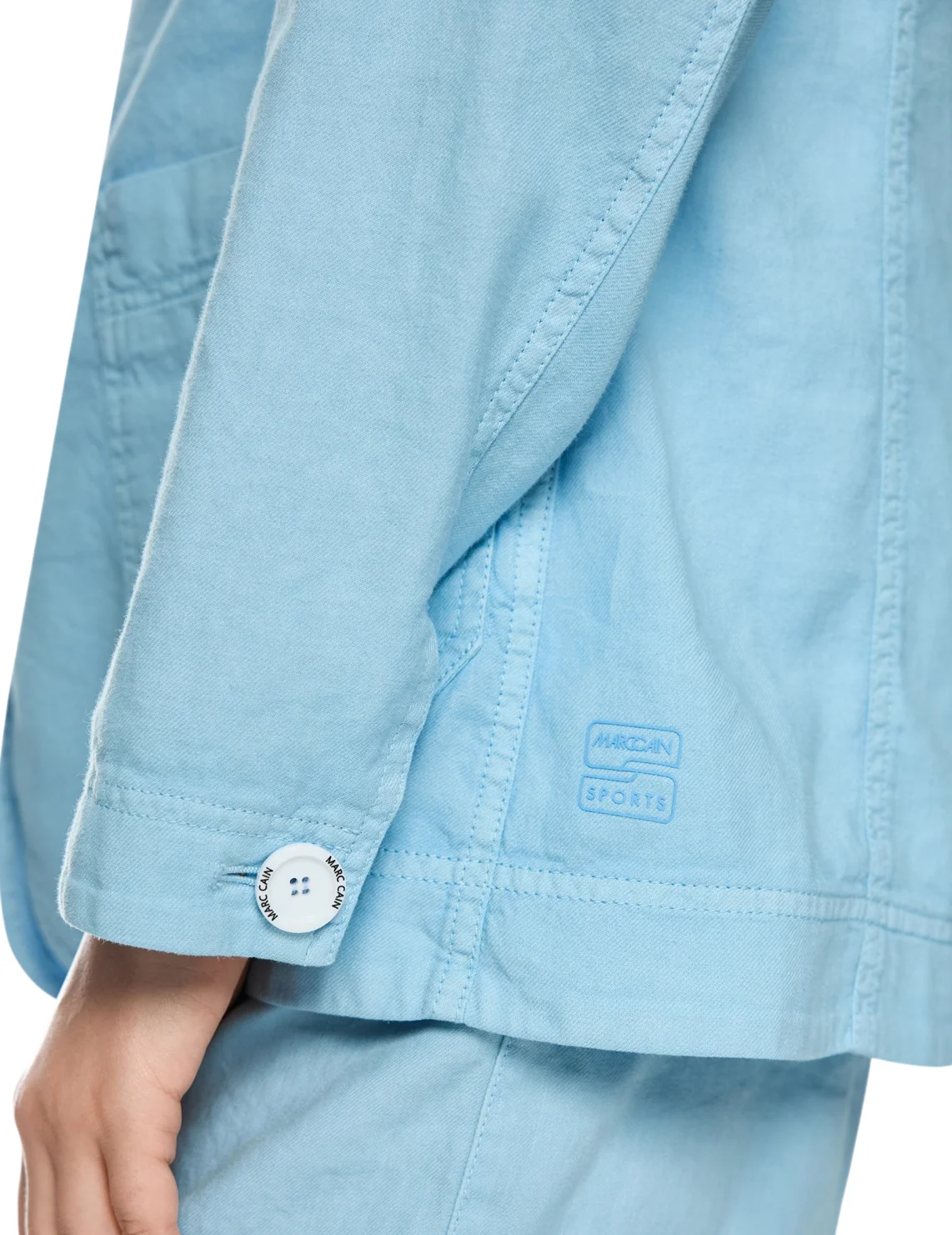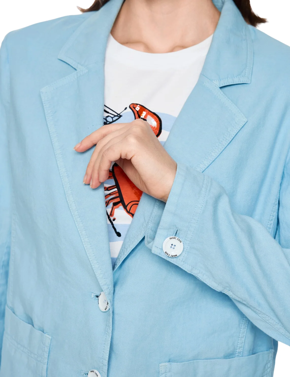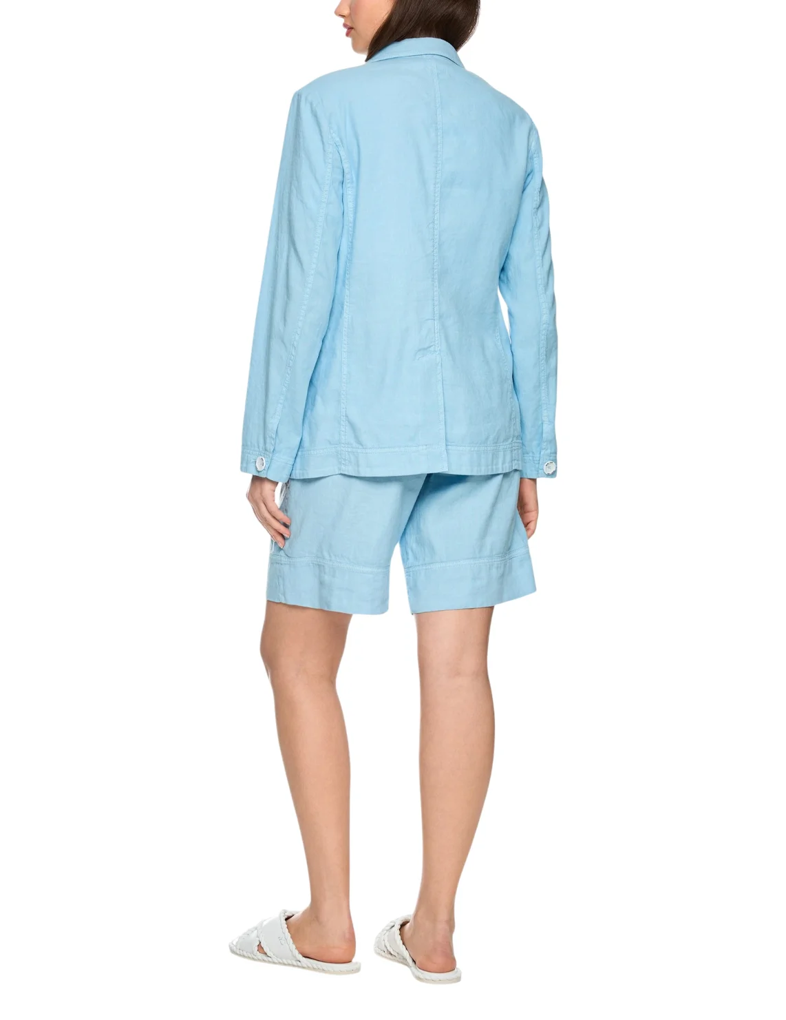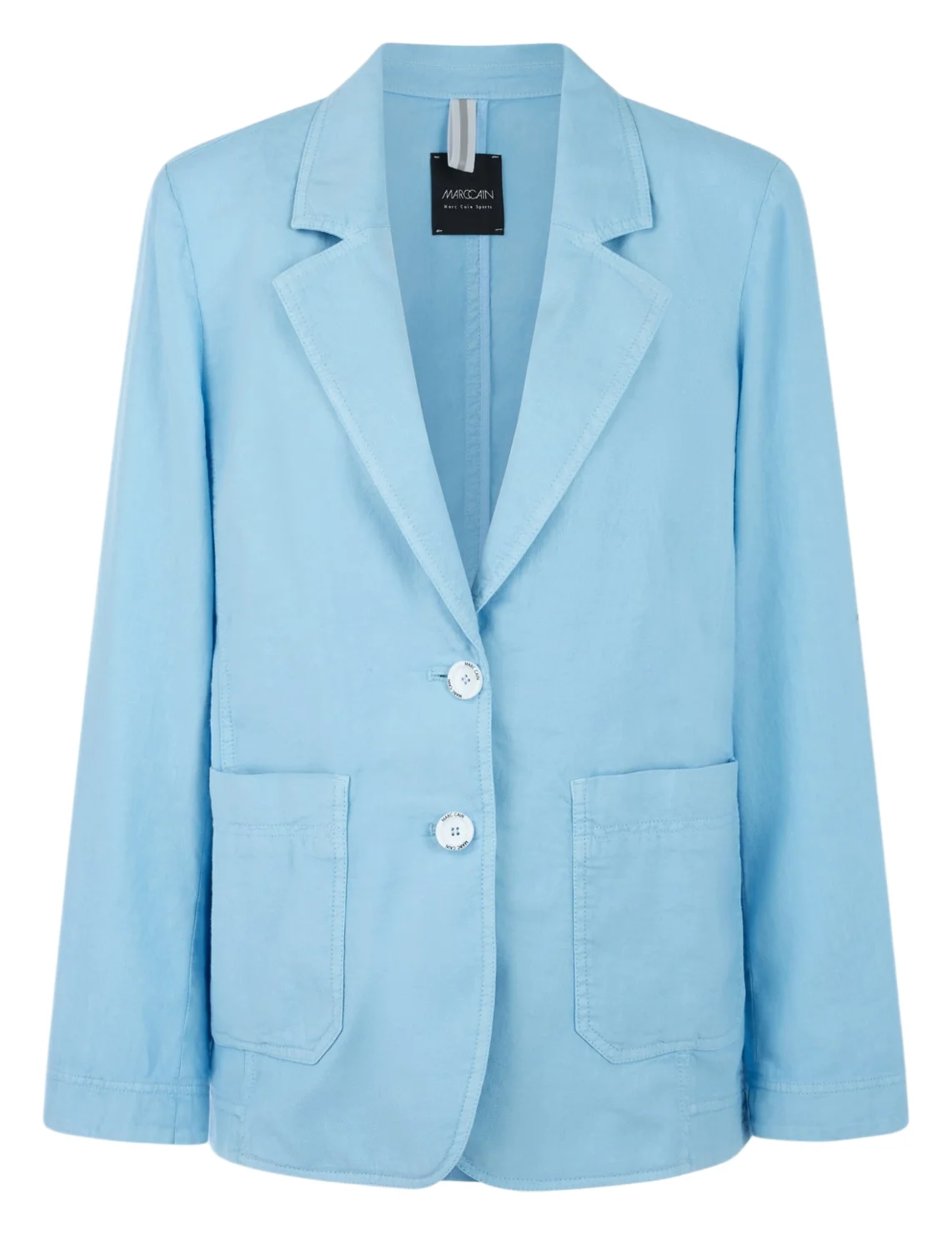 Однобортний піджак виготовлений з бавовни, льону та еластану. Модель прямого крою. Має відкладний комір з лацканами, довгі рукави, накладні кишені. Застібається на ґудзики.