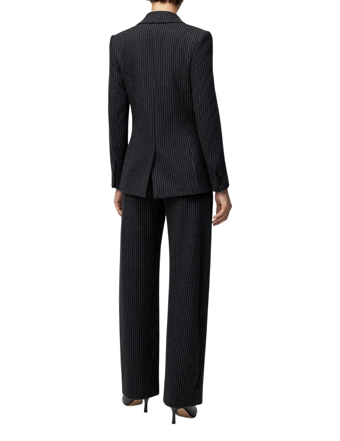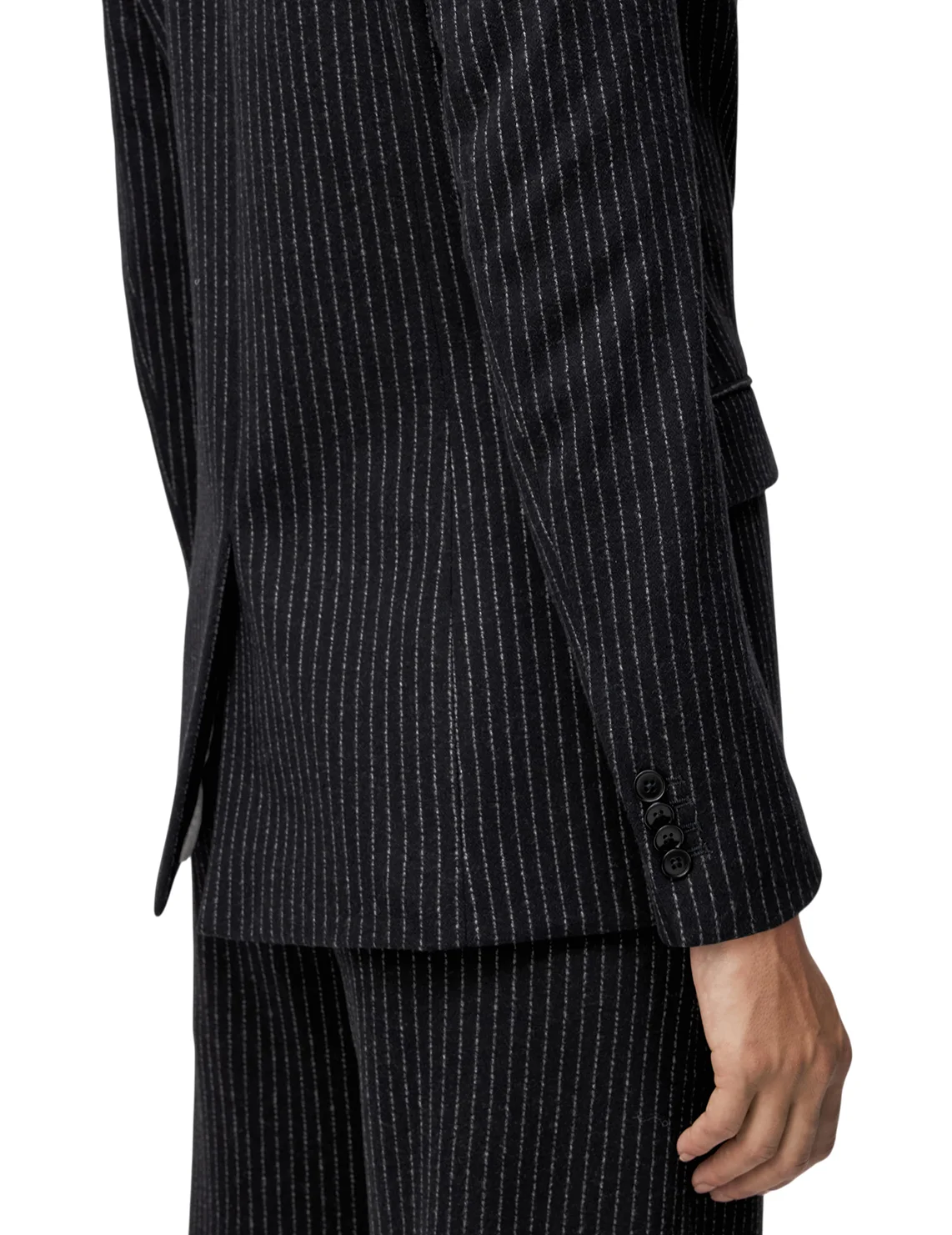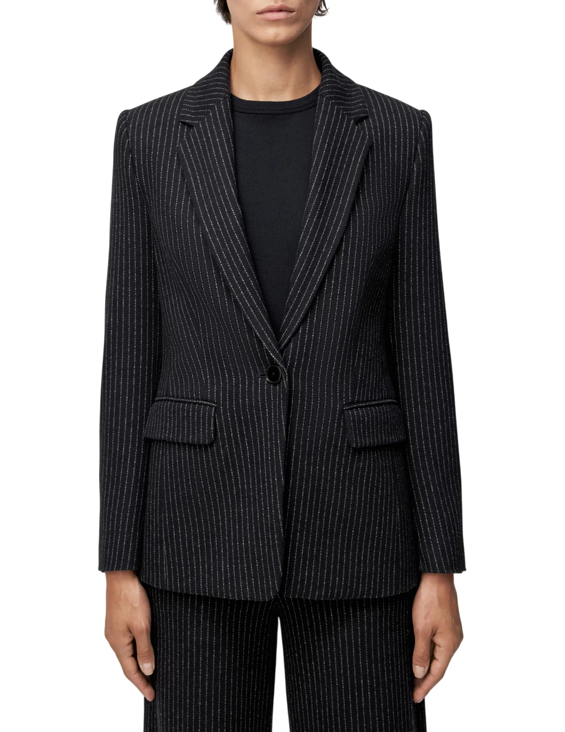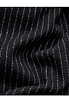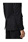 Піджак виготовлений з поліестеру, бавовни, віскози та еластану. Модель виконана в приталеному крої. Має відкладний комір з лацканами, довгі рукави, декоративні клапани та застібку на ґудзик. Декорований принтом у смужку.