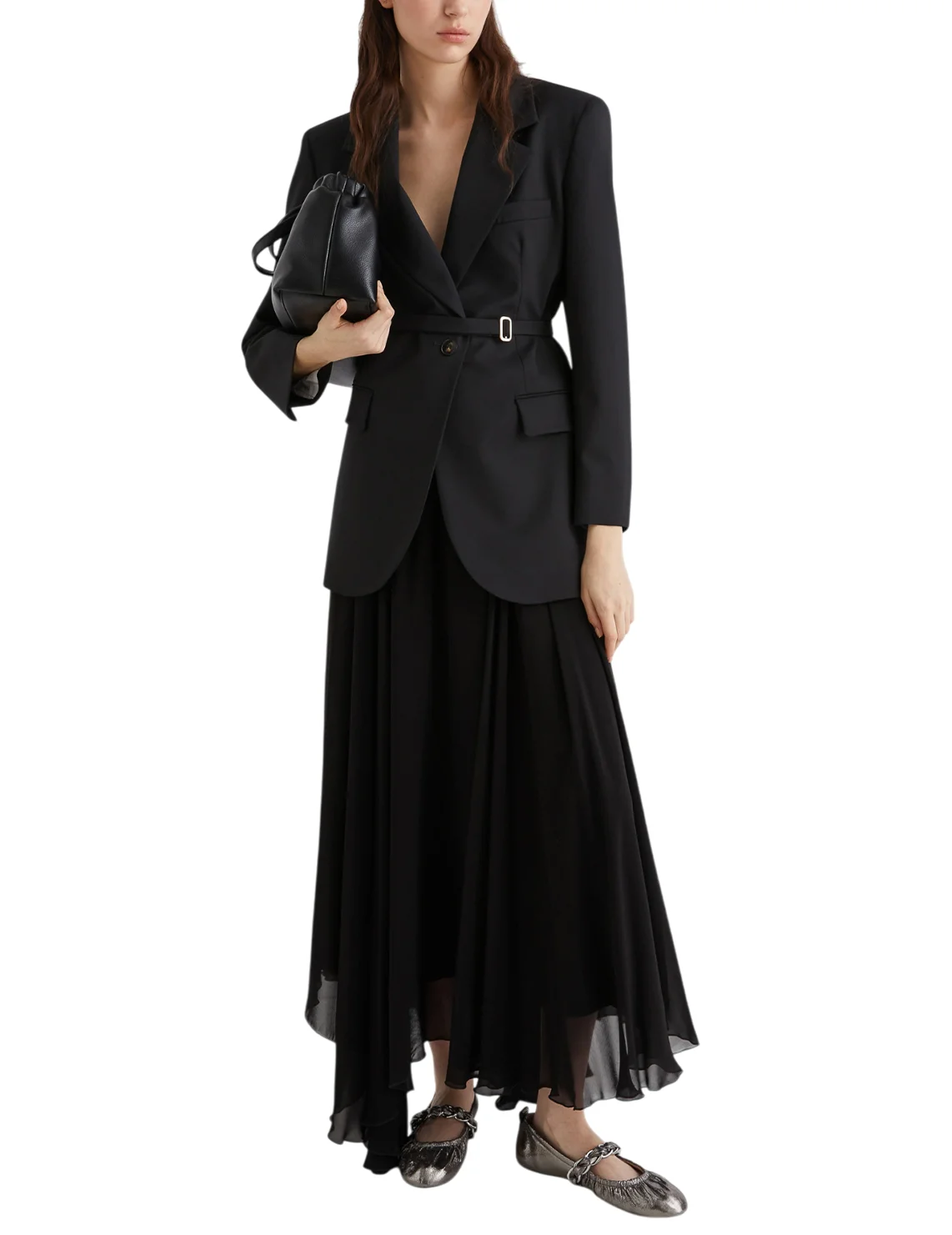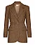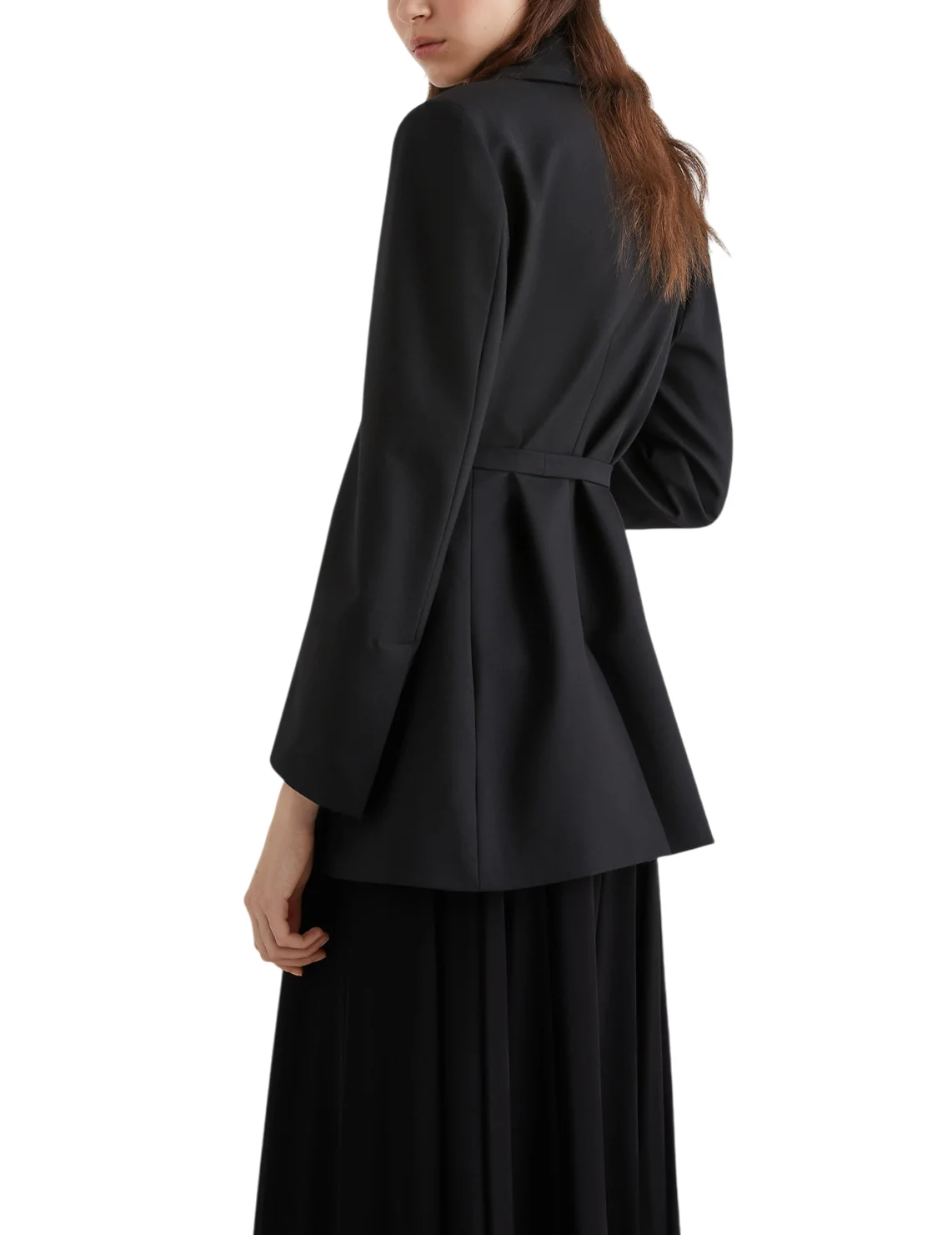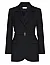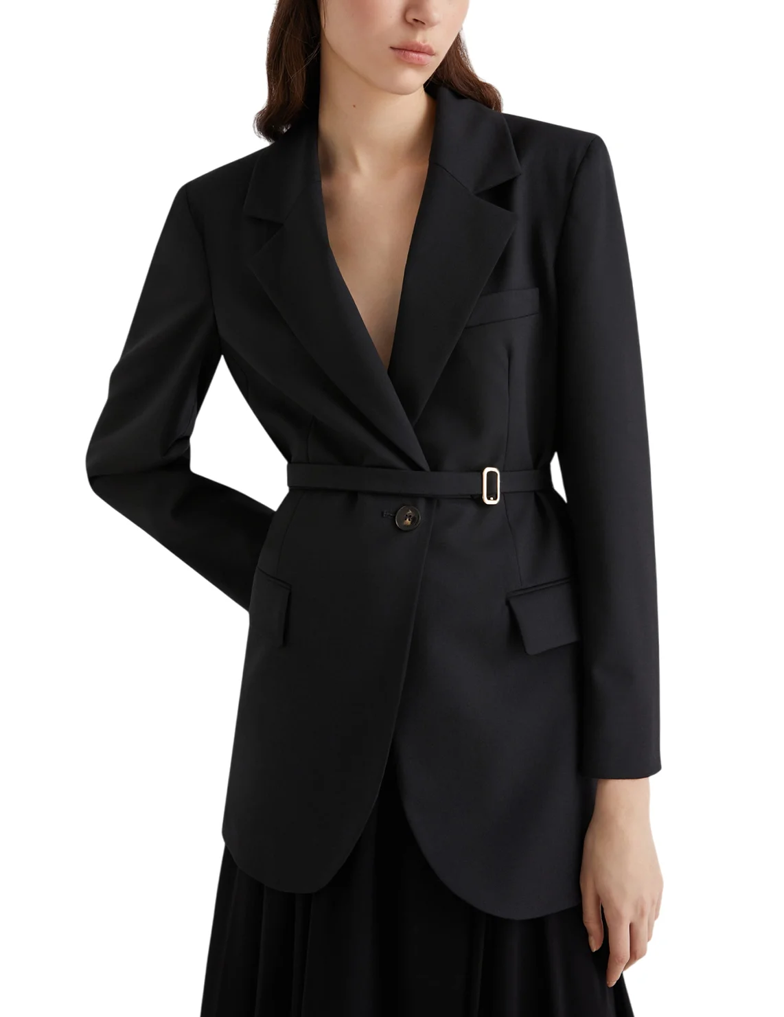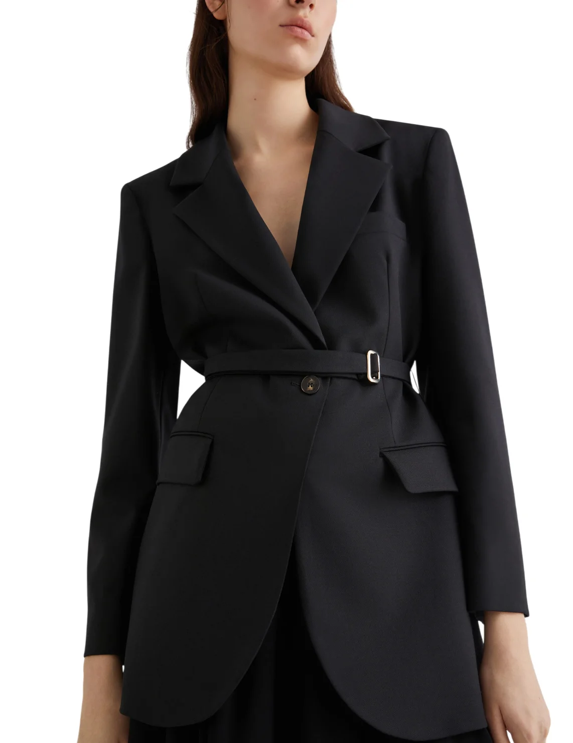 Однобортний піджак виготовлений з поліестеру, вовни та еластану, підкладка з ацетату та поліестеру. Модель прямого крою. Має відкладний комір з лацканами, довгі рукави, нагрудну прорізну кишеню, пояс у тон, розріз ззаду і передні кишені з клапанами.