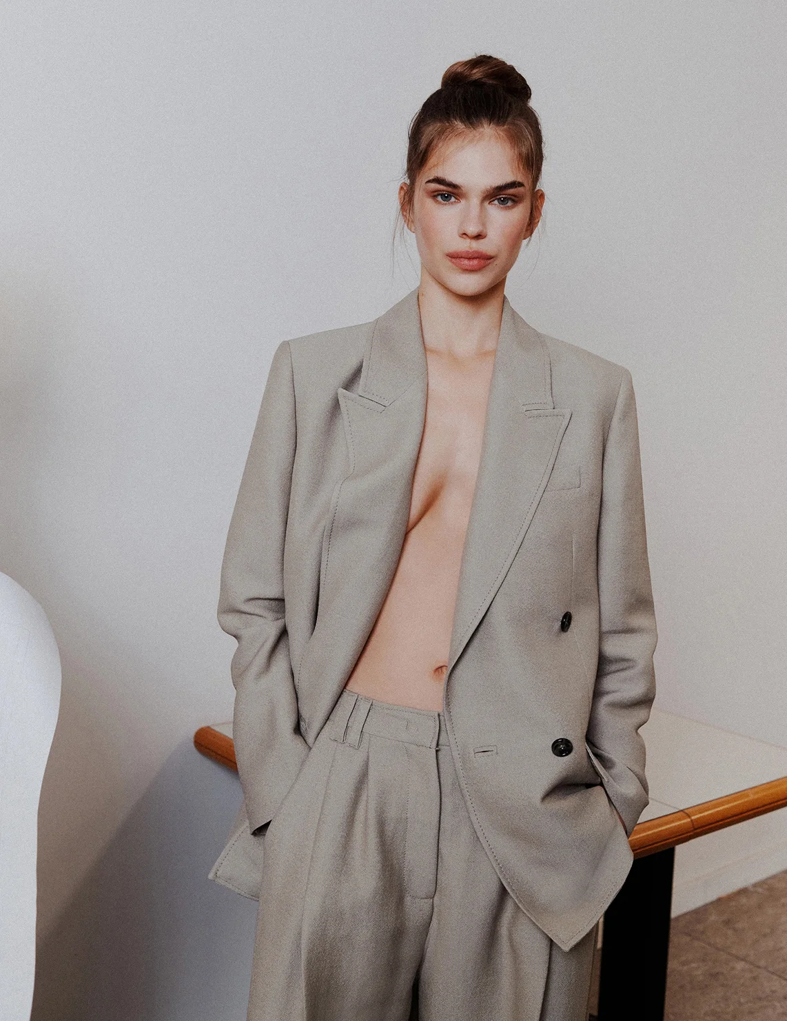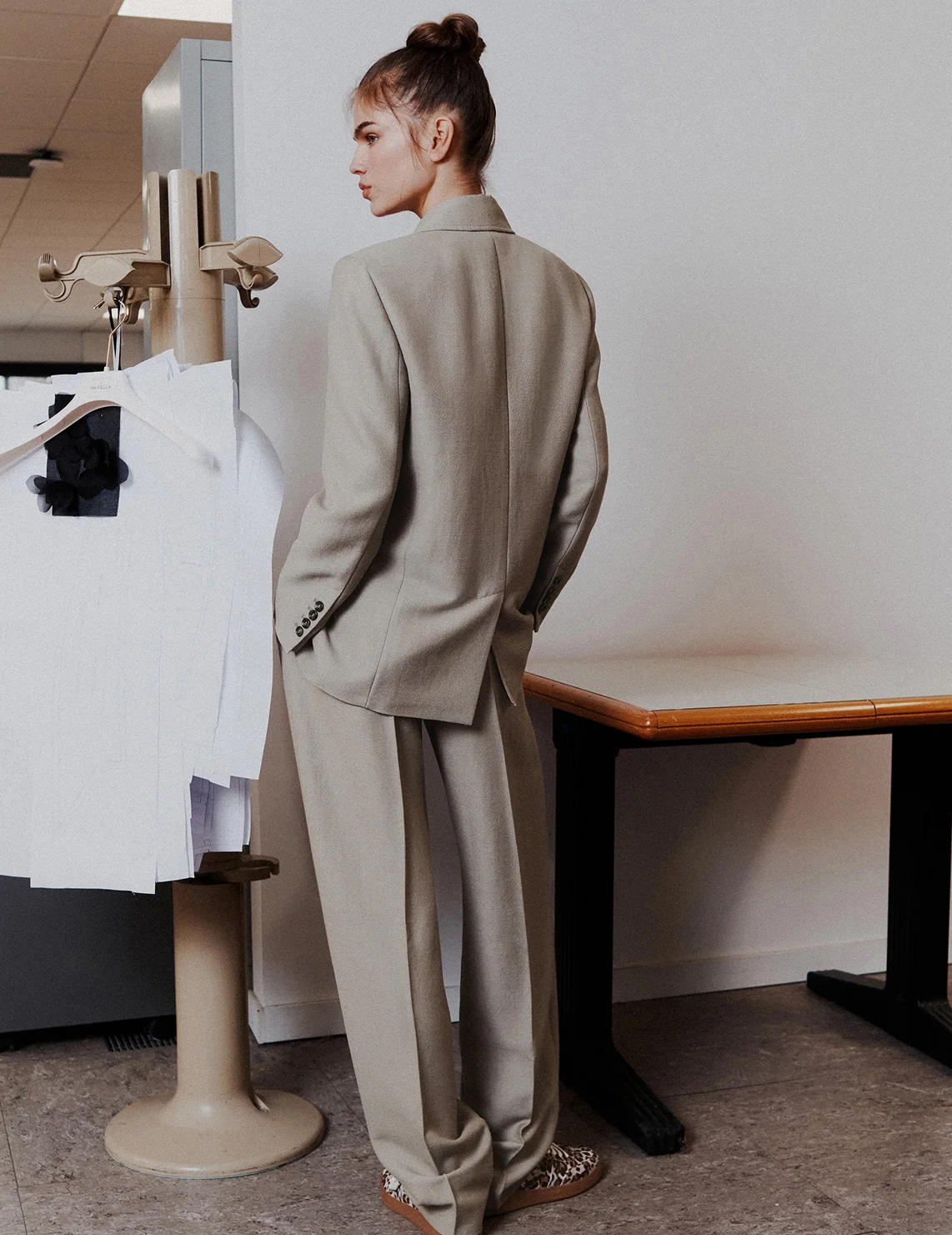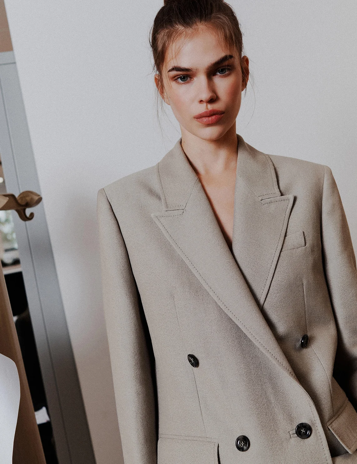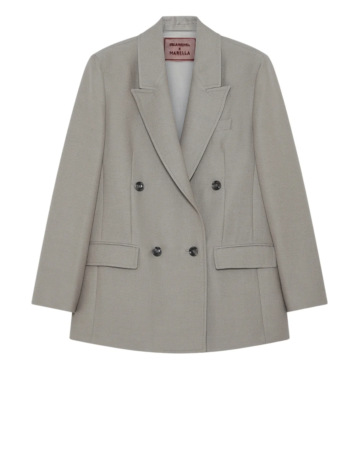 Двобортний піджак виготовлений з вовни та віскози, підкладка з віскози, поліаміду та еластану. Модель вільного крою. Має відкладний комір з лацканами, довгі рукави та декоративні клапани. Модель входить до спеціальної колекції Marella Codesign, створеної у співпраці зі Стеллою Максвелл.