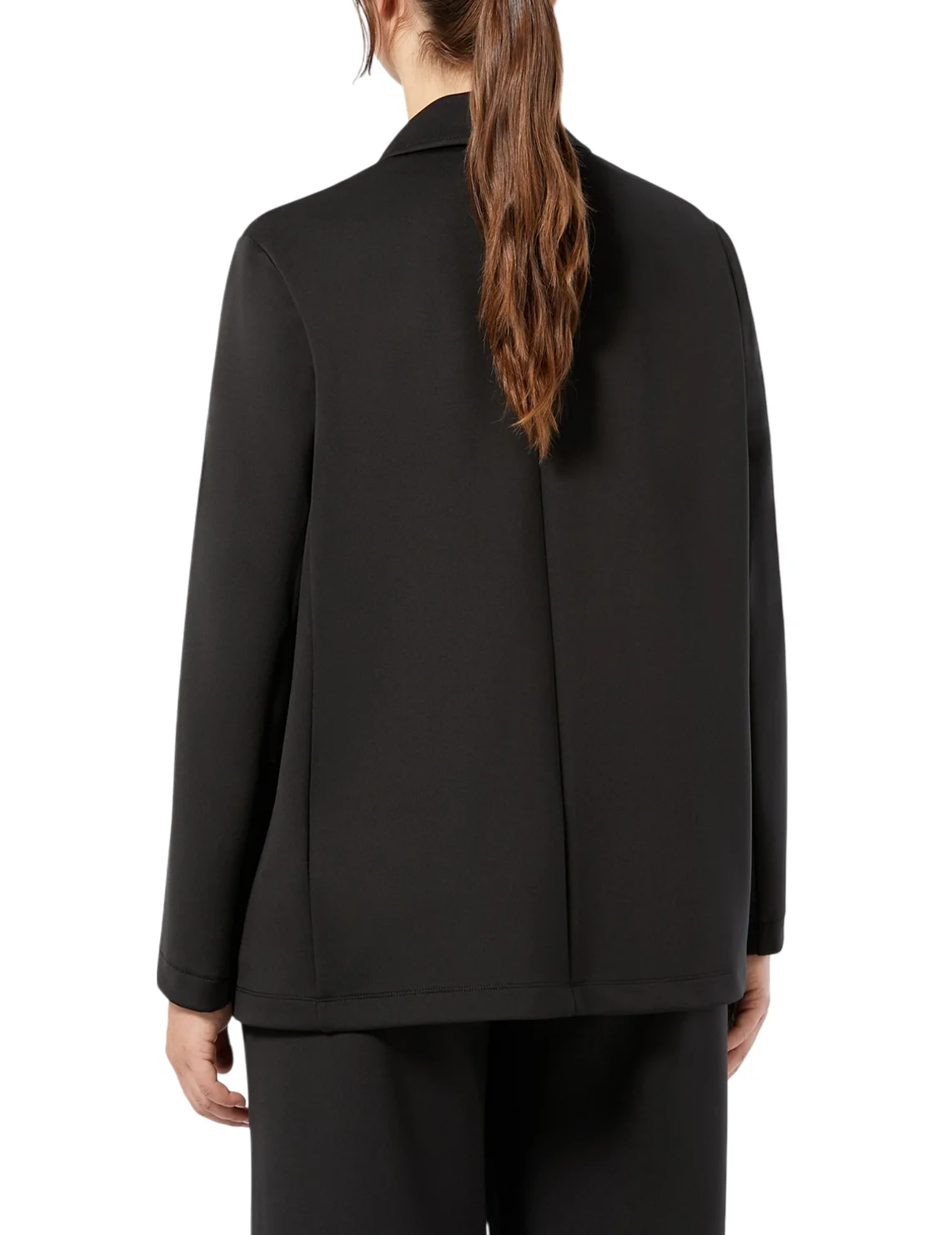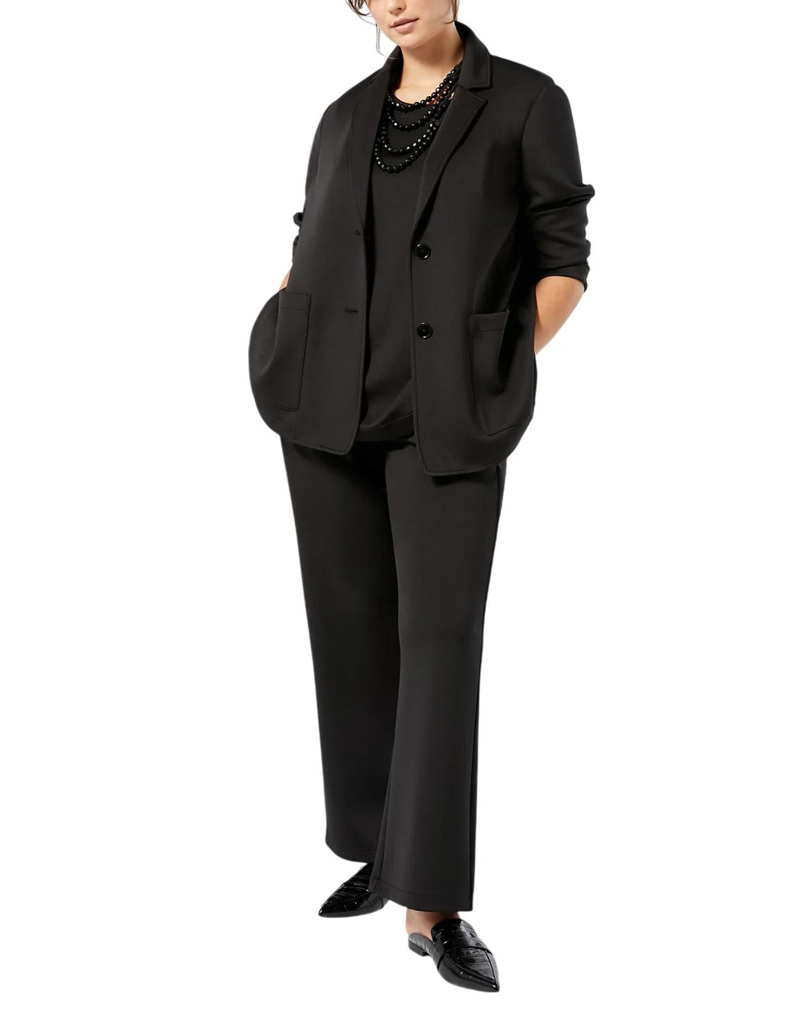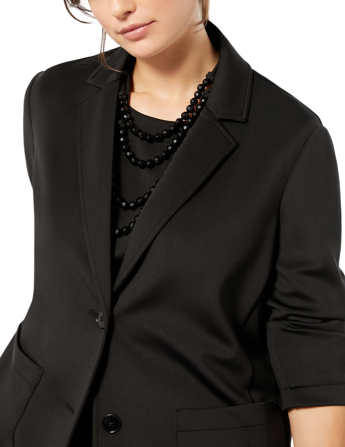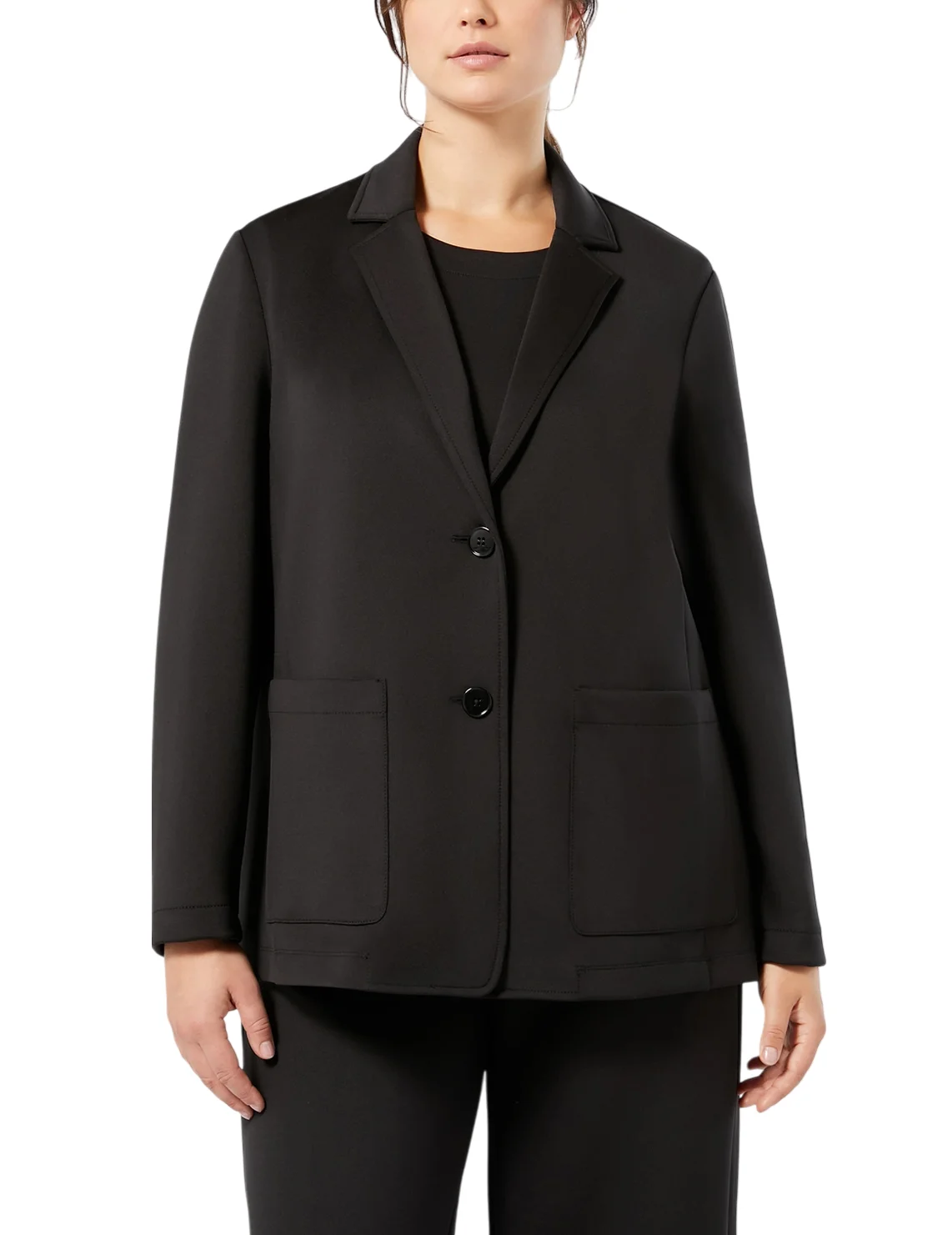 Однобортний піджак виготовлений з поліестеру, ліоцелу, поліаміду, еластану та віскози. Модель виконана в прямому крої. Має відкладний комір з лацканами, застібку на ґудзиках, довгі рукави та накладні кишені.