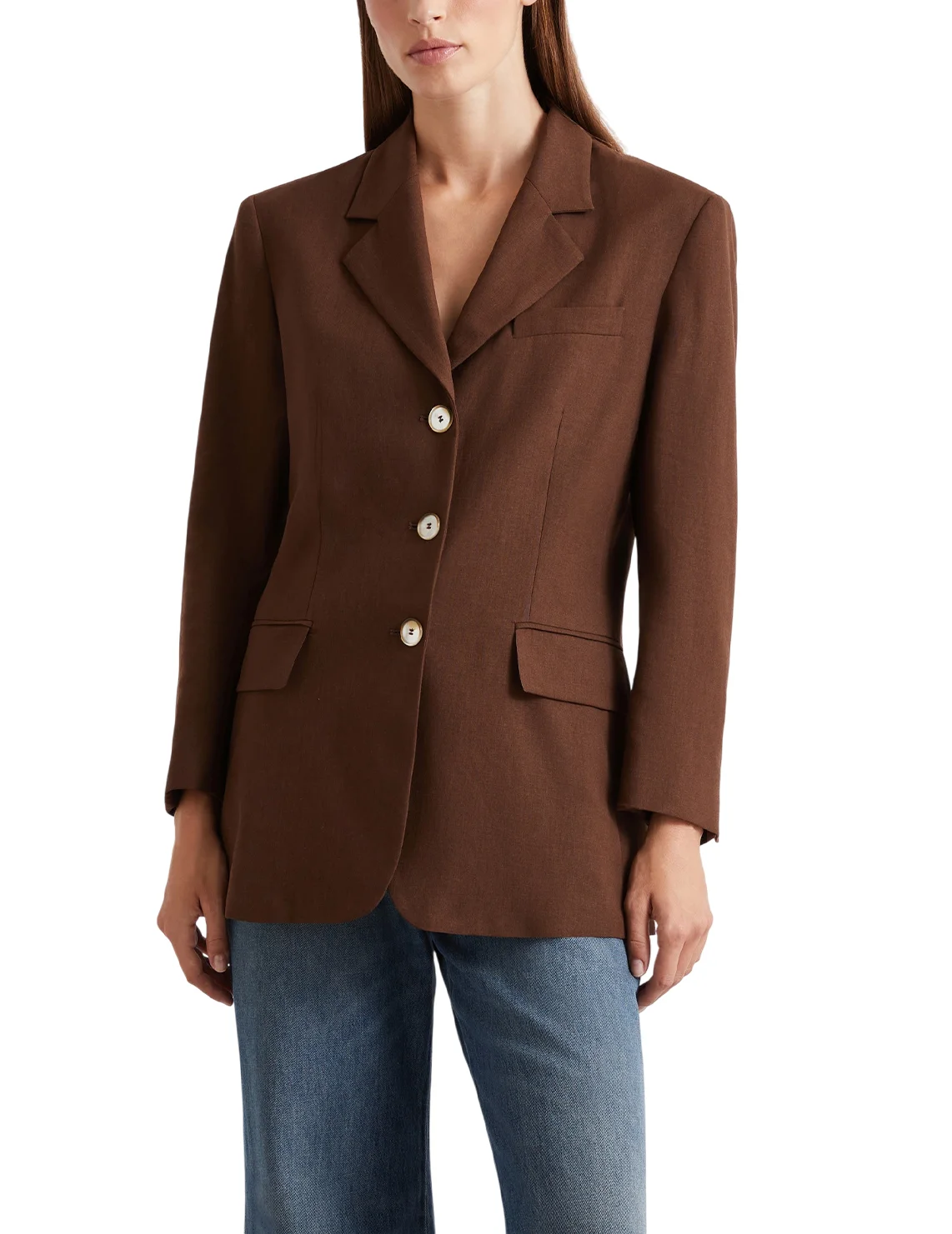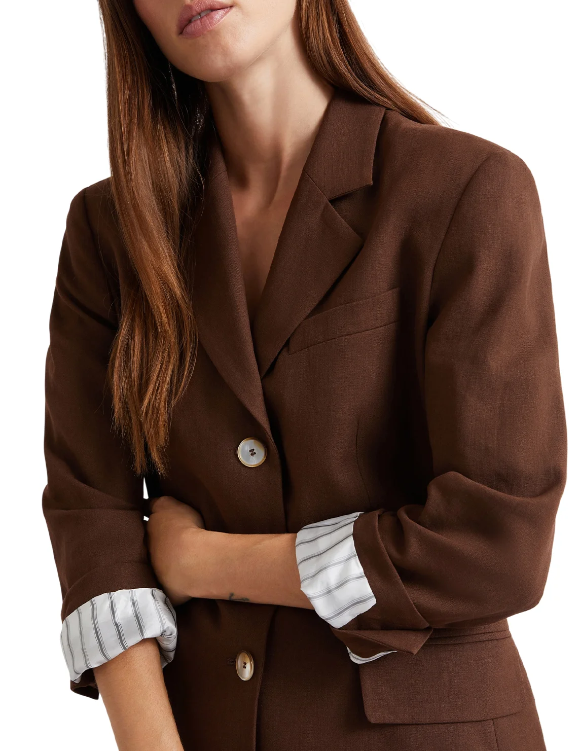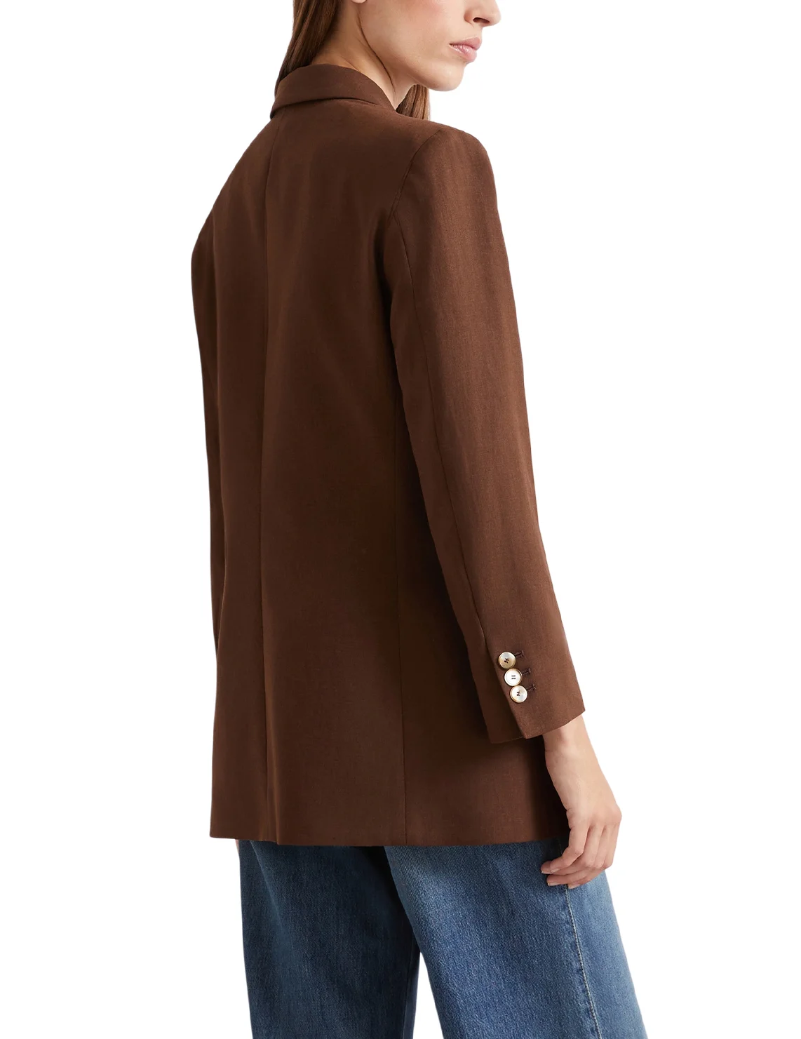 Піджак виготовлений з поліестеру і льону, підкладка з ацетату і віскози. Модель прямого крою. Має відкладний комір з лацканами, довгі рукави, нагрудну прорізну кишеню і передні кишені з клапанами.
