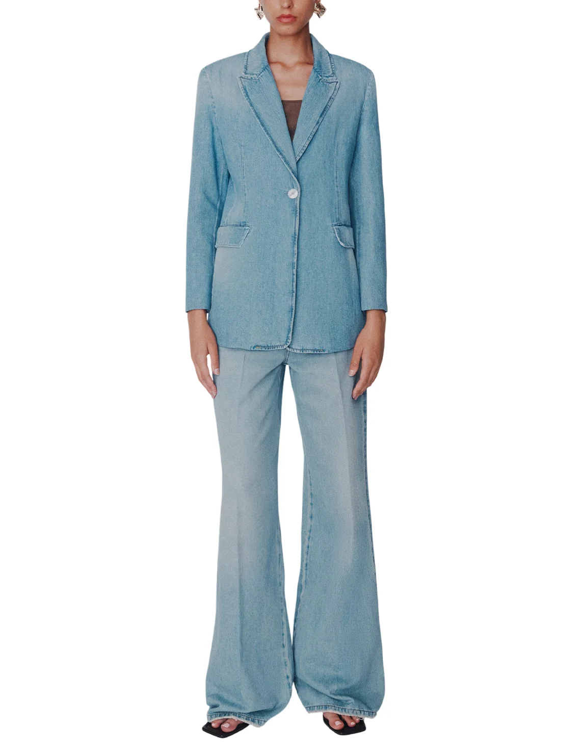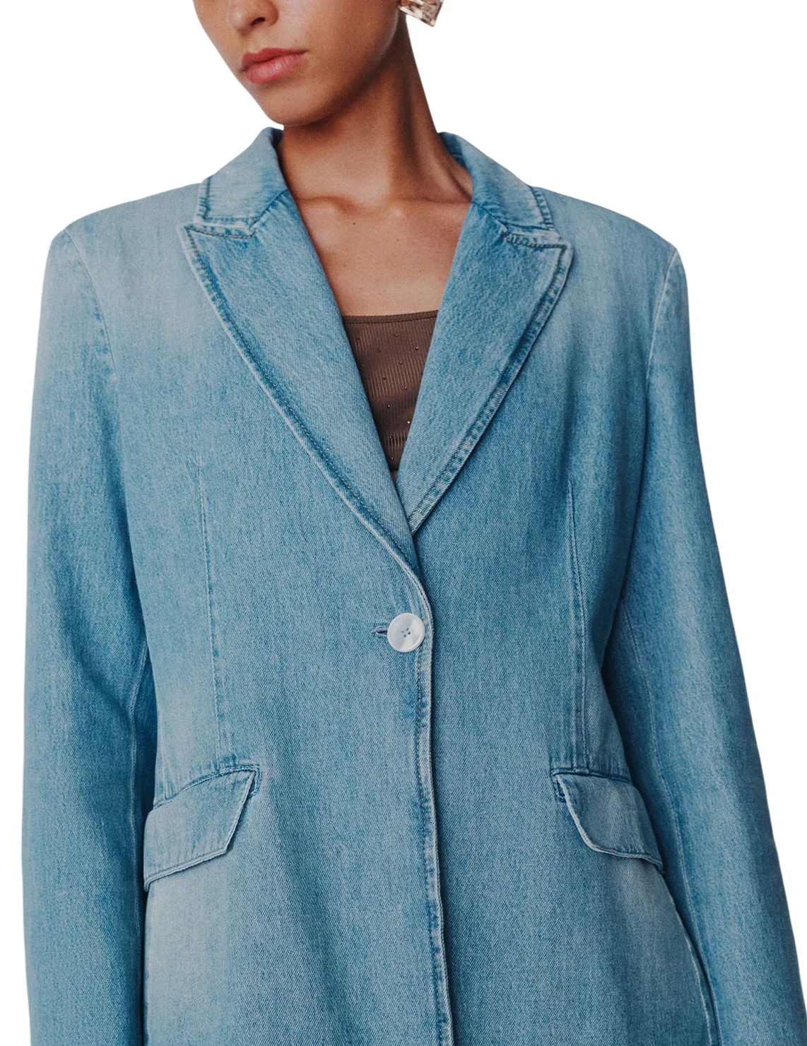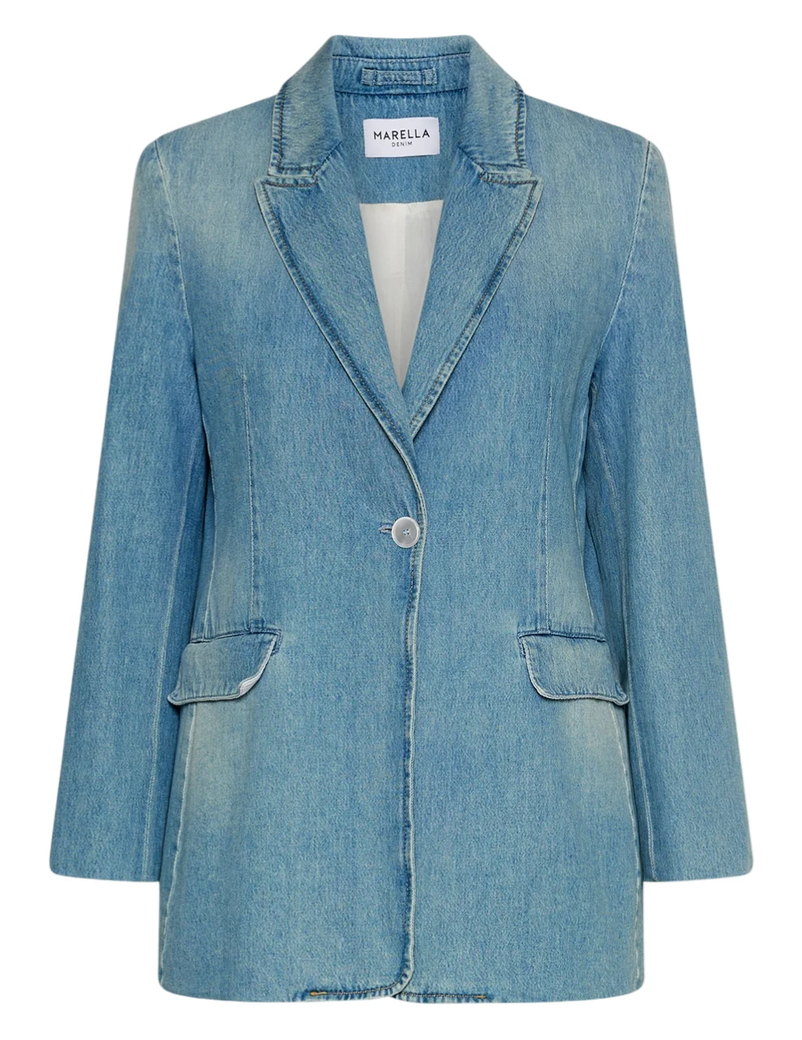 Джинсовий піджак виготовлений зі 100% бавовни високої якості, підкладка з ацетату і віскози. Модель виконана в приталеному крої. Має відкладний комір з лацканами, застібку на ґудзику, довгі рукави та бічні кишені з клапанами.