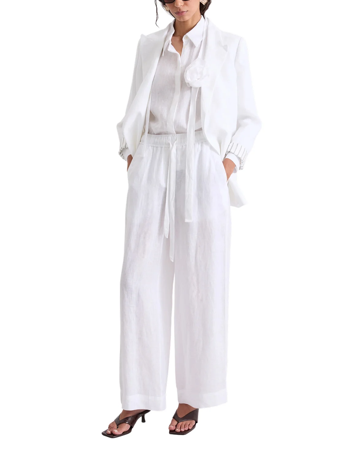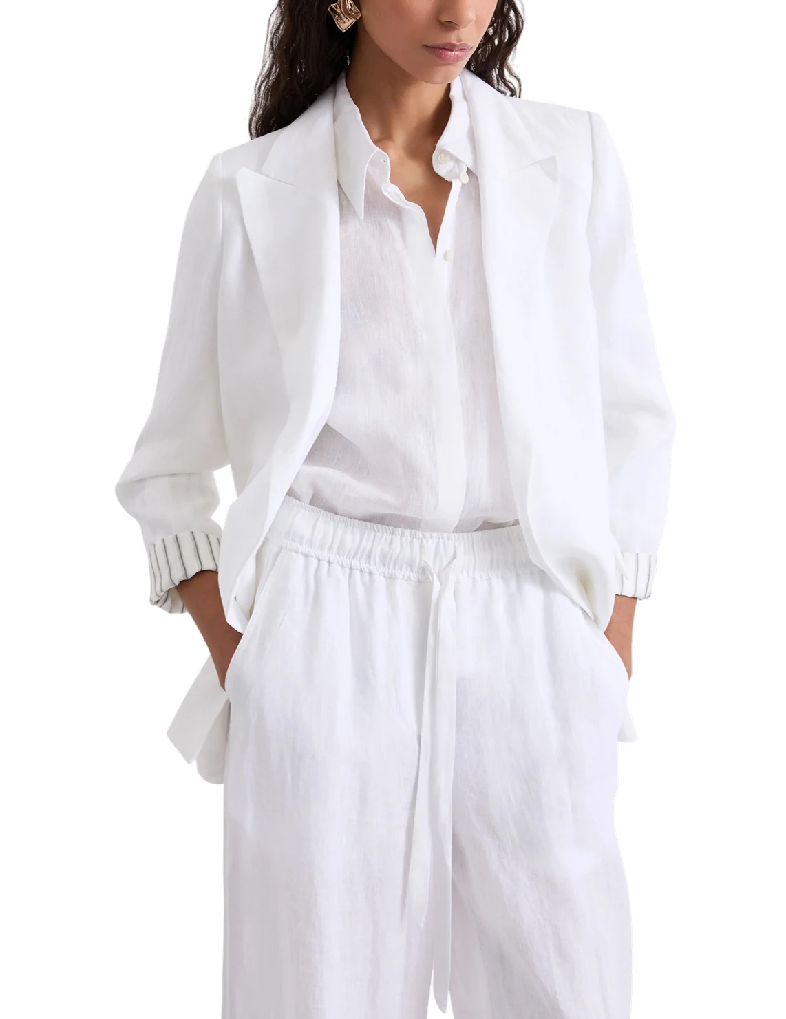 Піджак виготовлений зі 100% льону високої якості, підкладка з ацетату та віскози. Модель виконана в прямому крої. Має відкладний комір з лацканами, рукави довжиною 3/4 з відворотами та бічні кишені з клапанами.