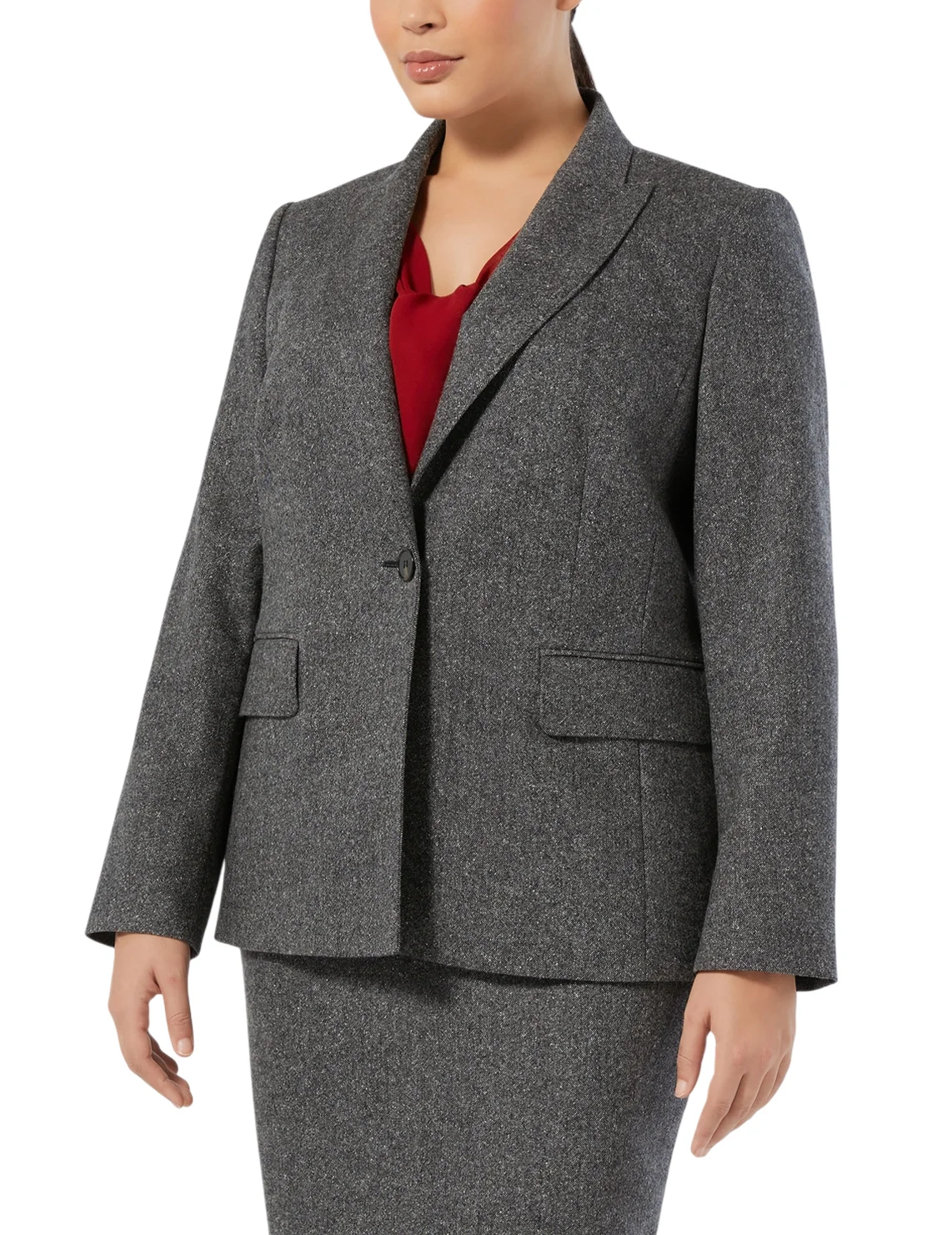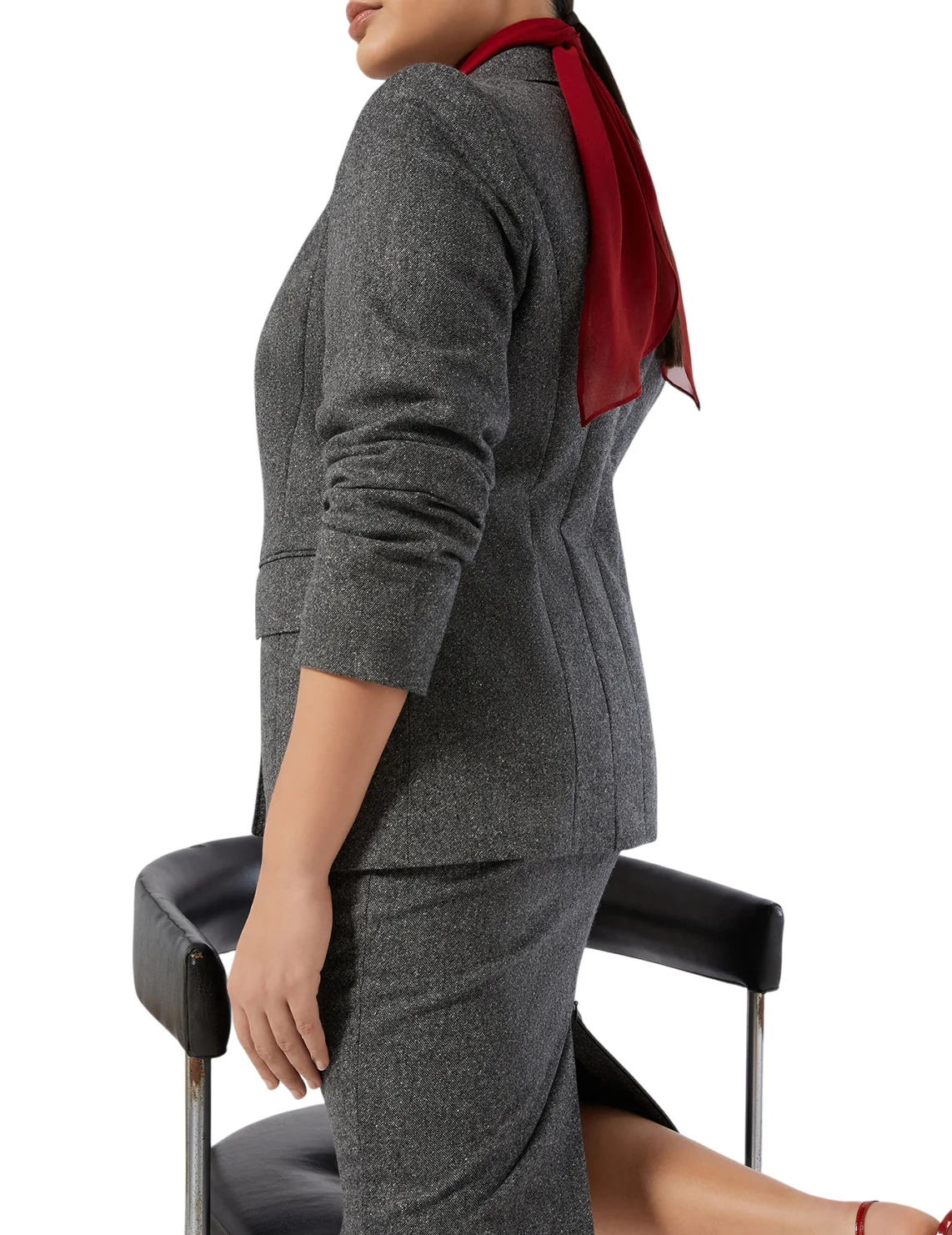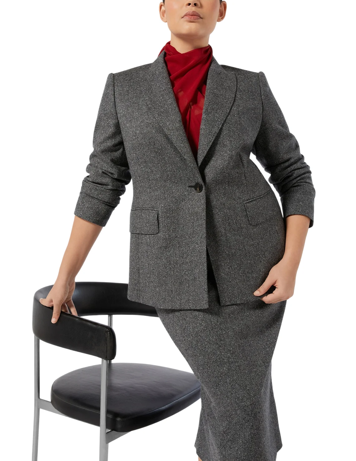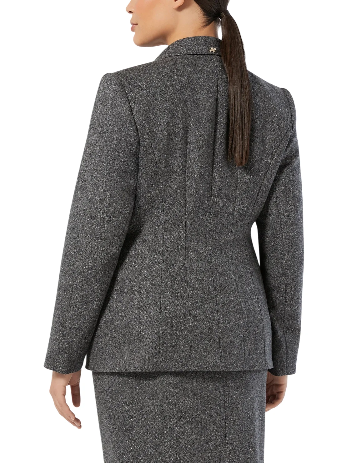Однобортний піджак виготовлений з вовни, поліаміду, шовку та еластану. Модель приталеного крою. Має відкладний комір з лацканами, довгі рукави та прорізні кишені з клапанами.