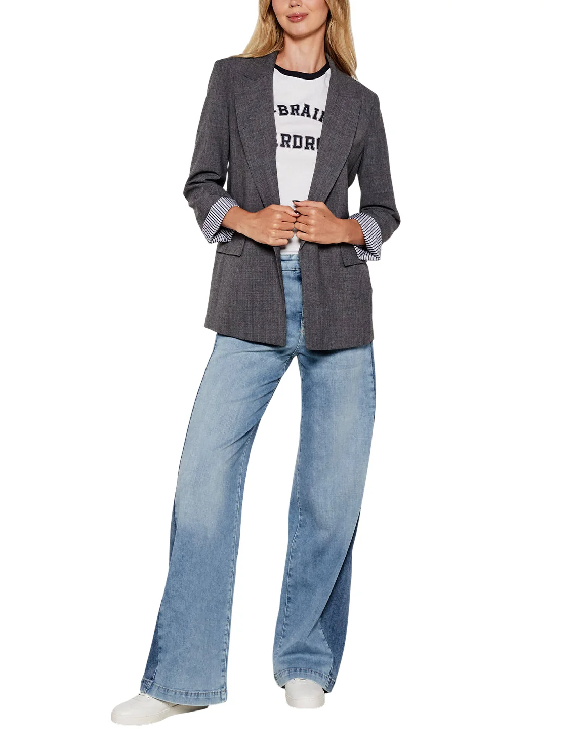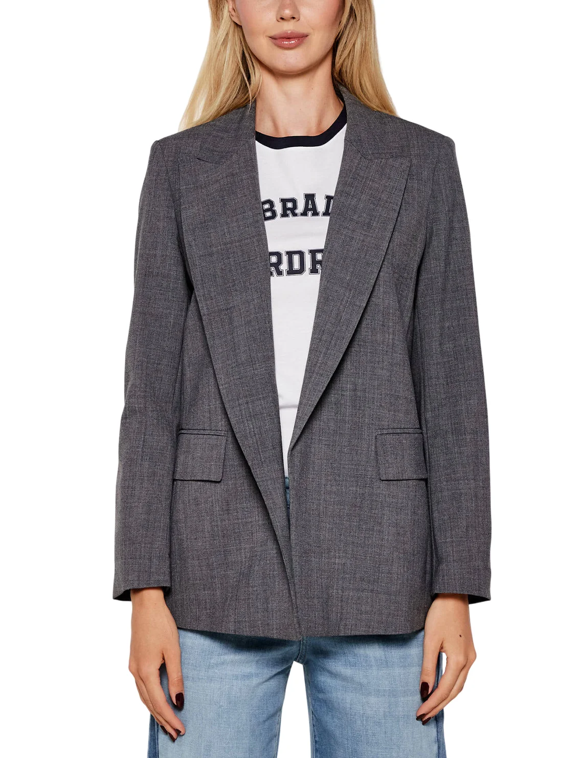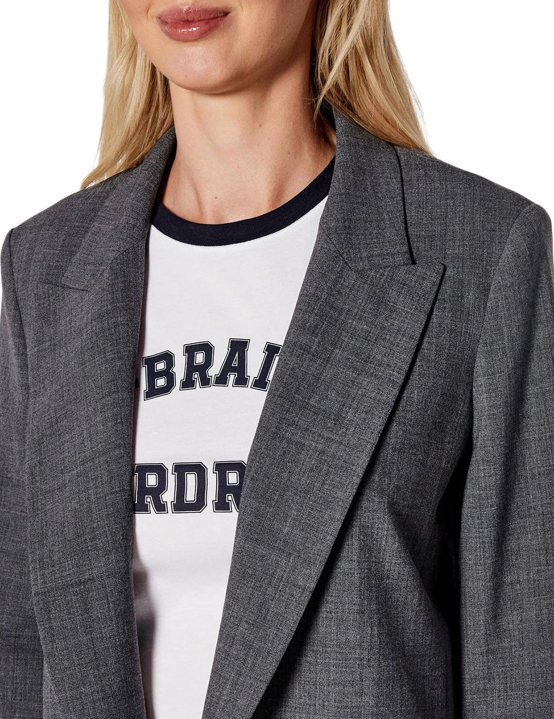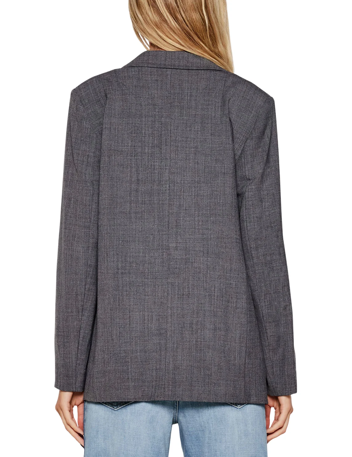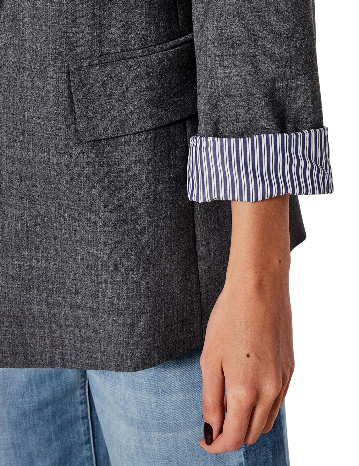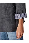 Піджак виготовлений з поліестеру, вовни та еластану, підкладка з ацетату та поліестеру. Модель виконана в прямому крої. Має відкладний комір з лацканами, передні прорізні кишені з клапанами та довгі рукави.
