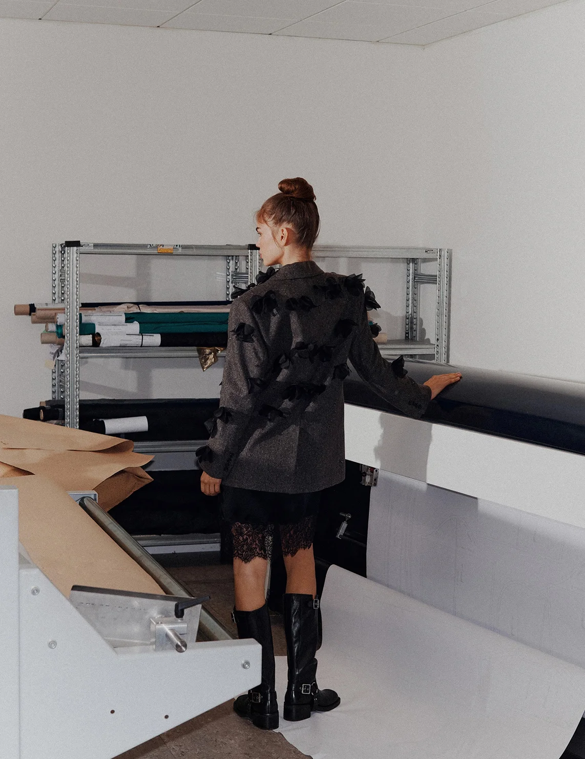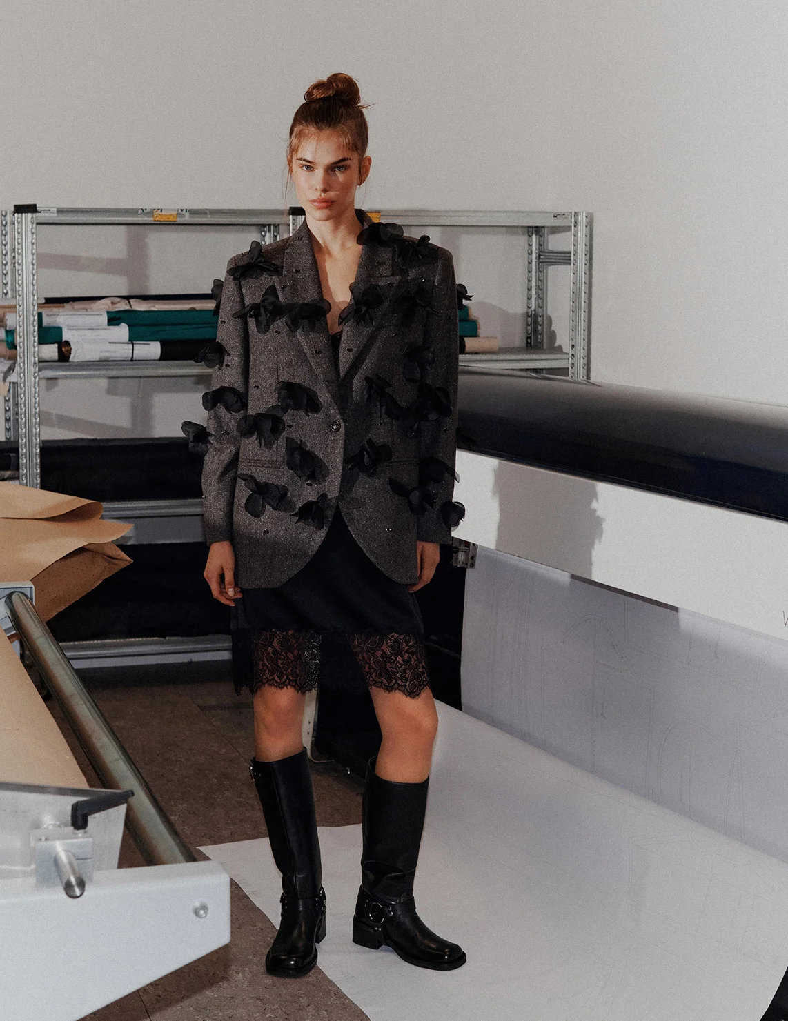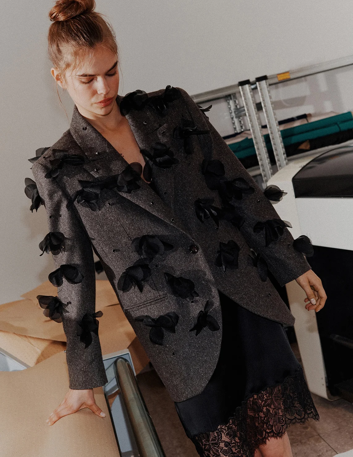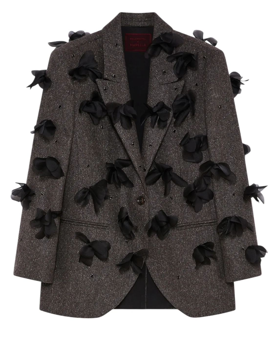Однобортний піджак виготовлений з вовни, поліаміду, шовку та еластану, підкладка з віскози, поліаміду та еластану. Модель вільного крою. Має відкладний комір з лацканами та довгі рукави. Декорований стразами та аплікаціями у вигляді квіток. Модель входить до спеціальної колекції Marella Codesign, створеної у співпраці зі Стеллою Максвелл.