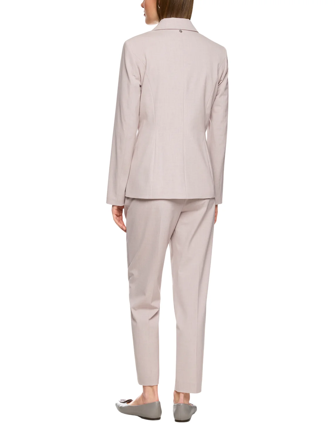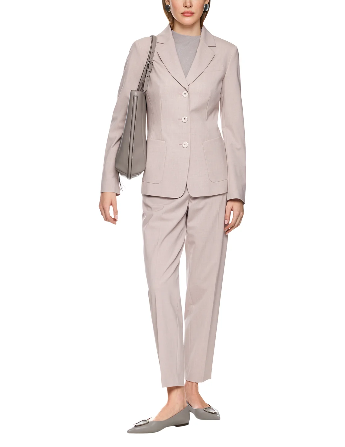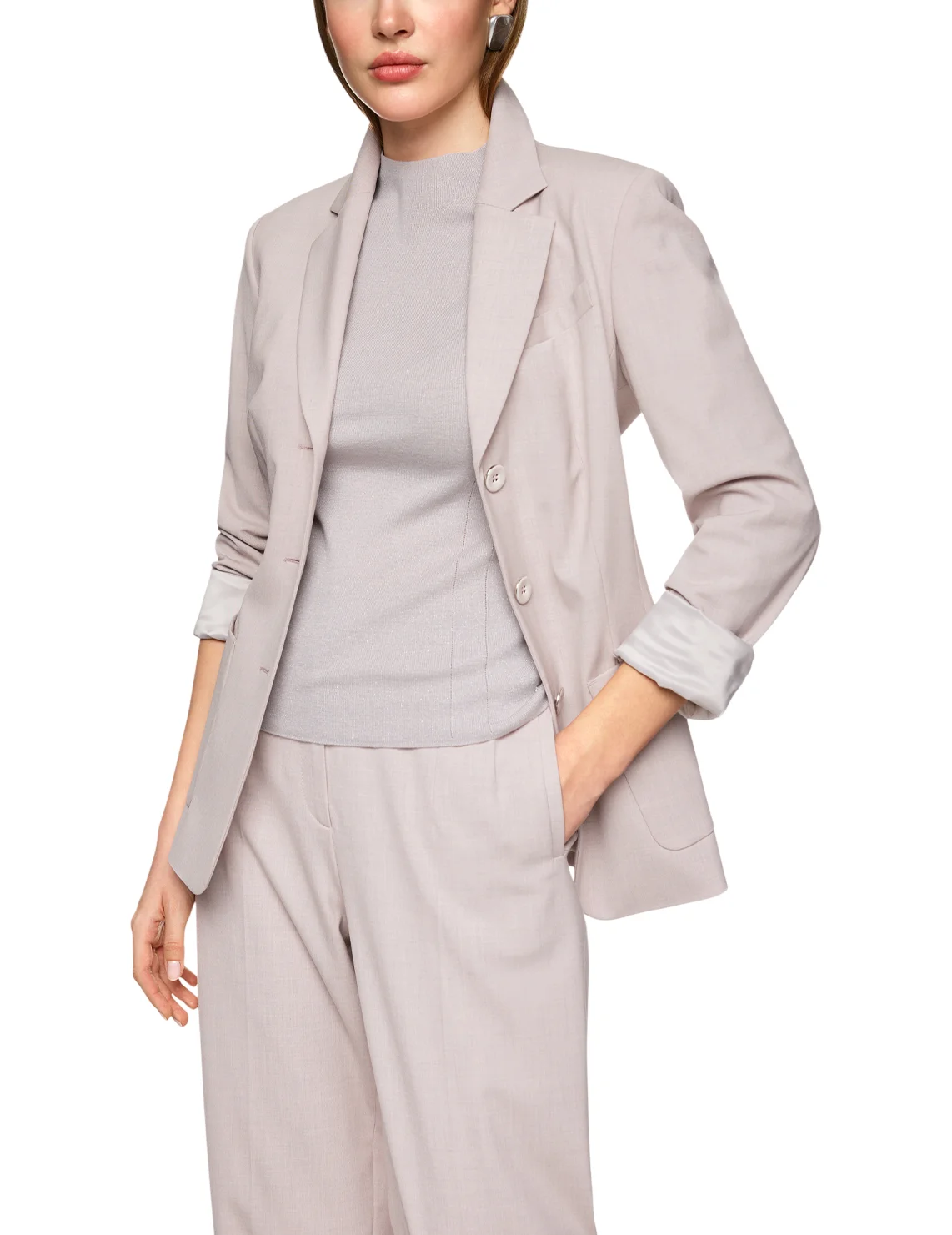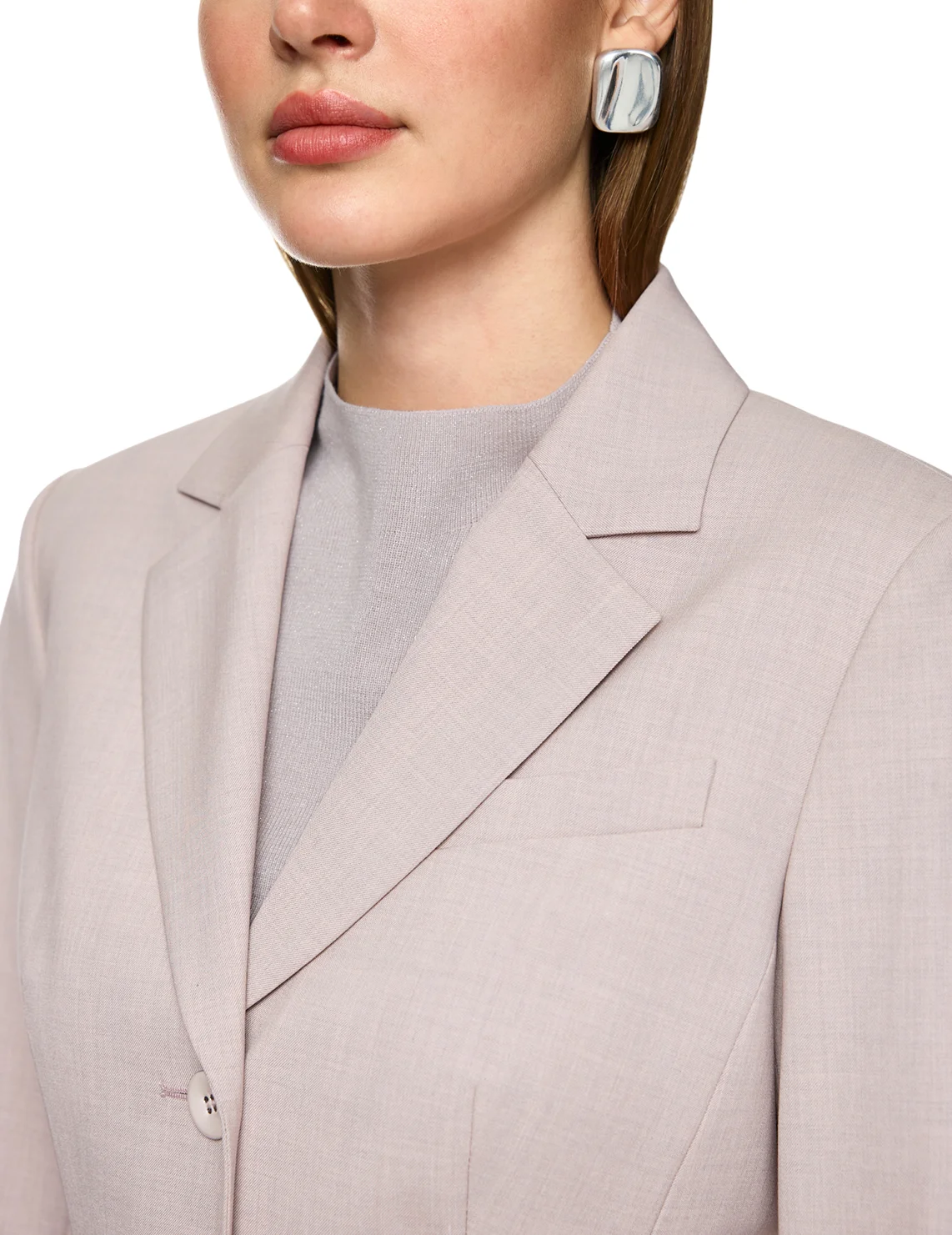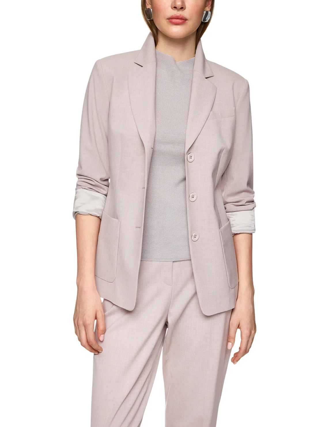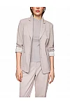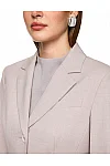 Однобортний піджак виготовлений з віскози, поліестеру та еластану. Модель виконана в прямому крої. Має відкладний комір з лацканами, нагрудну прорізну кишеню, передні накладні кишені та довгі рукави.