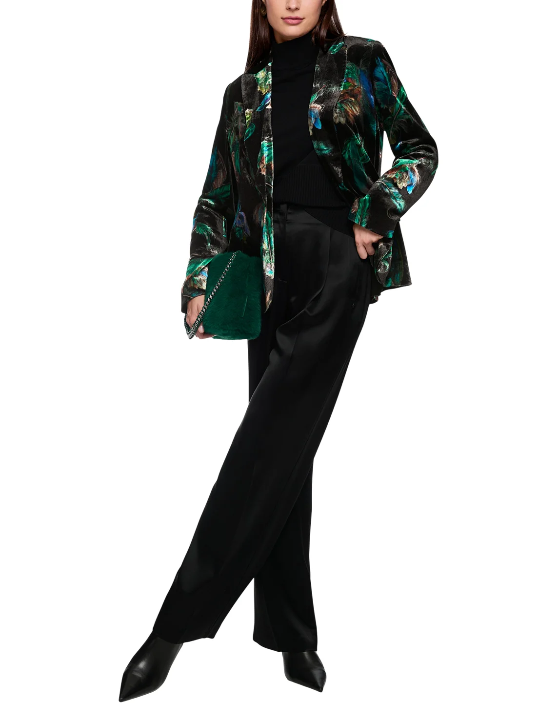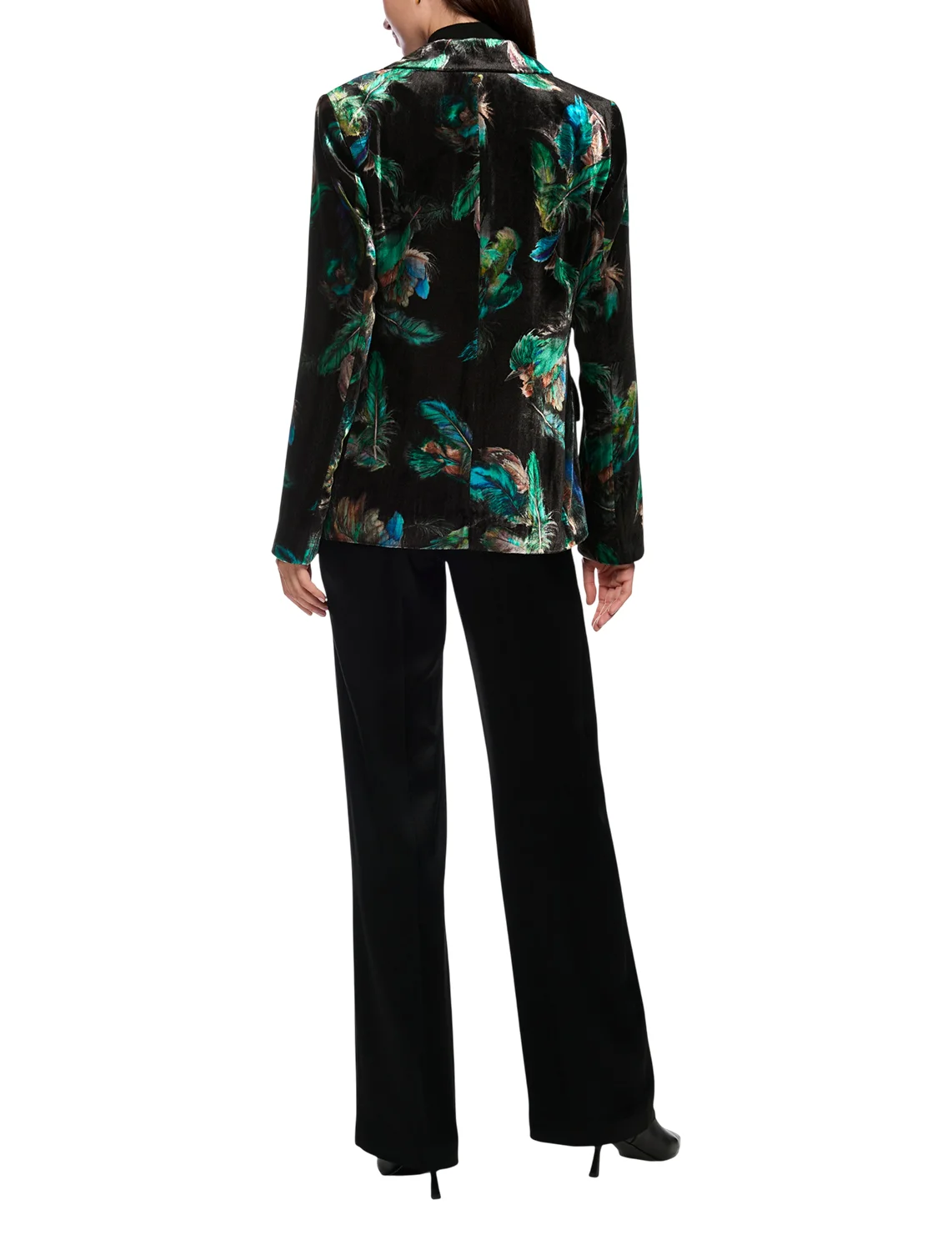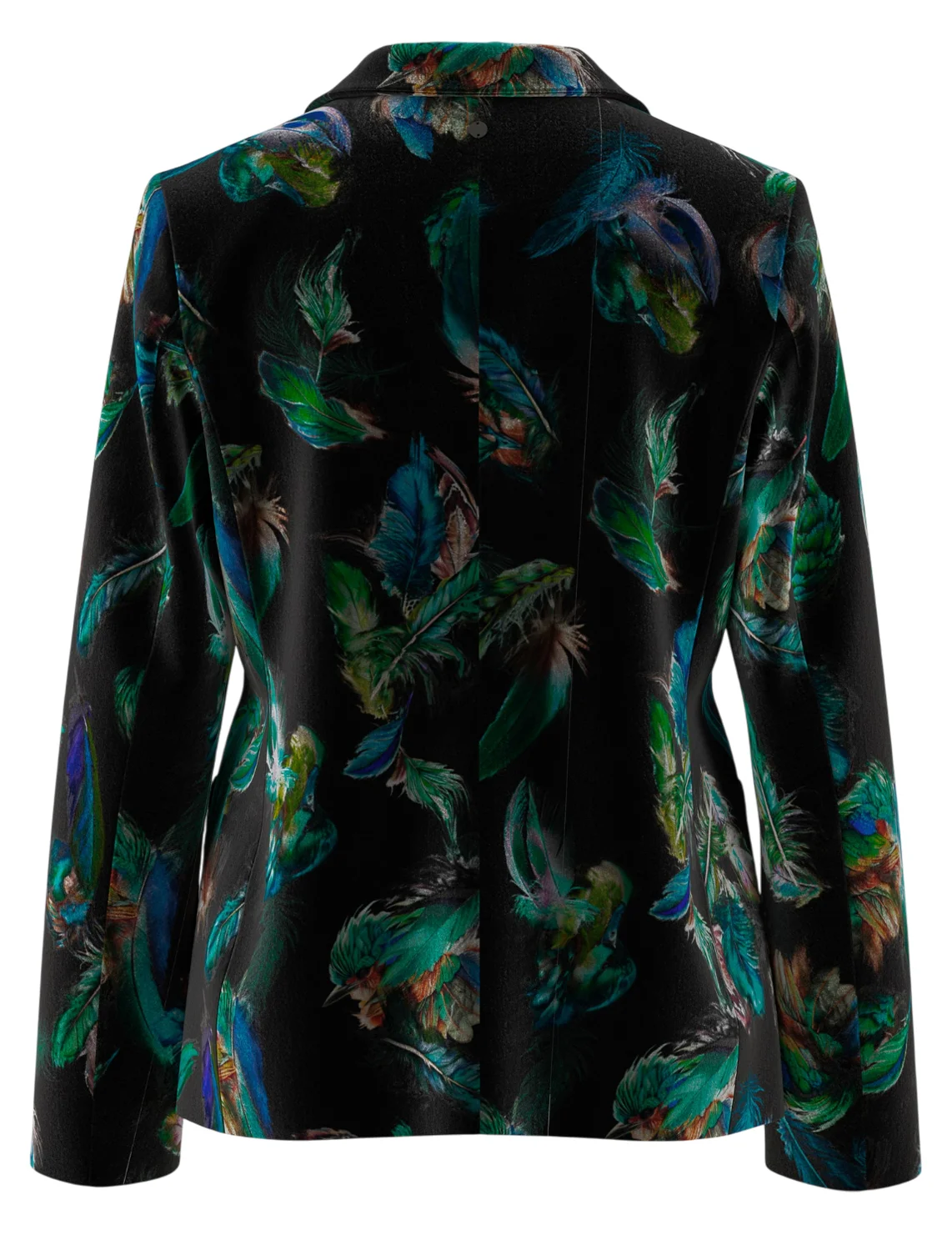 Однобортний піджак виготовлений з віскози та поліаміду, підкладка з поліестеру та еластану. Модель виконана в приталеному крої. Має відкладний комір з лацканами, передні прорізні кишені з клапанами та довгі рукави. Декорований оригінальним принтом.