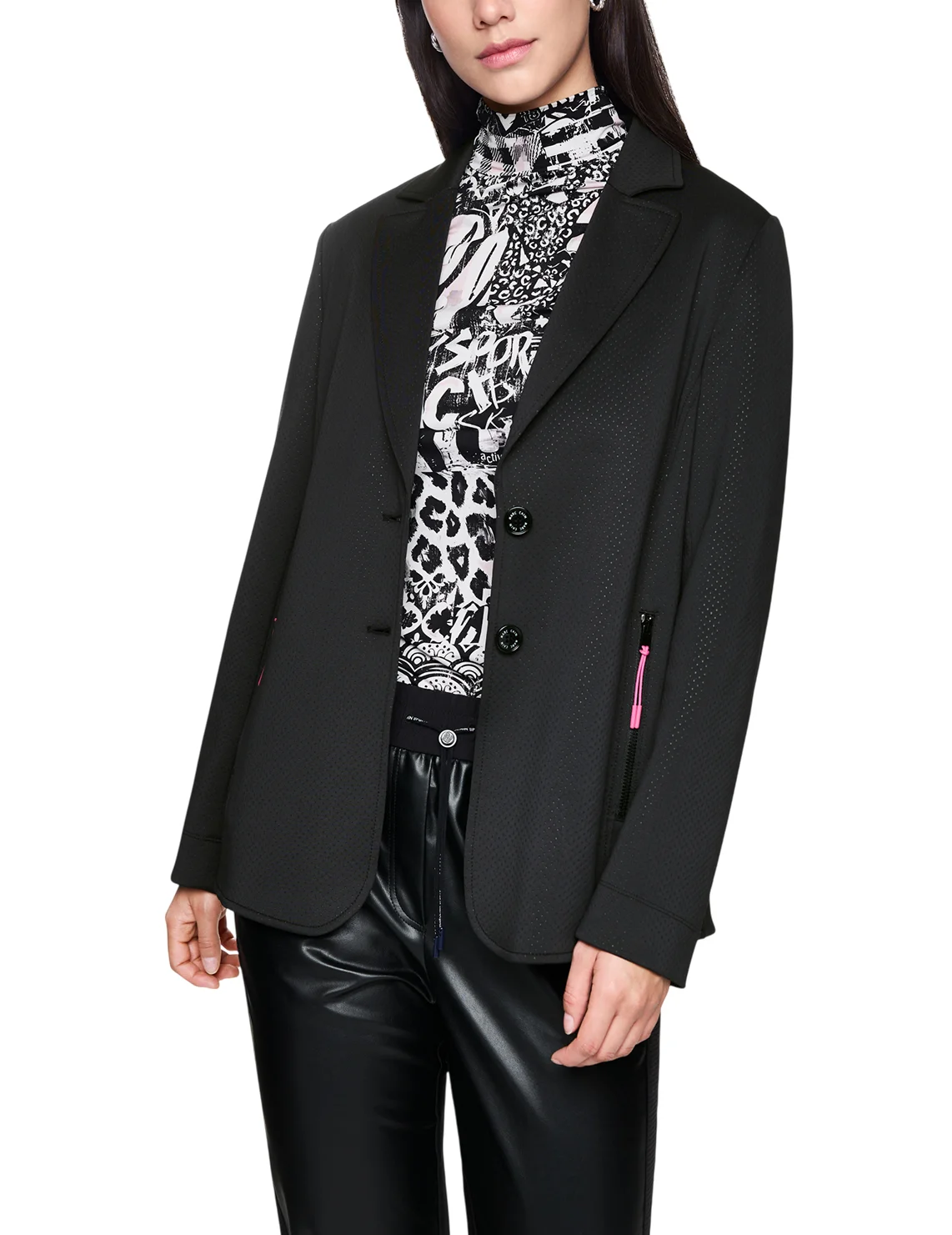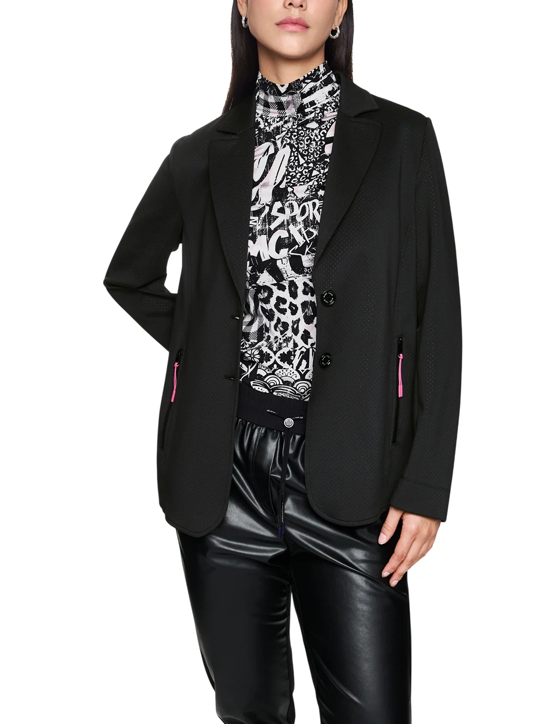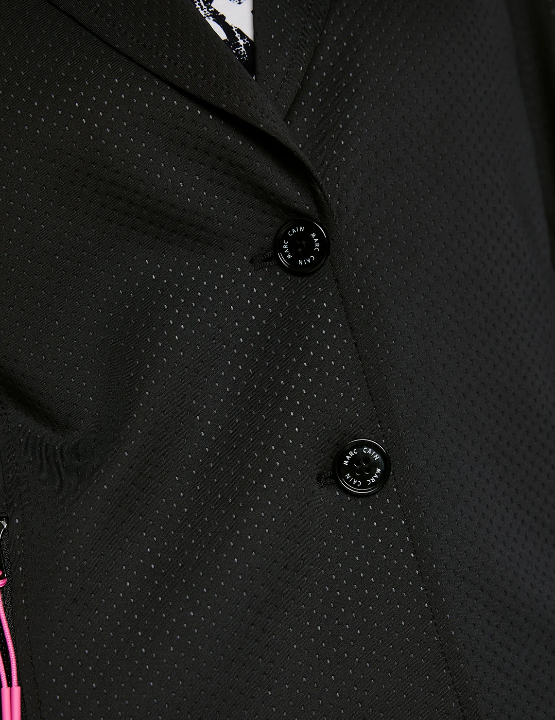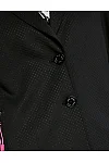 Однобортний піджак виготовлений з поліестеру та еластану. Модель виконана в приталеному крої. Має сітчасту структуру, відкладний комір з лацканами, бічні кишені з контрастними блискавками, довгі рукави з манжетами та застібку на ґудзиках.