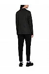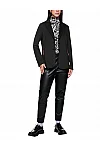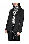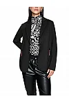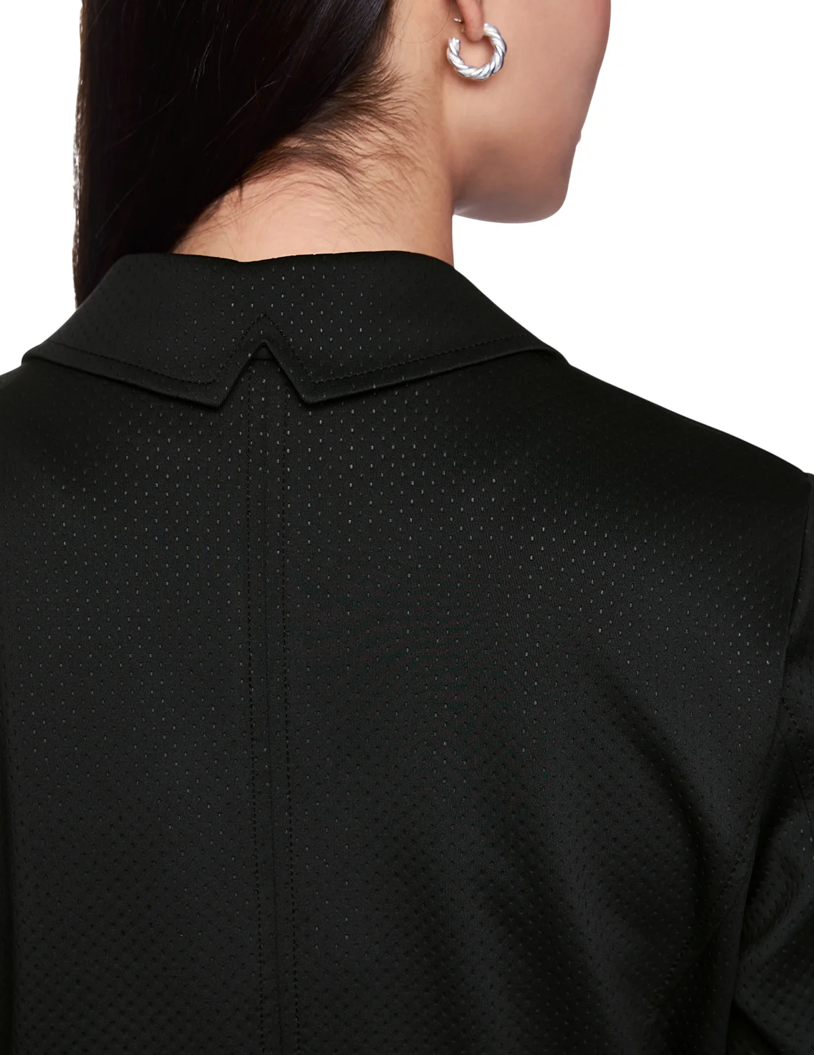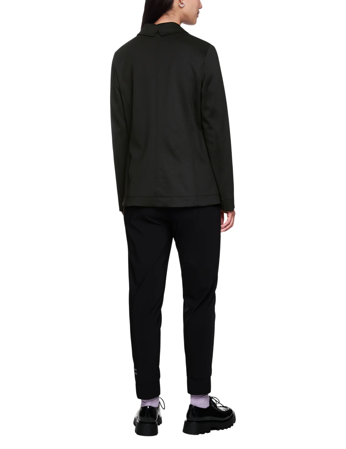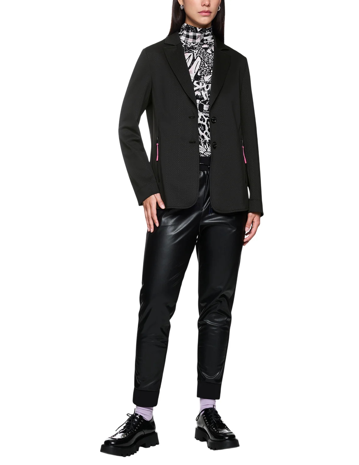 Однобортний піджак виготовлений з поліестеру та еластану. Модель виконана в приталеному крої. Має сітчасту структуру, відкладний комір з лацканами, бічні кишені з контрастними блискавками, довгі рукави з манжетами та застібку на ґудзиках.