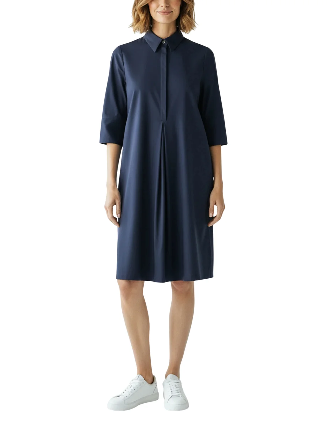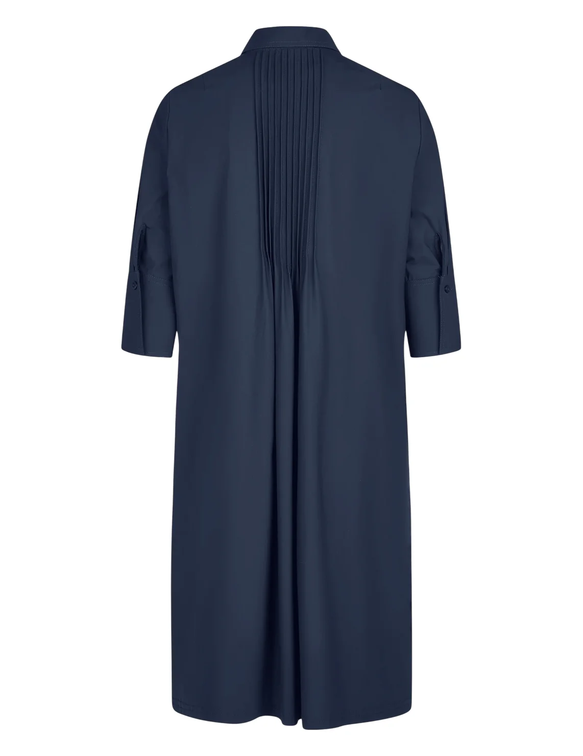 Сукня виготовлена з поліаміду й еластану. Модель довжини міді виконана в розкльошеному крої. Має відкладний комір, приховану планку на ґудзиках, складки ззаду, прорізні бокові кишені та рукави довжиною 3/4 з манжетами.