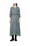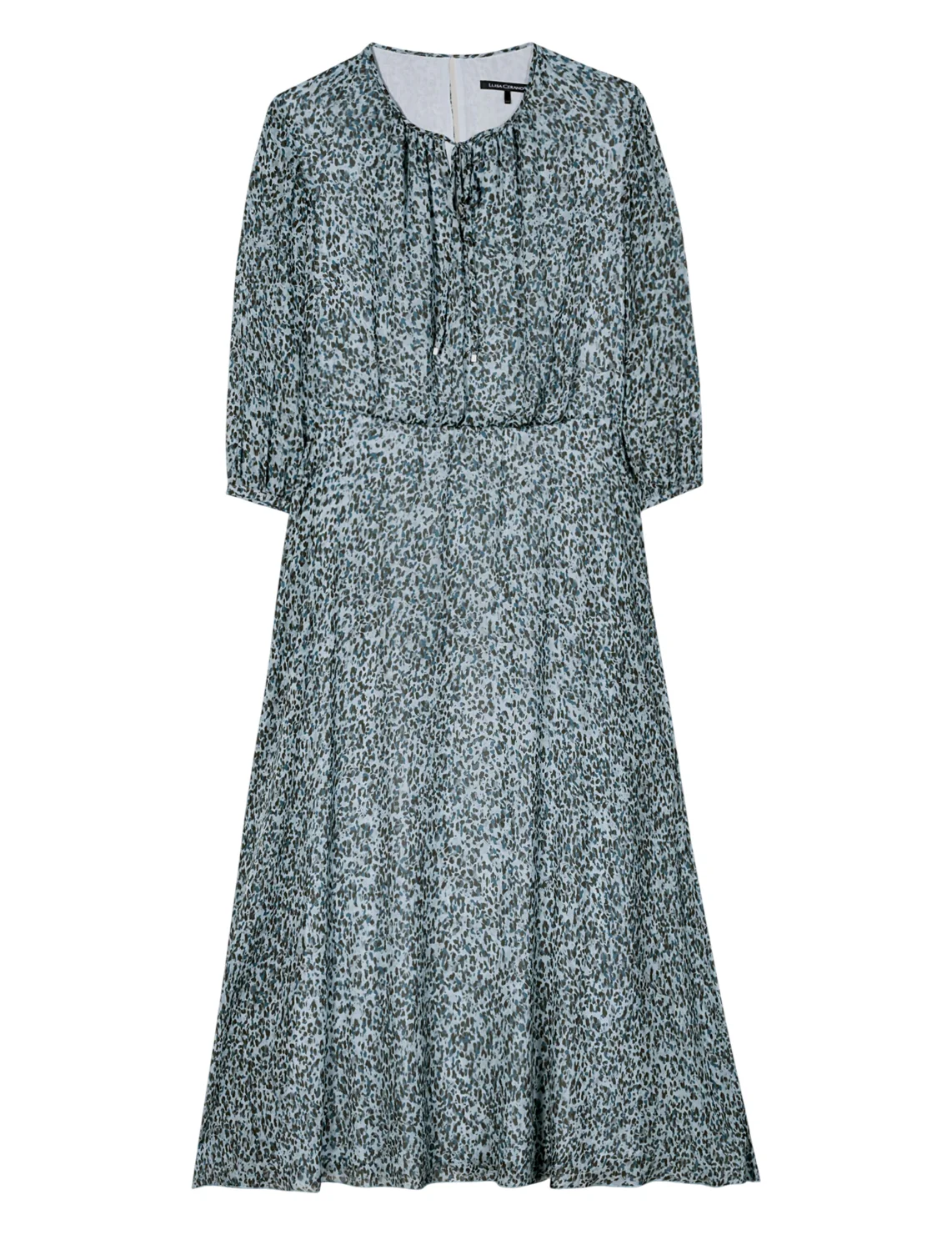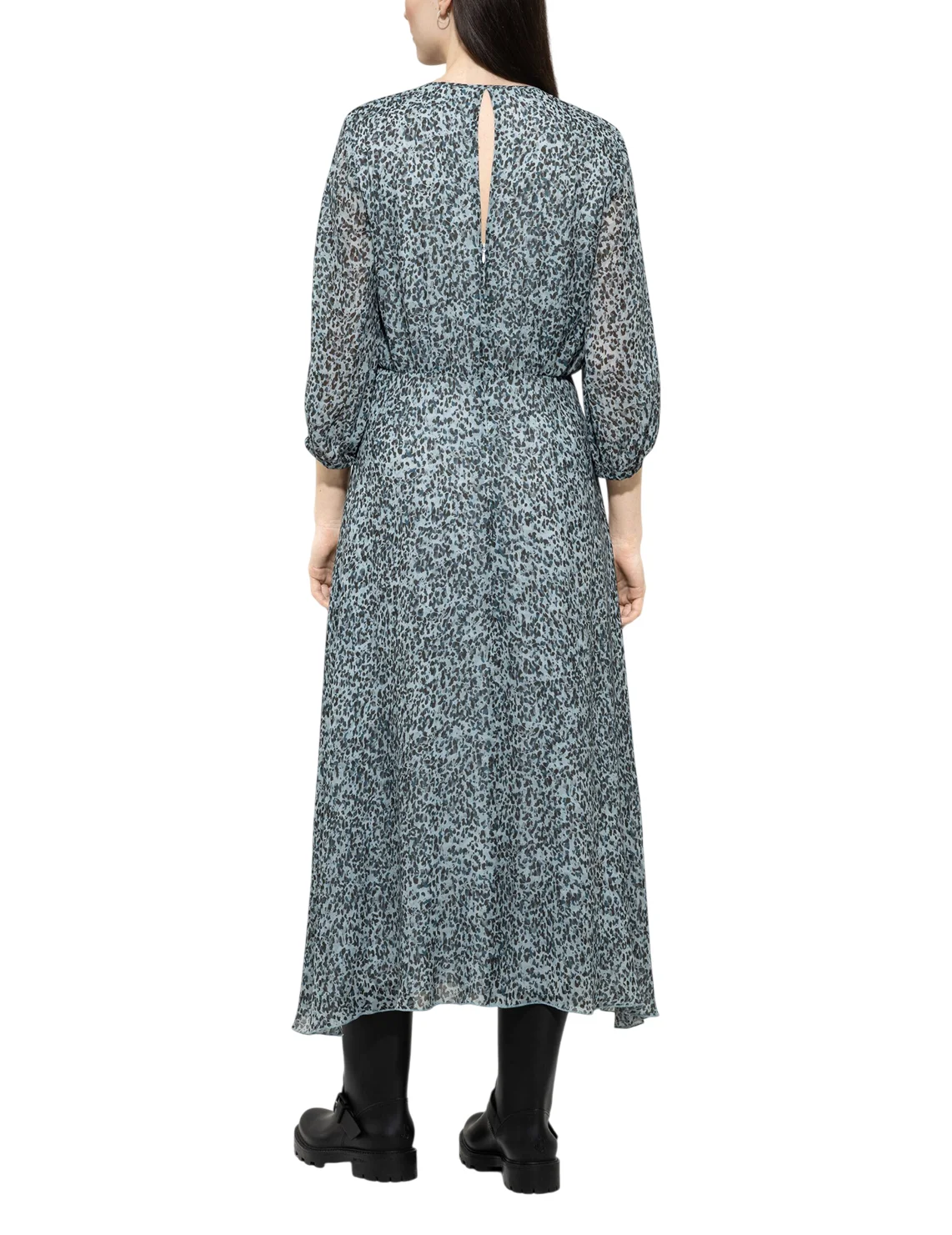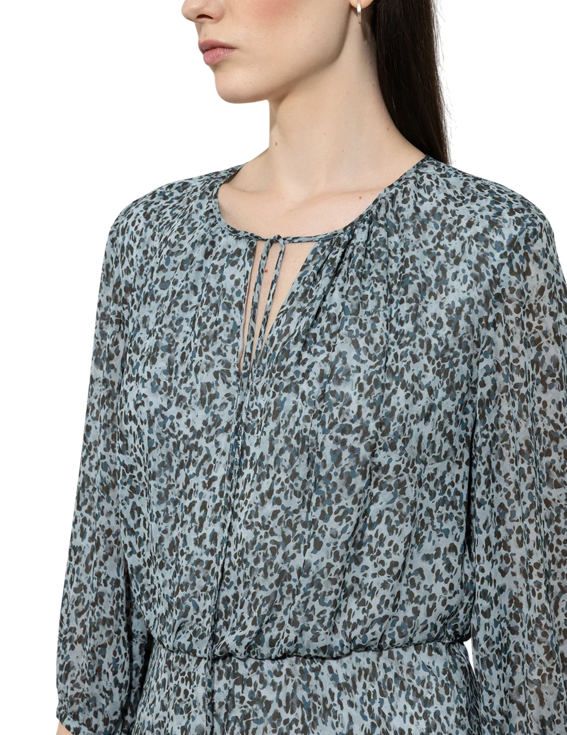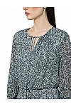 Сукня виготовлена з віскози високої якості. Модель довжини міді виконана в розкльошеному крої. Має V-подібний виріз горловини, декоративні зав'язки спереду, гудзик ззаду та рукави 3/4 з манжетами. Декорована анімалістичним принтом.