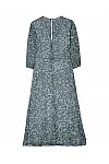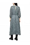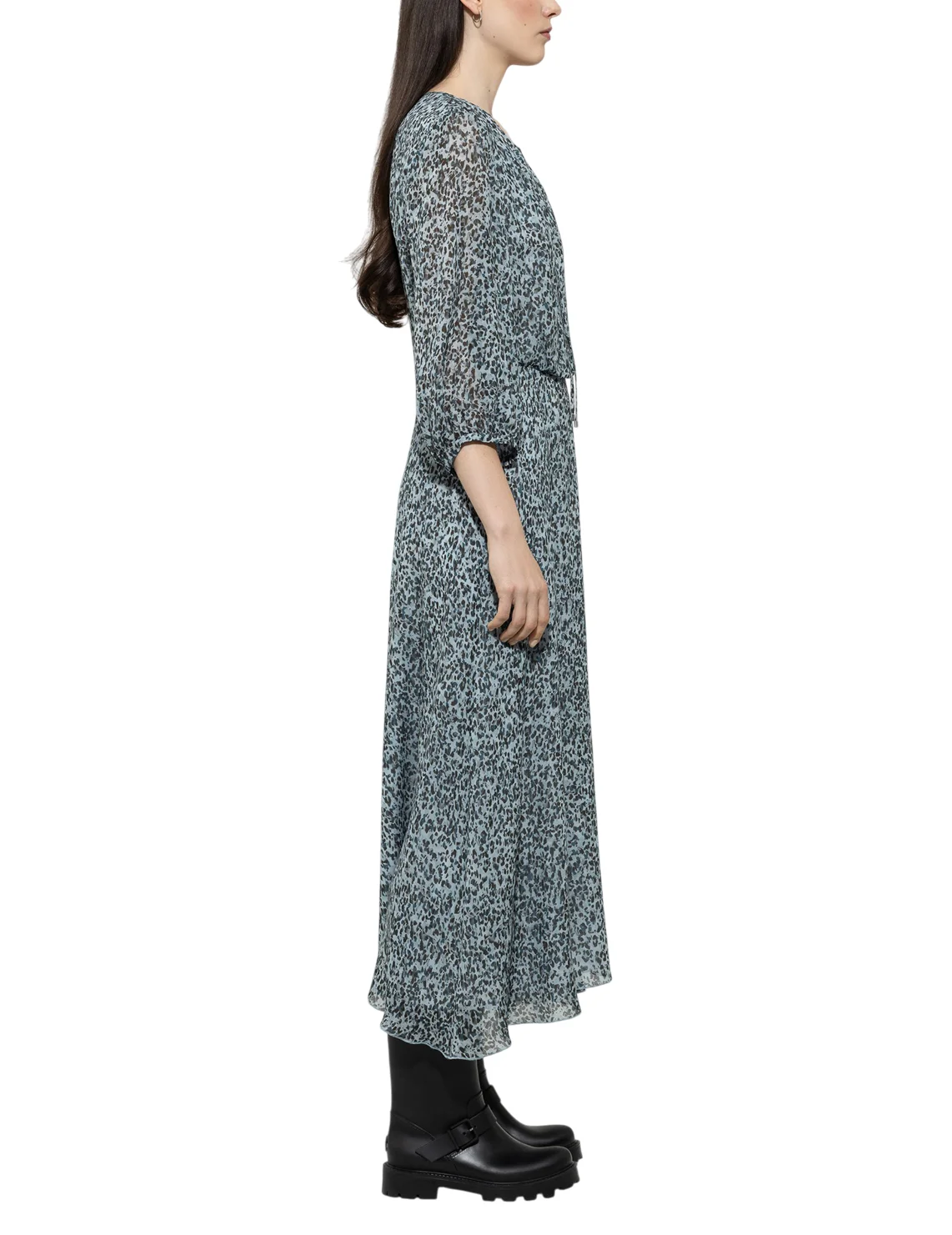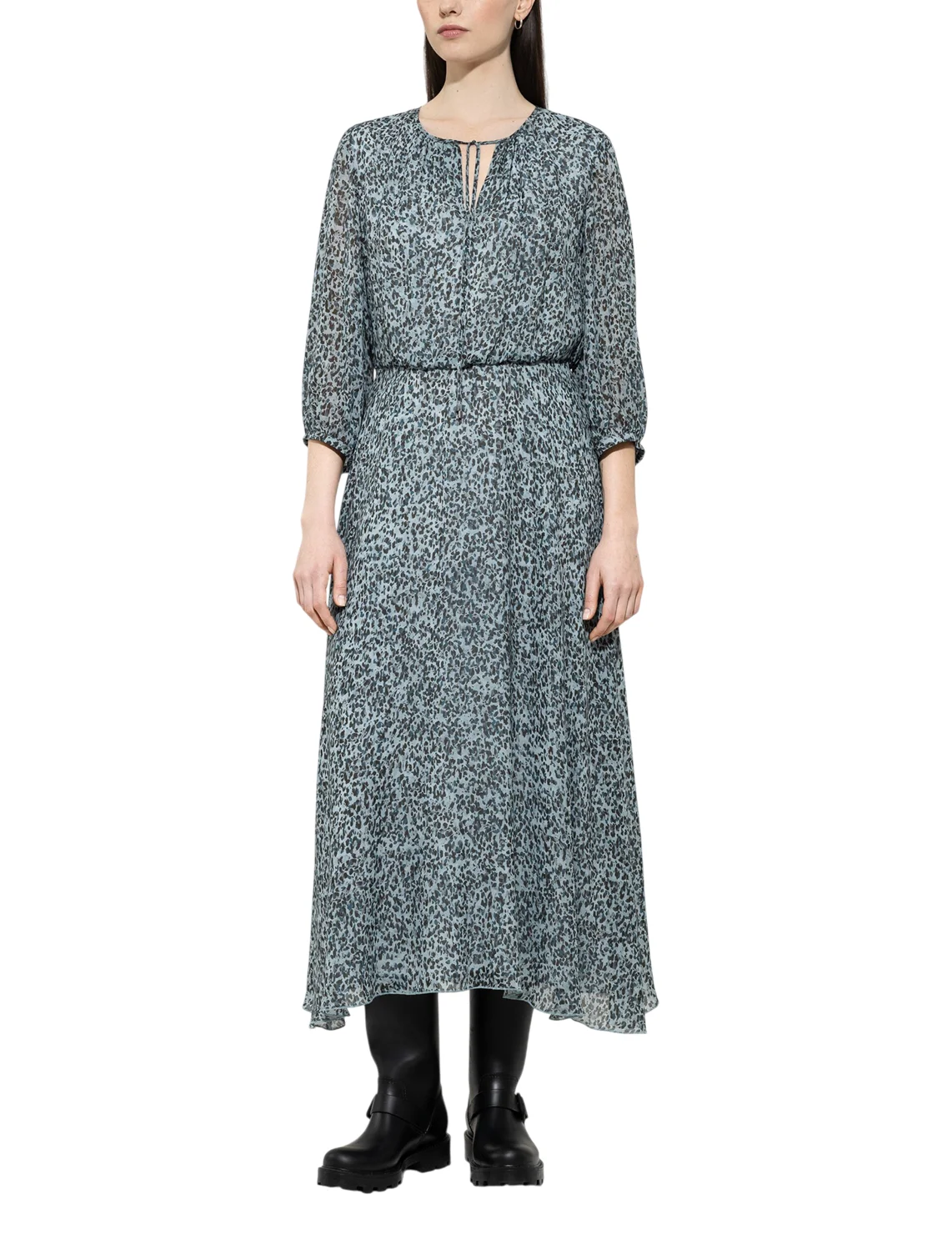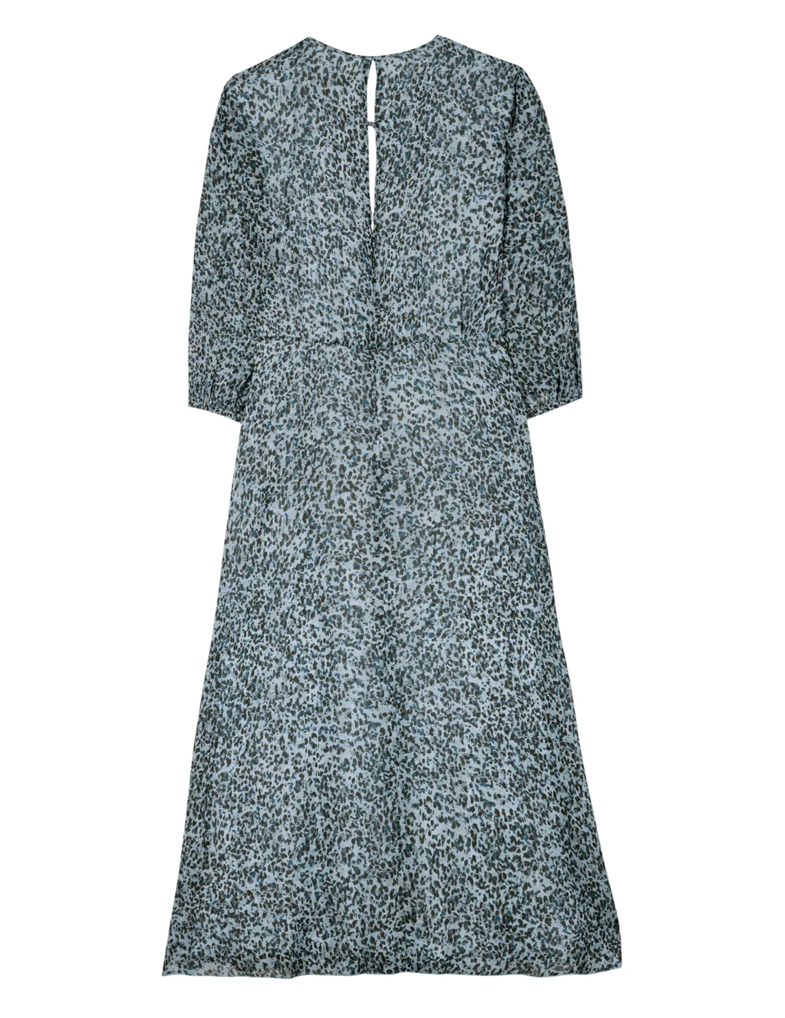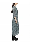 Сукня виготовлена з віскози високої якості. Модель довжини міді виконана в розкльошеному крої. Має V-подібний виріз горловини, декоративні зав'язки спереду, гудзик ззаду та рукави 3/4 з манжетами. Декорована анімалістичним принтом.