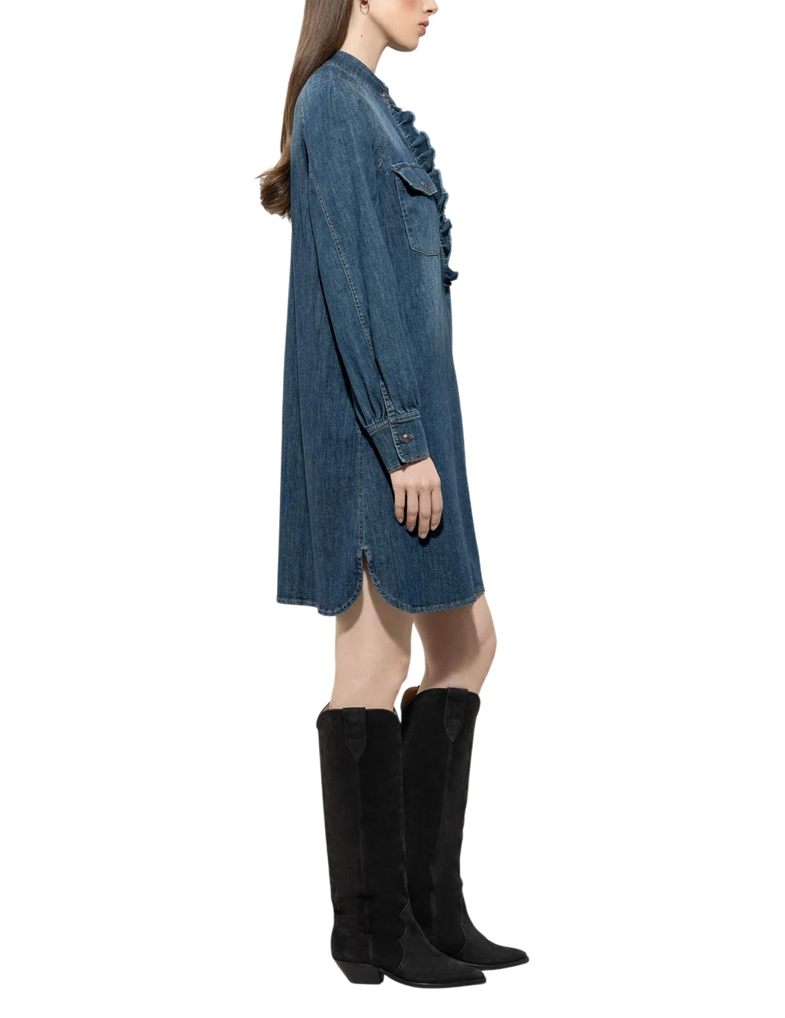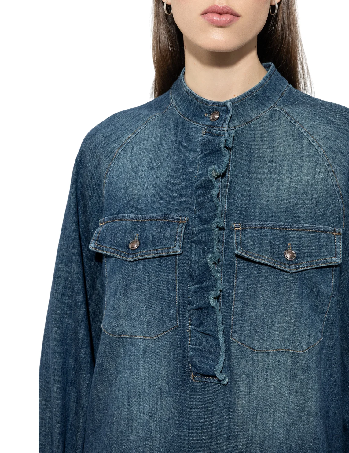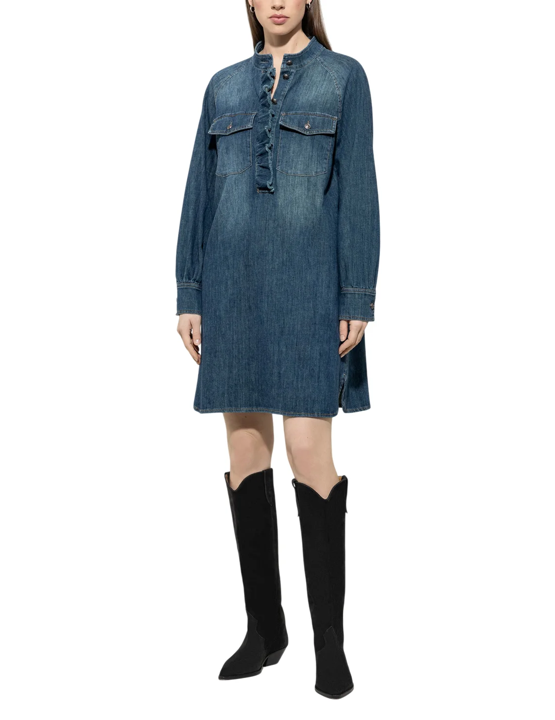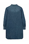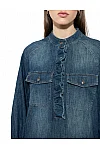 Сукня виготовлена з бавовни та еластану. Модель довжини міні виконана в вільному крої. Має виріз-стійку, планку з гудзиками та рюшами, довгі рукави з манжетами, дві передні накладні кишені з клапанами та бічні розрізи знизу.