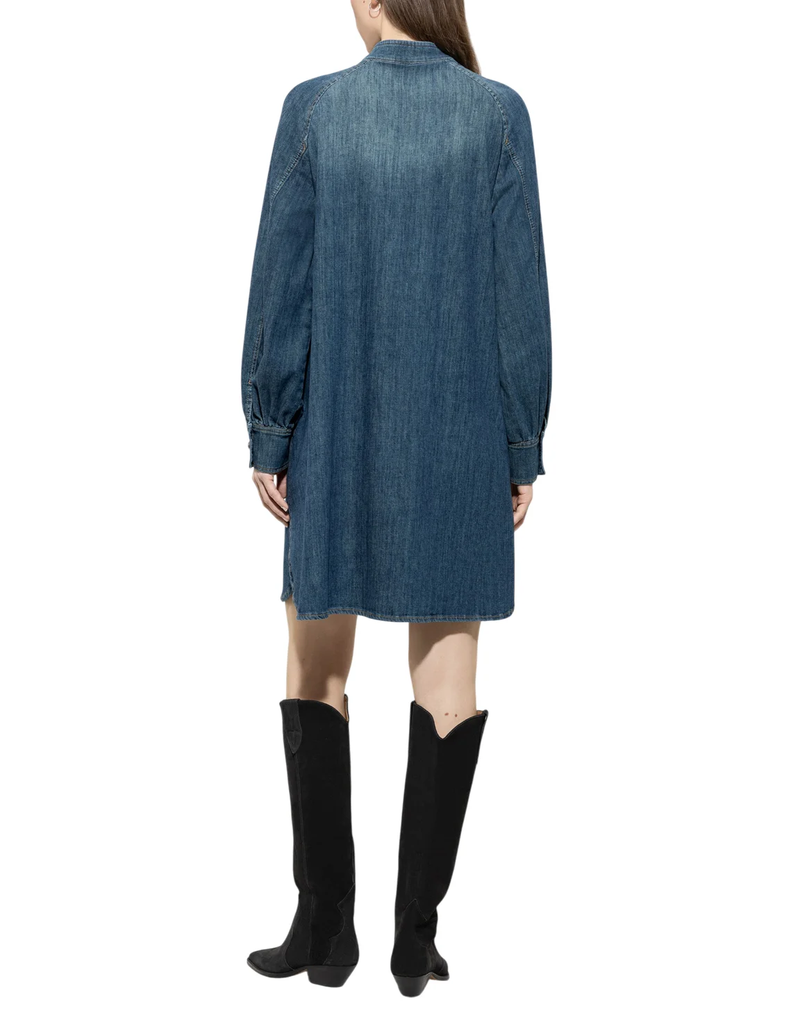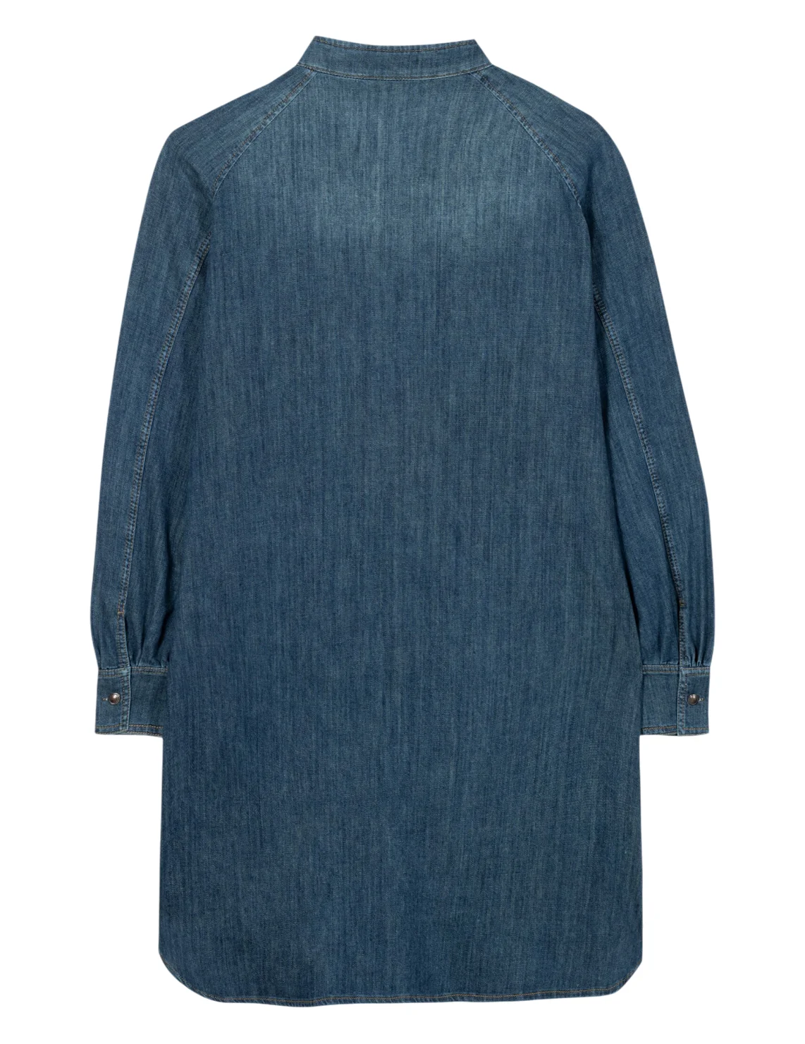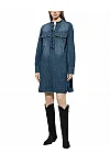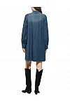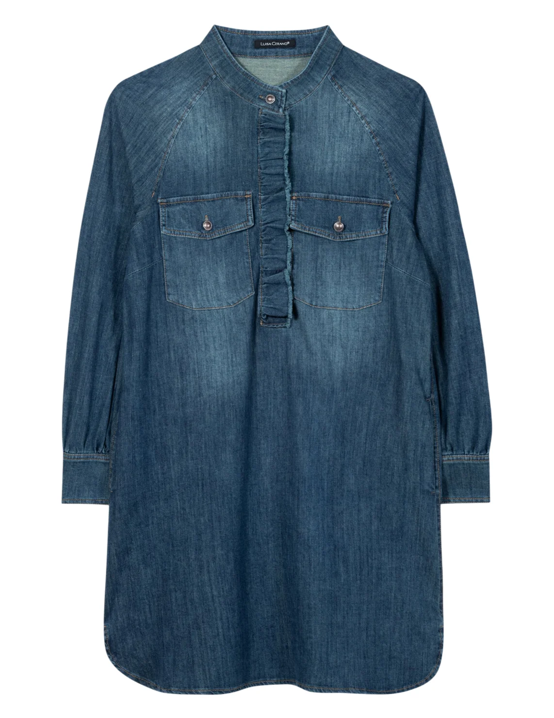 Сукня виготовлена з бавовни та еластану. Модель довжини міні виконана в вільному крої. Має виріз-стійку, планку з гудзиками та рюшами, довгі рукави з манжетами, дві передні накладні кишені з клапанами та бічні розрізи знизу.