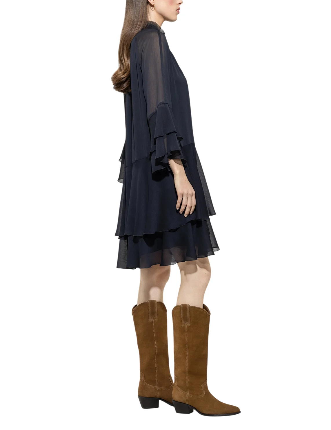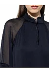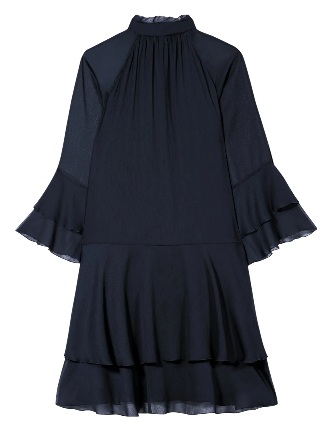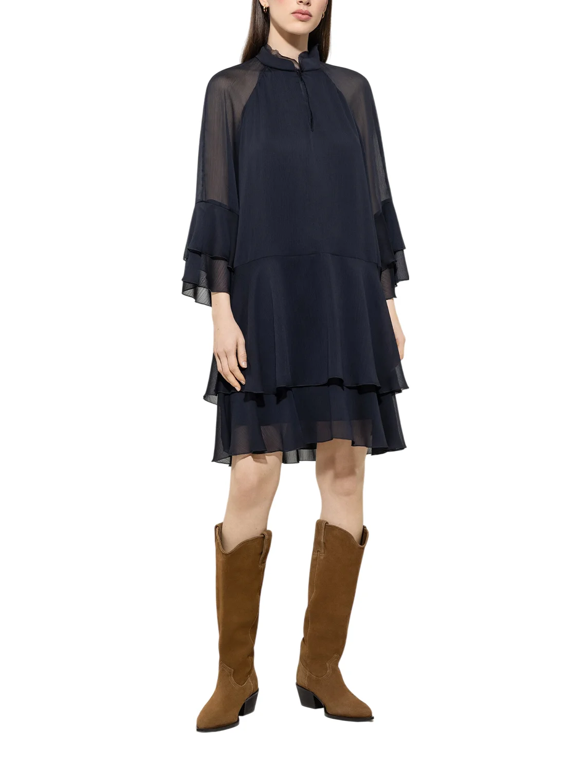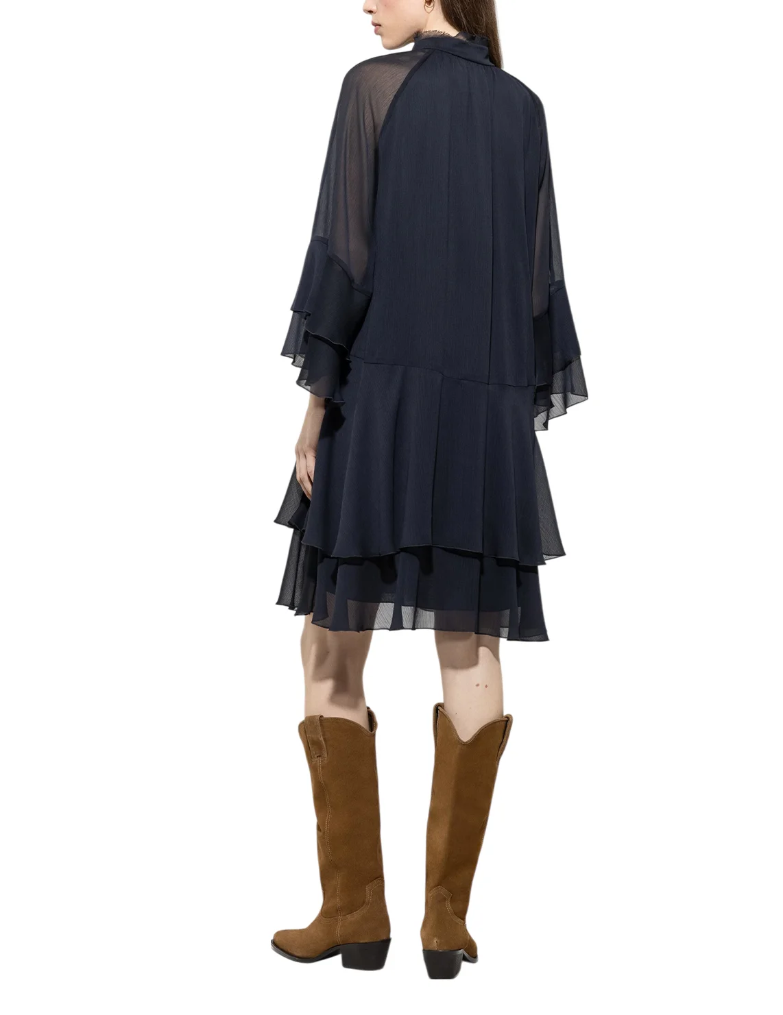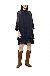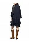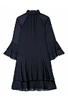 Сукня виготовлена зі 100% поліестеру, підкладка з віскози. Модель довжини міді виконана в розкльошеному крої. Має комір-стійку, напівпрозорі рукави довжиною 3/4 і застібку на ґудзик. Декорована воланами.